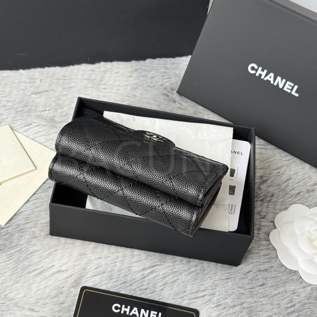 카프스킨의 질감이 돋보이는 샤넬 트리폴드 반지갑입니다.