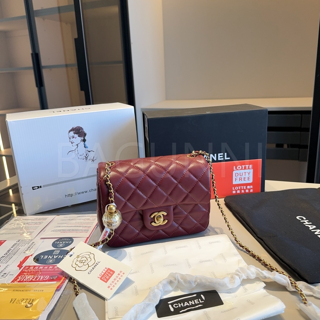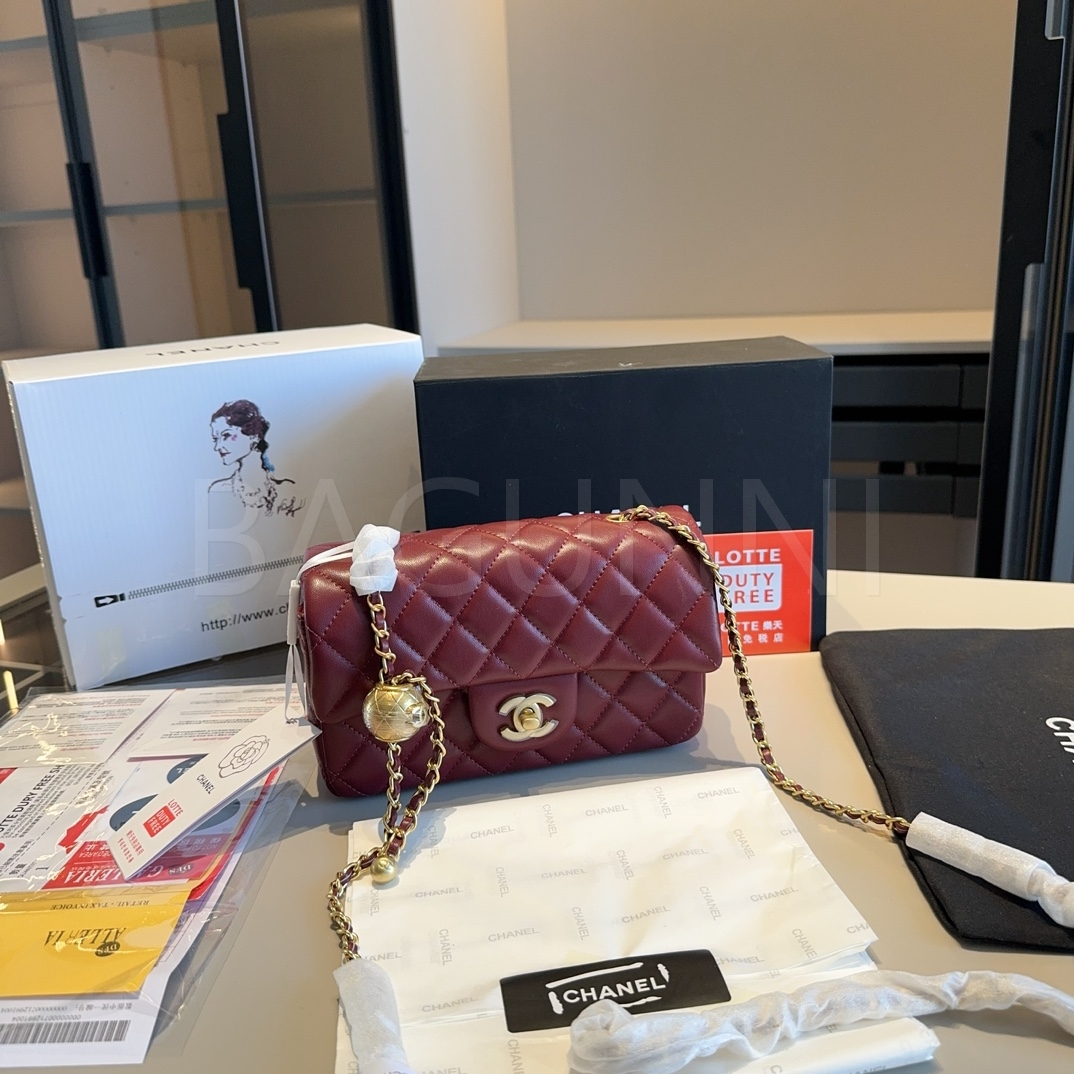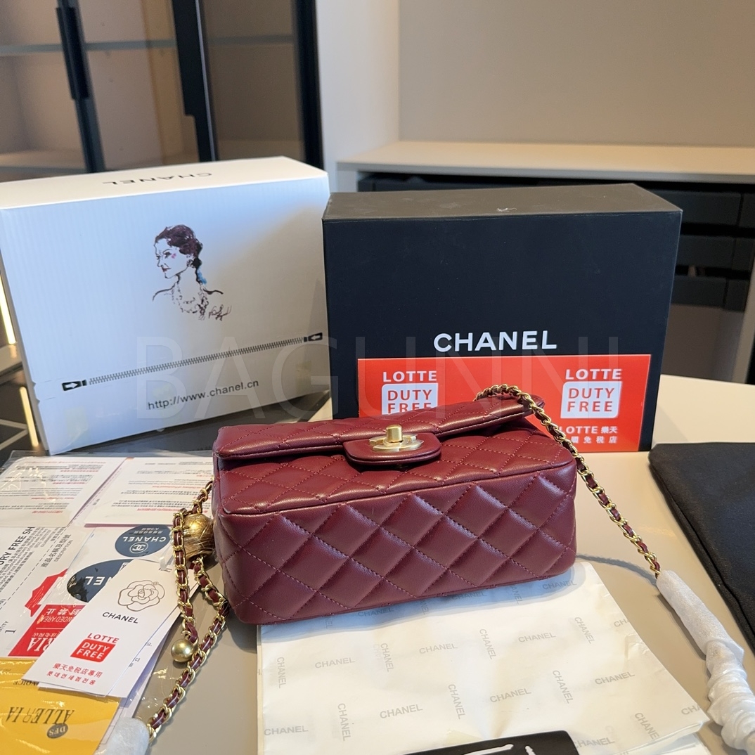 램스킨 특유의 매력이 돋보이는 샤넬 금볼 스퀘어 플랩 백입니다.