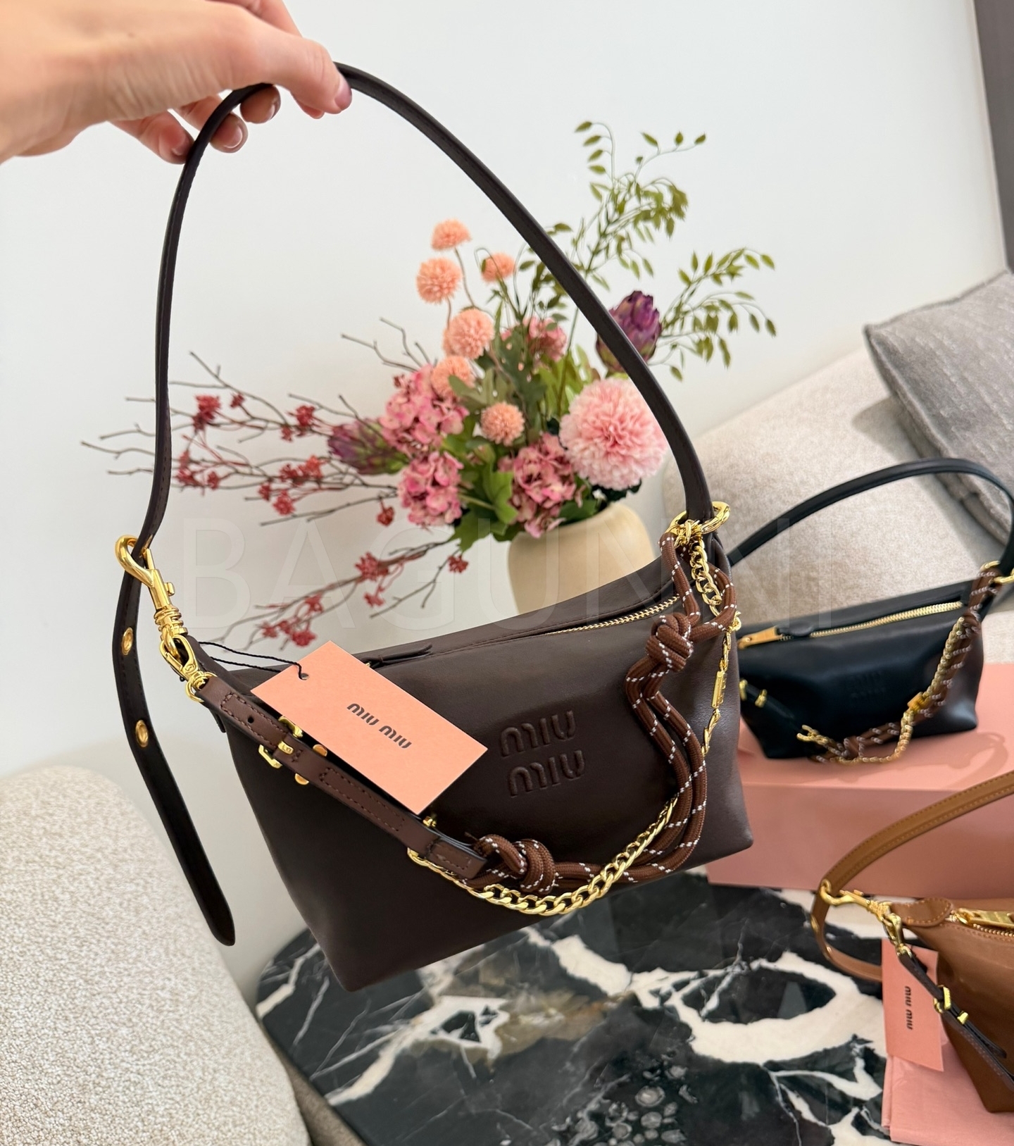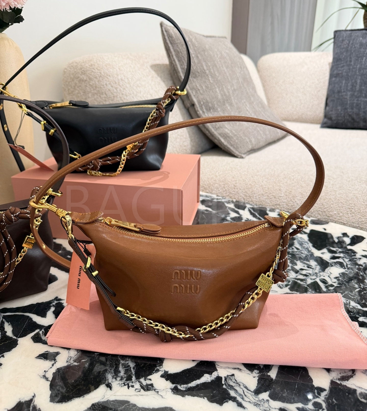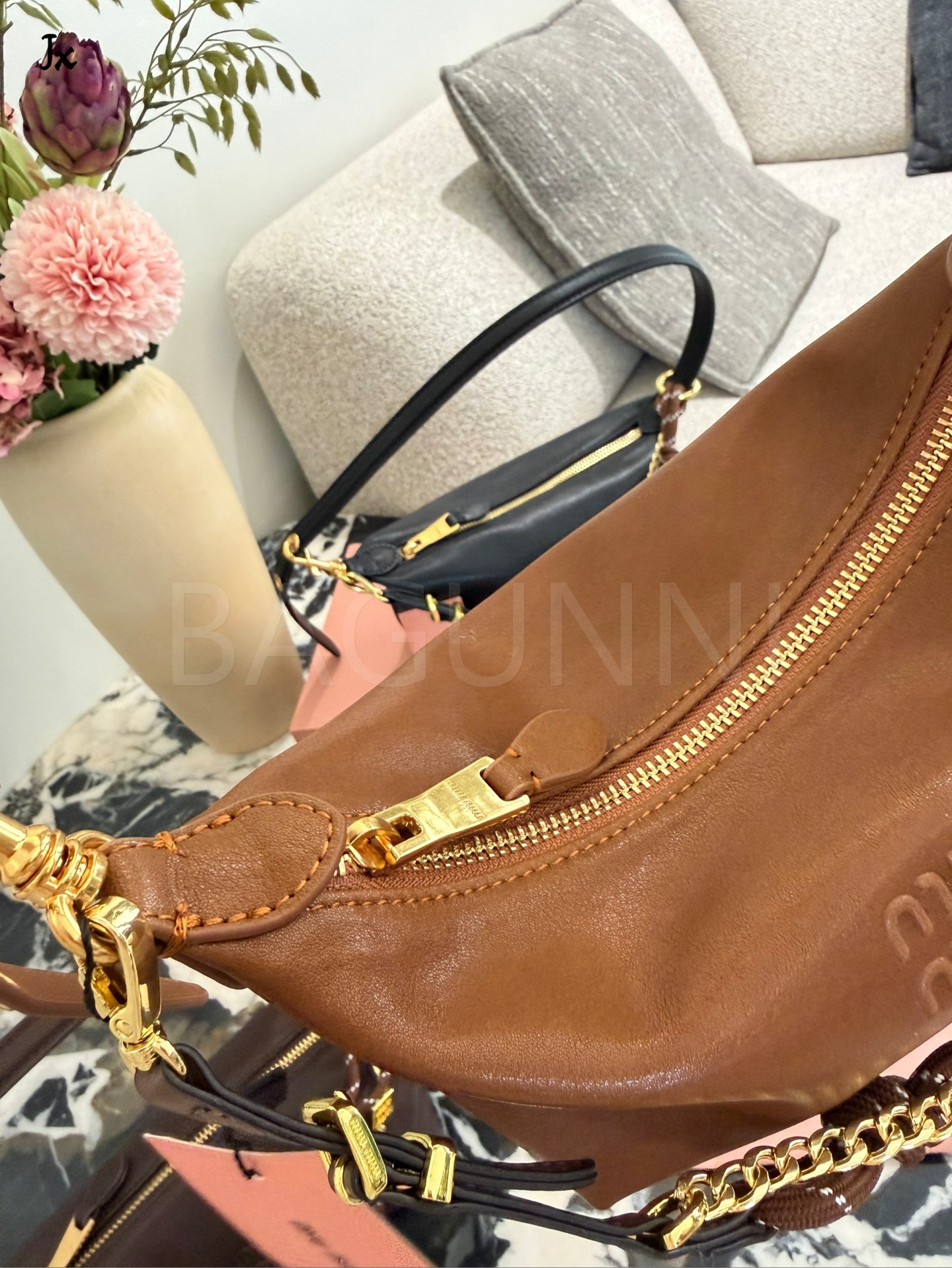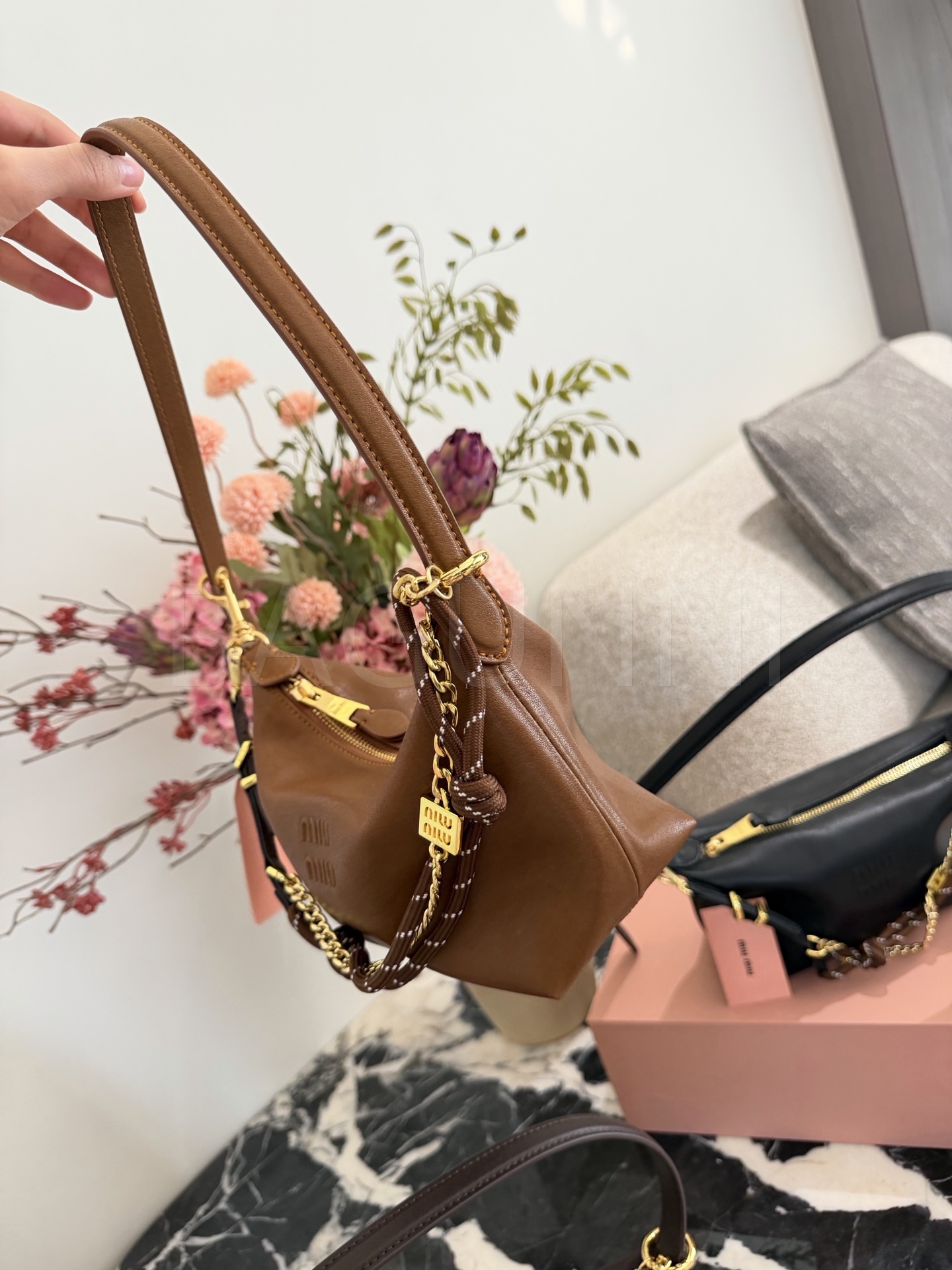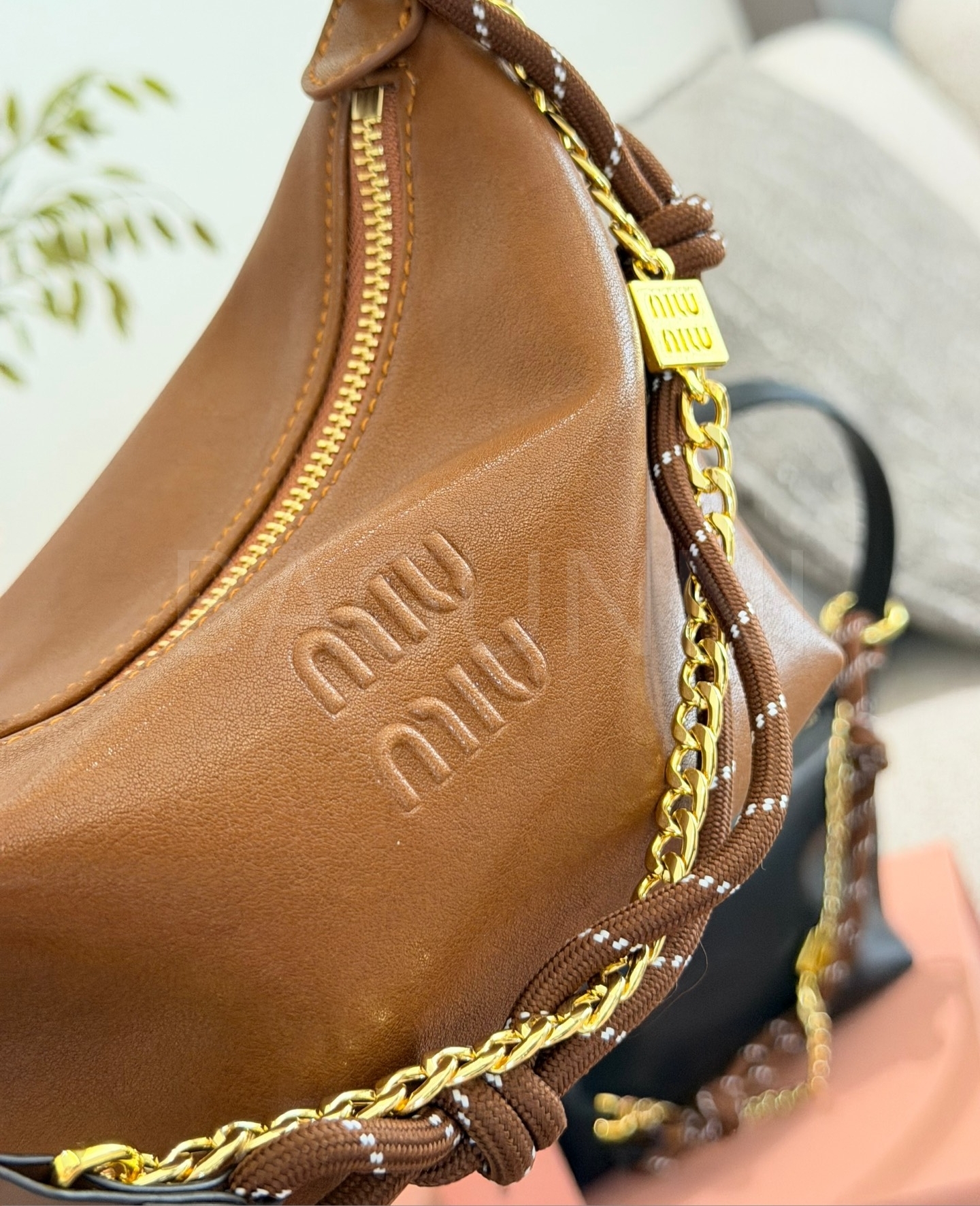 미우미우 나파 레더 박스 숄더백입니다. 램스킨 특유의 질감이 자연스럽게 살아 있으며 브라운, 카라멜 브라운 톤이 어우러져 브랜드 특유의 분위기를 편하게 즐기기 좋습니다.