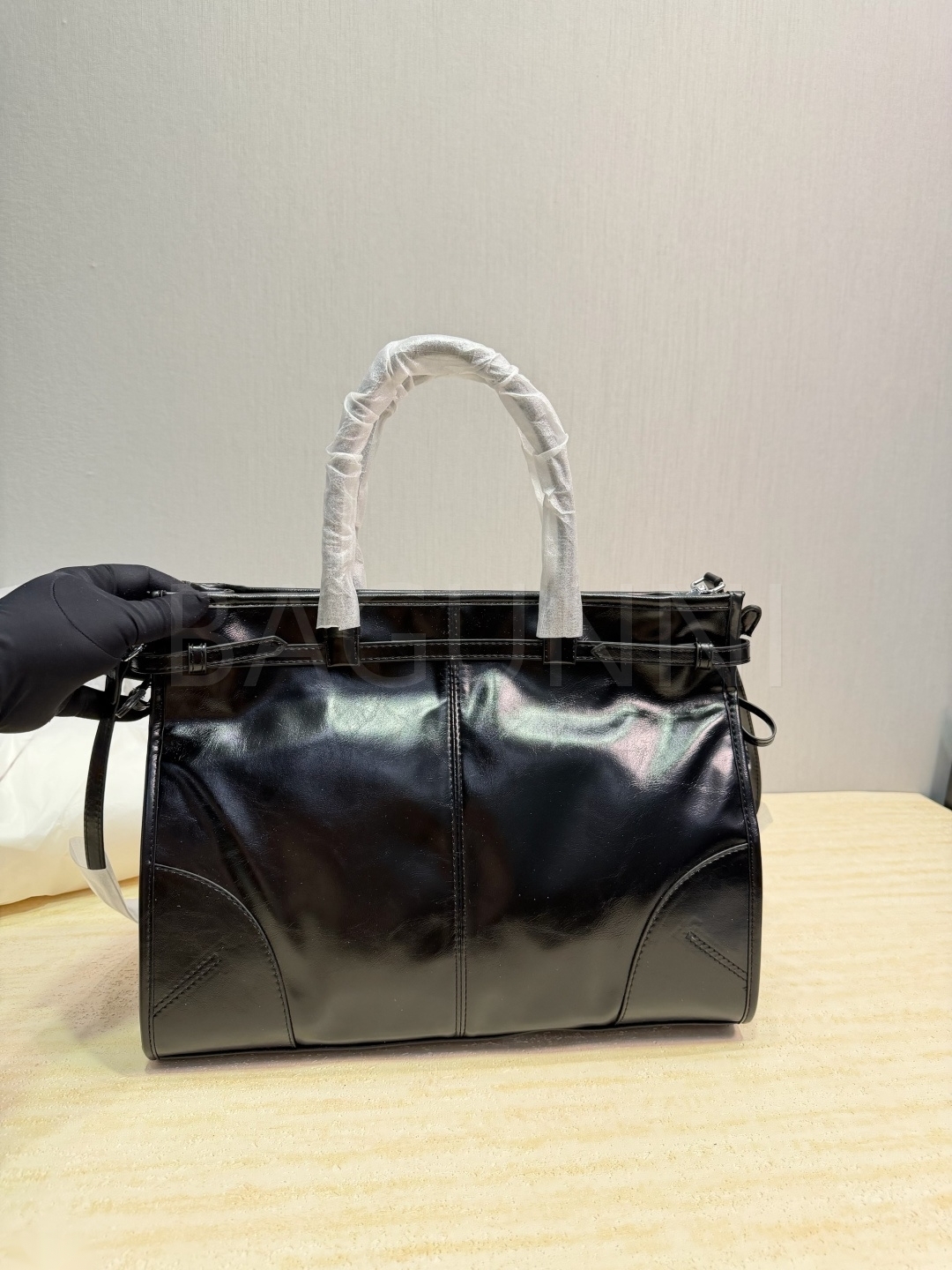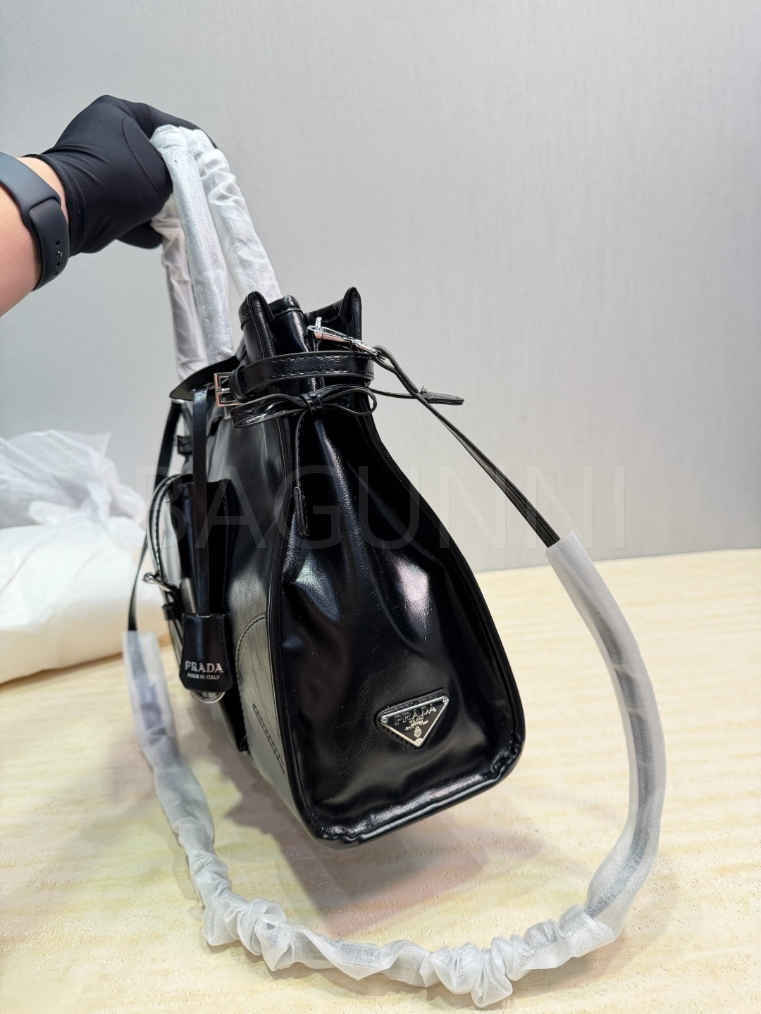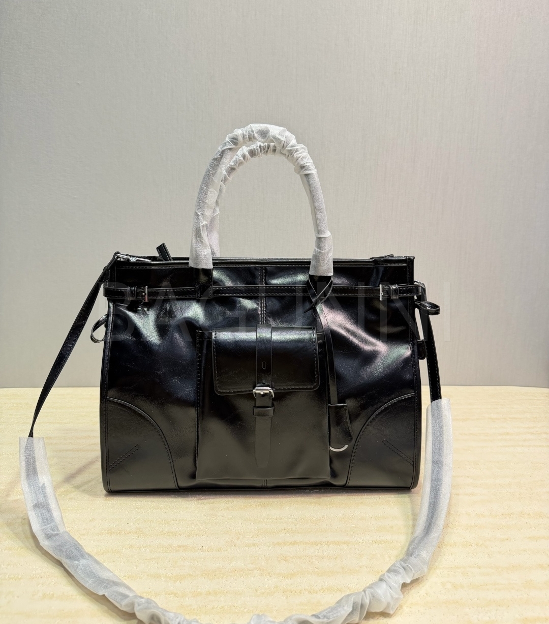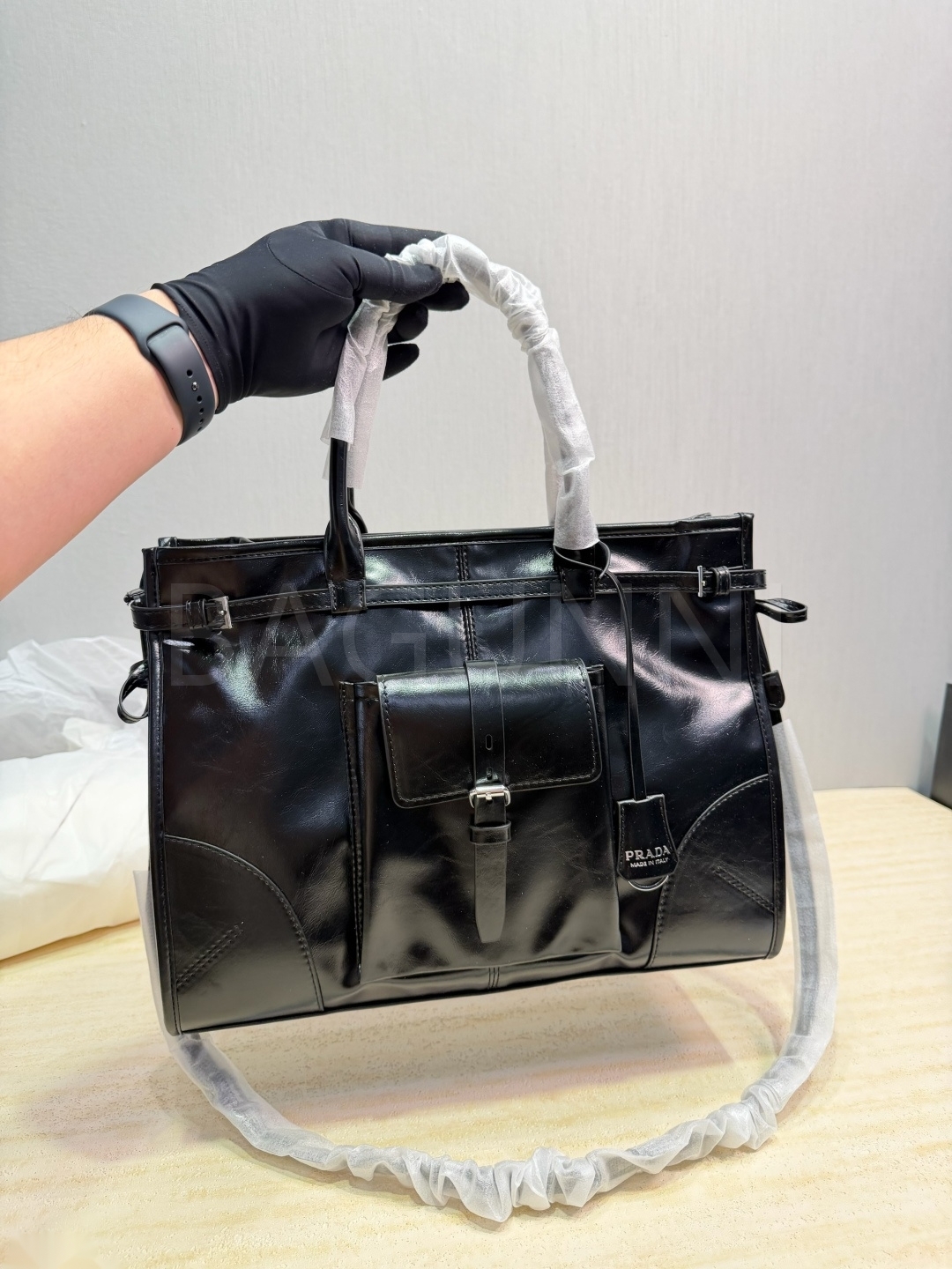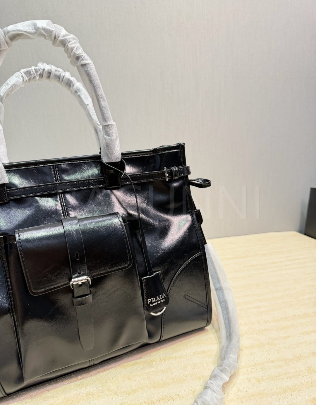 프라다 페이턴트 레더 토트백입니다. 가죽 특유의 질감이 자연스럽게 살아 있으며 블랙 톤이 어우러져 브랜드 특유의 분위기를 편하게 즐기기 좋습니다.