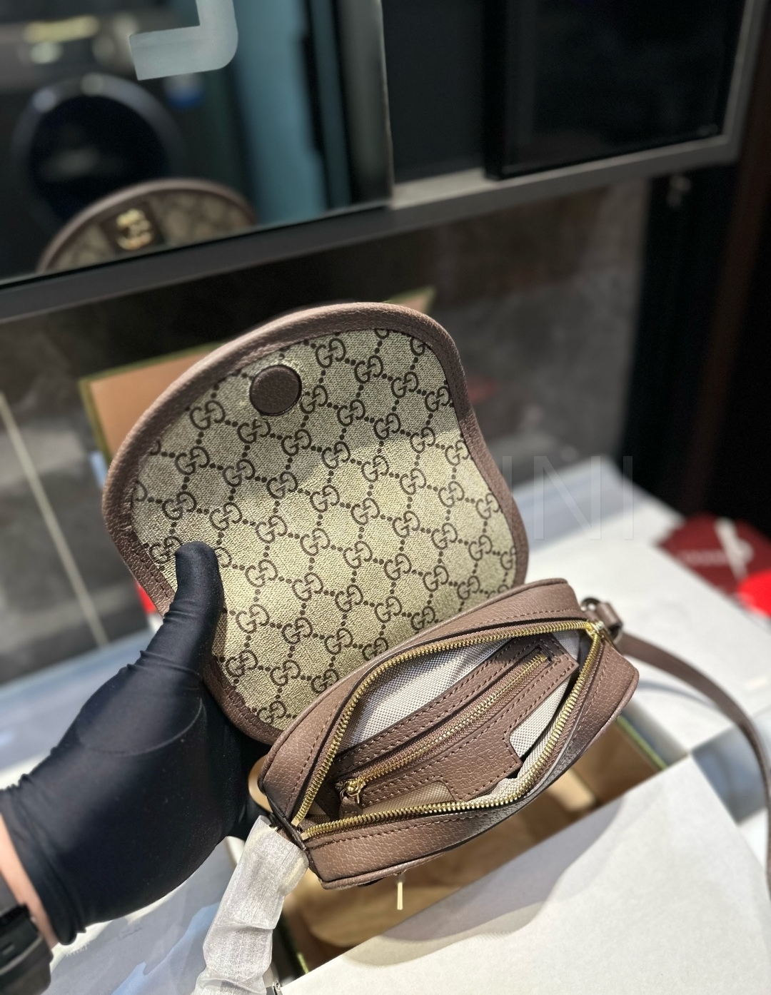 구찌 오피디아 메신저백입니다. 가죽 특유의 질감이 자연스럽게 살아 있으며 브랜드 특유의 분위기를 편하게 즐기기 좋습니다.