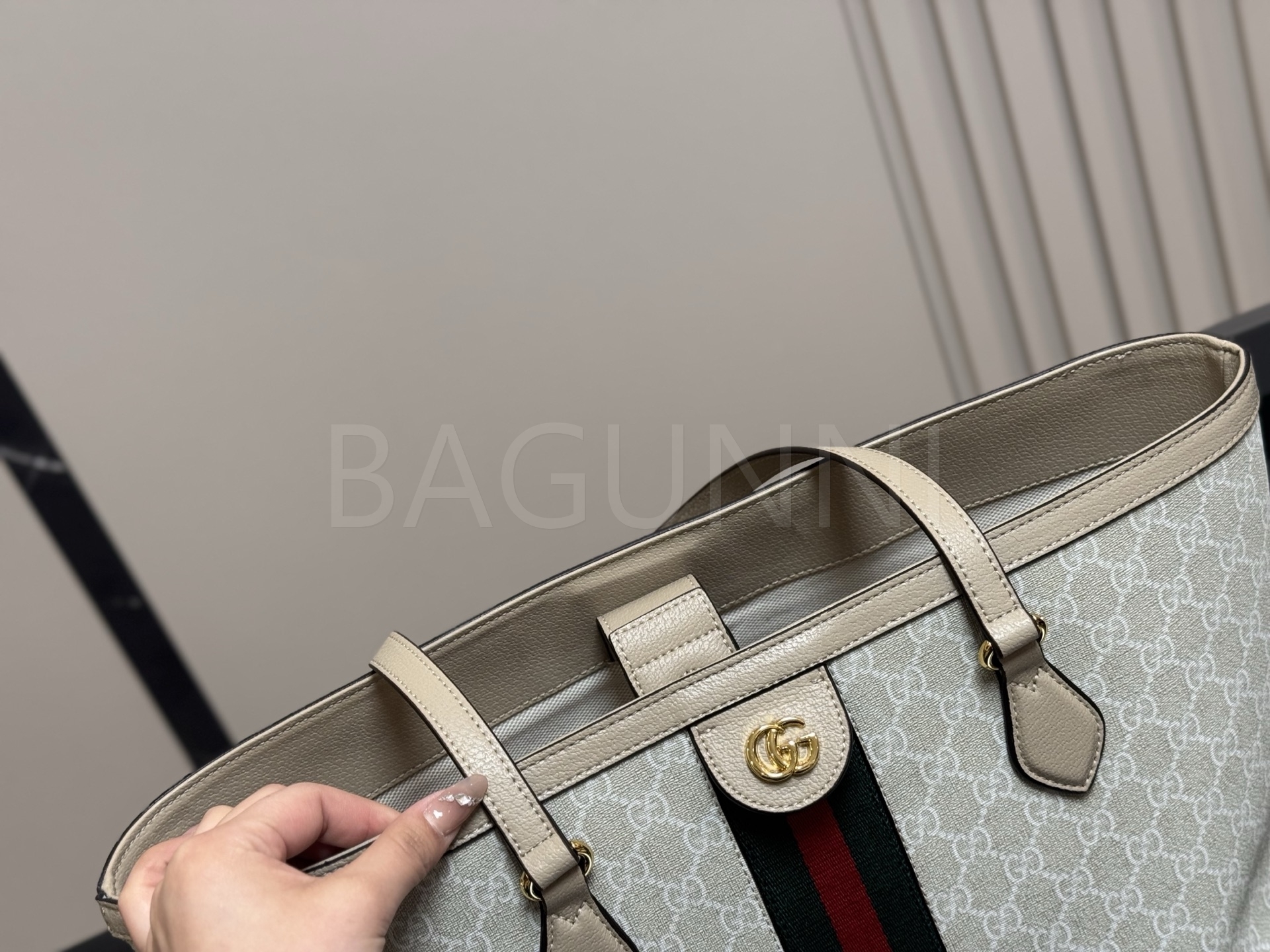구찌 캔버스 쇼퍼백입니다. 캔버스 특유의 질감이 자연스럽게 살아 있으며 브랜드 특유의 분위기를 편하게 즐기기 좋습니다.