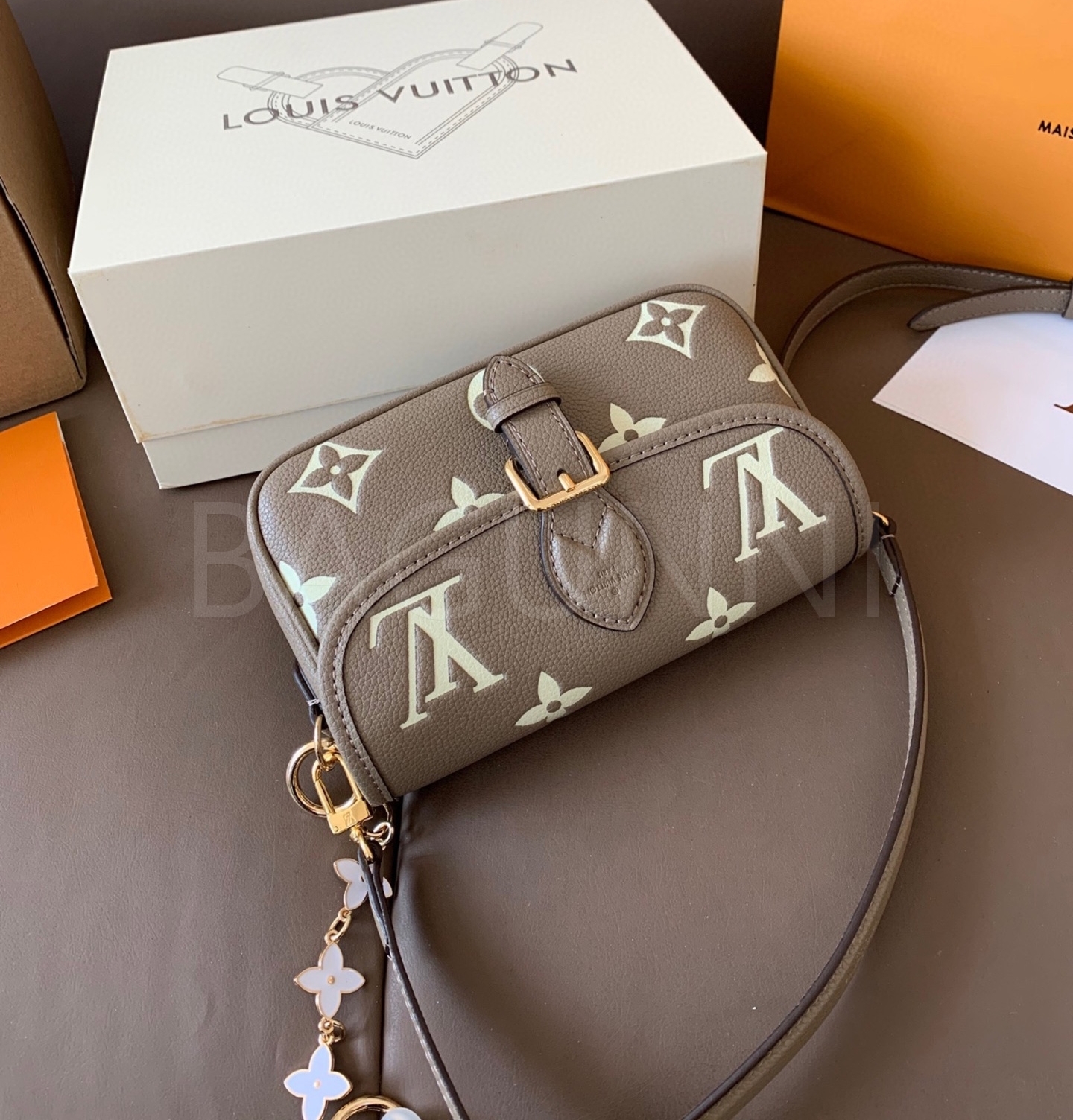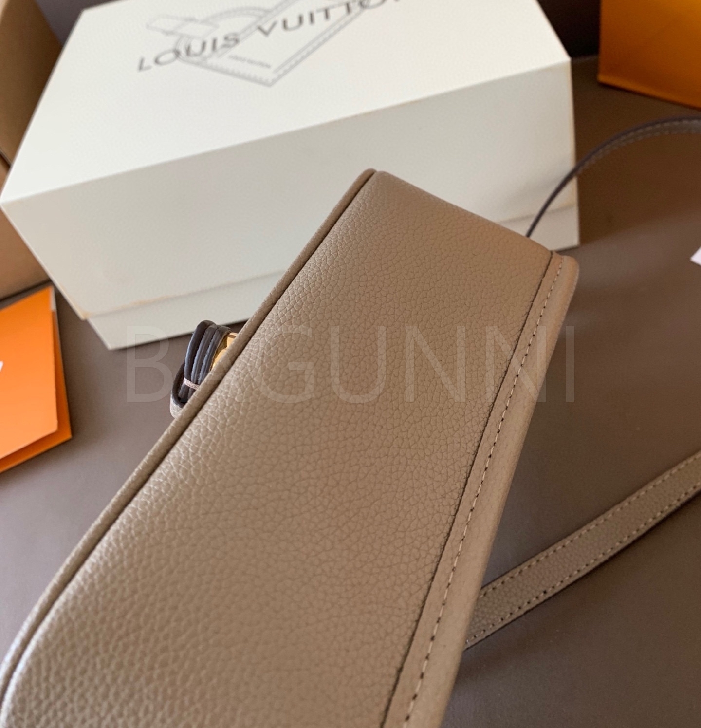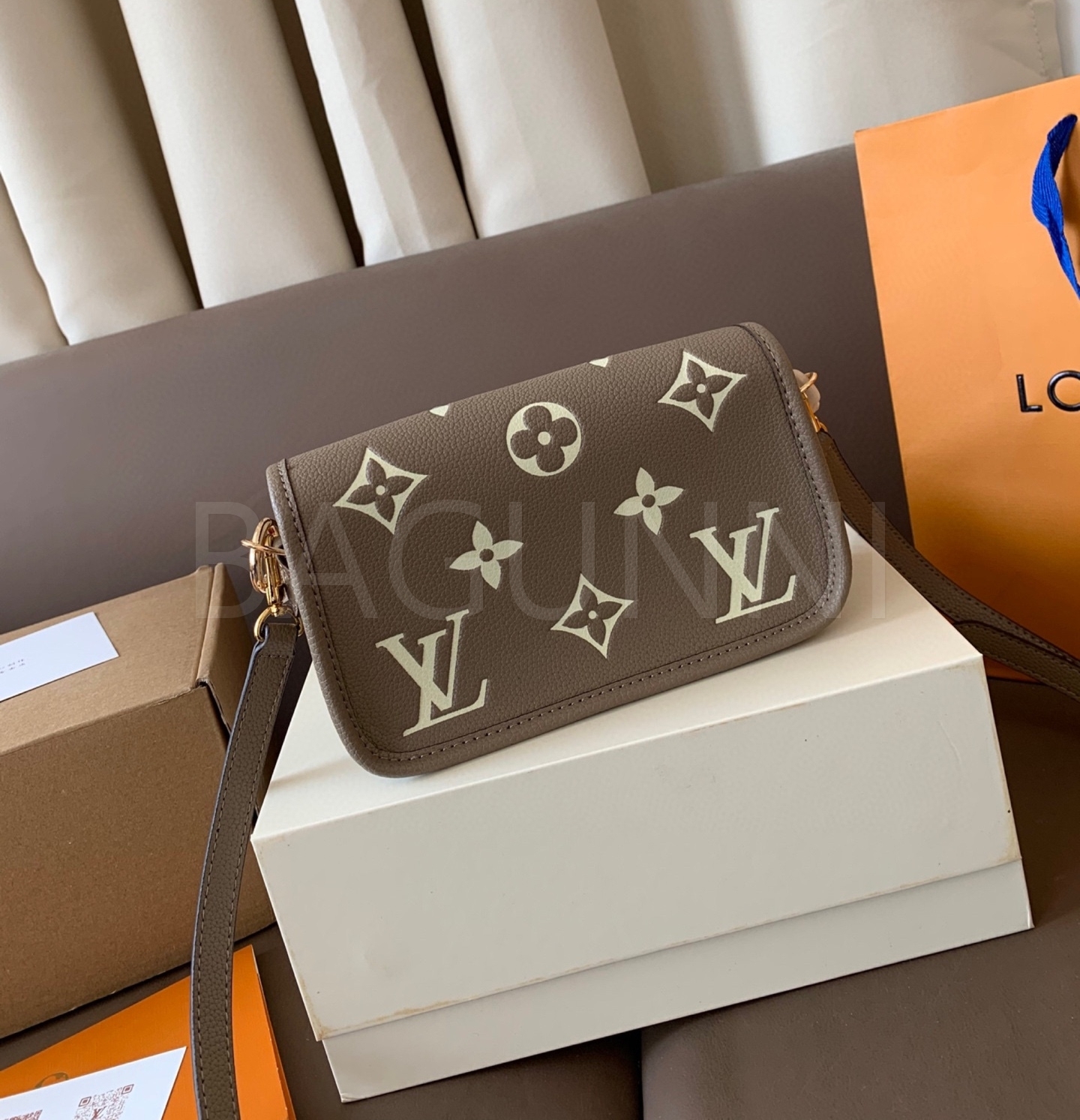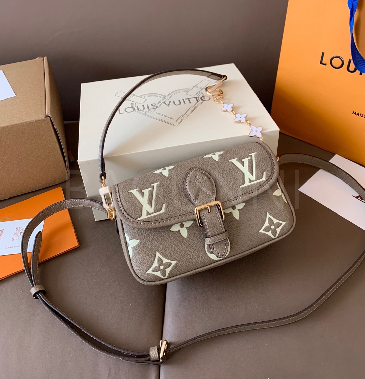 입체적인 엠보싱 가죽 질감이 매력적인 루이비통 앙프렝뜨 숄더백입니다.