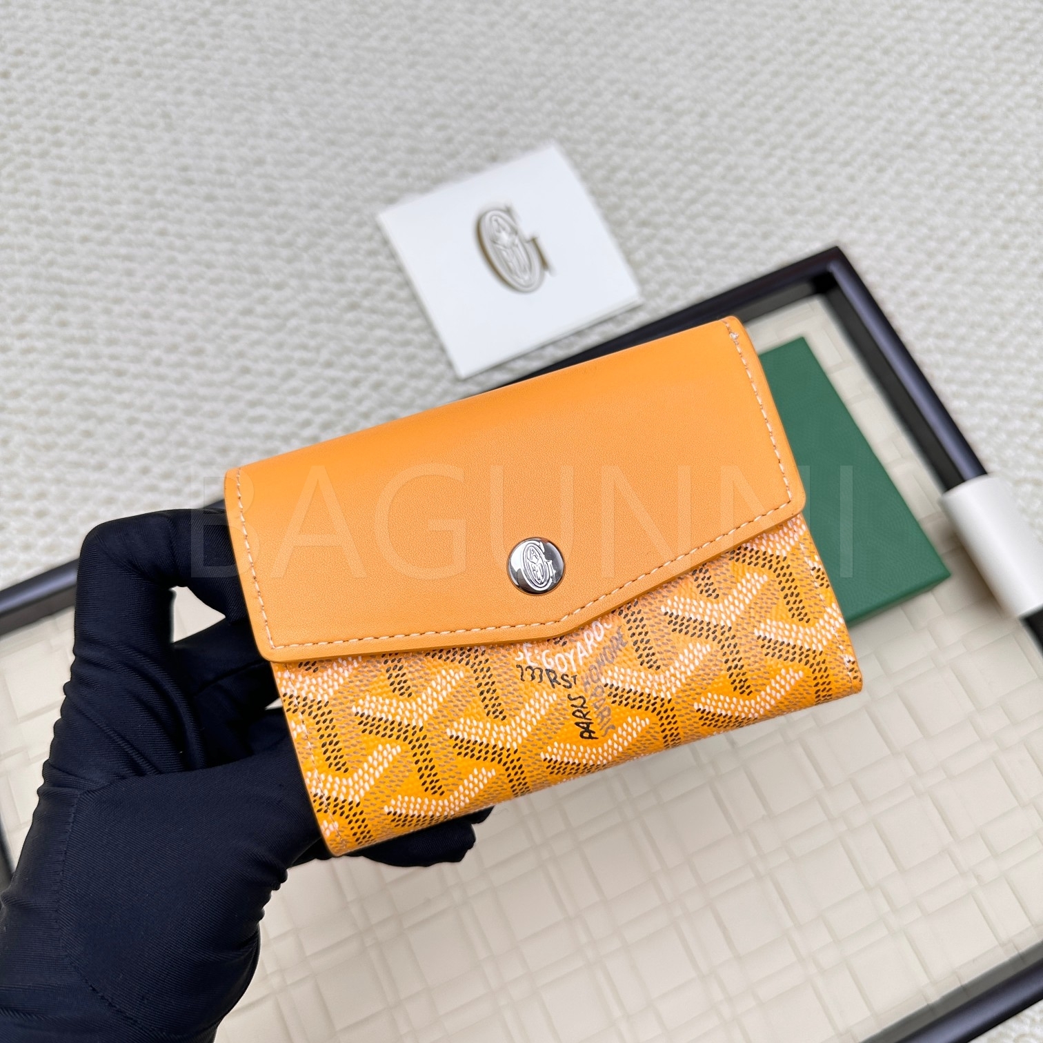 고야드 트리폴드 카드지갑 특유의 분위기가 자연스럽게 드러나는 디자인입니다.