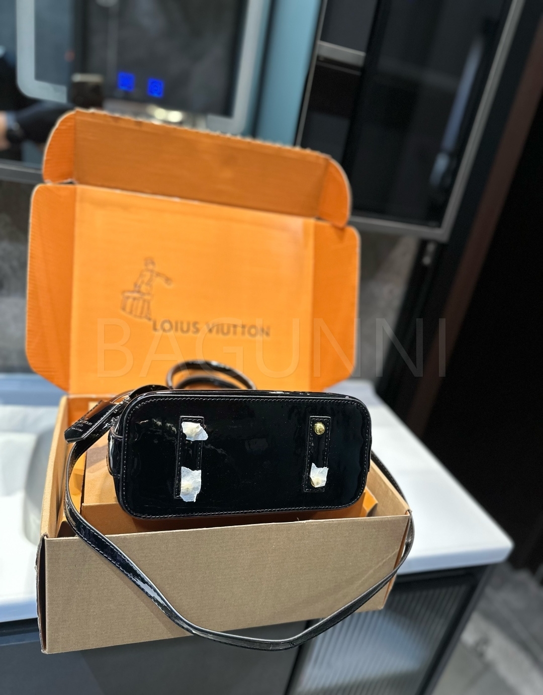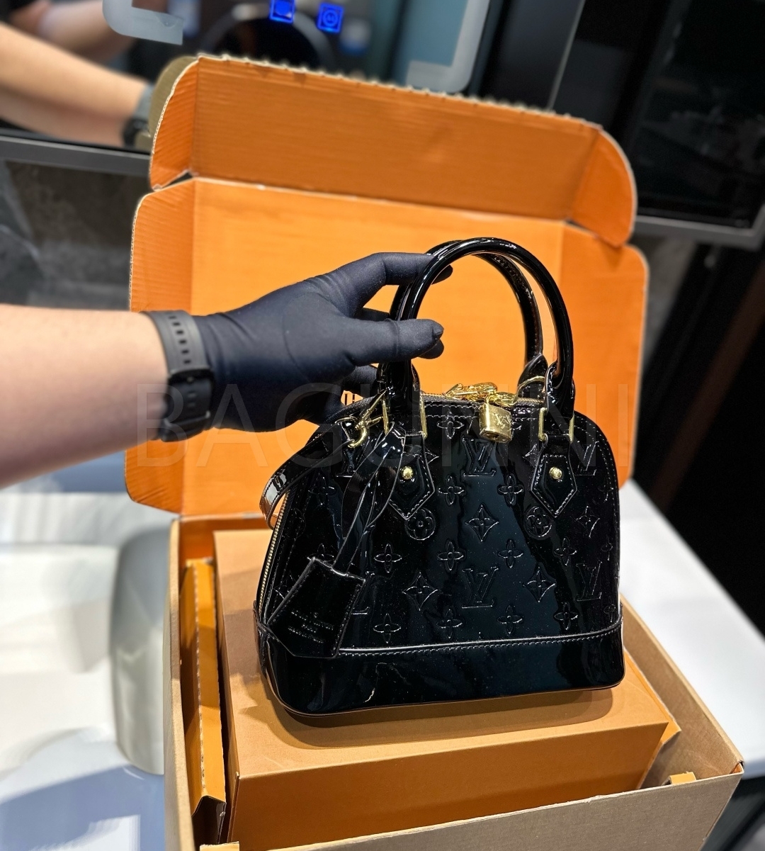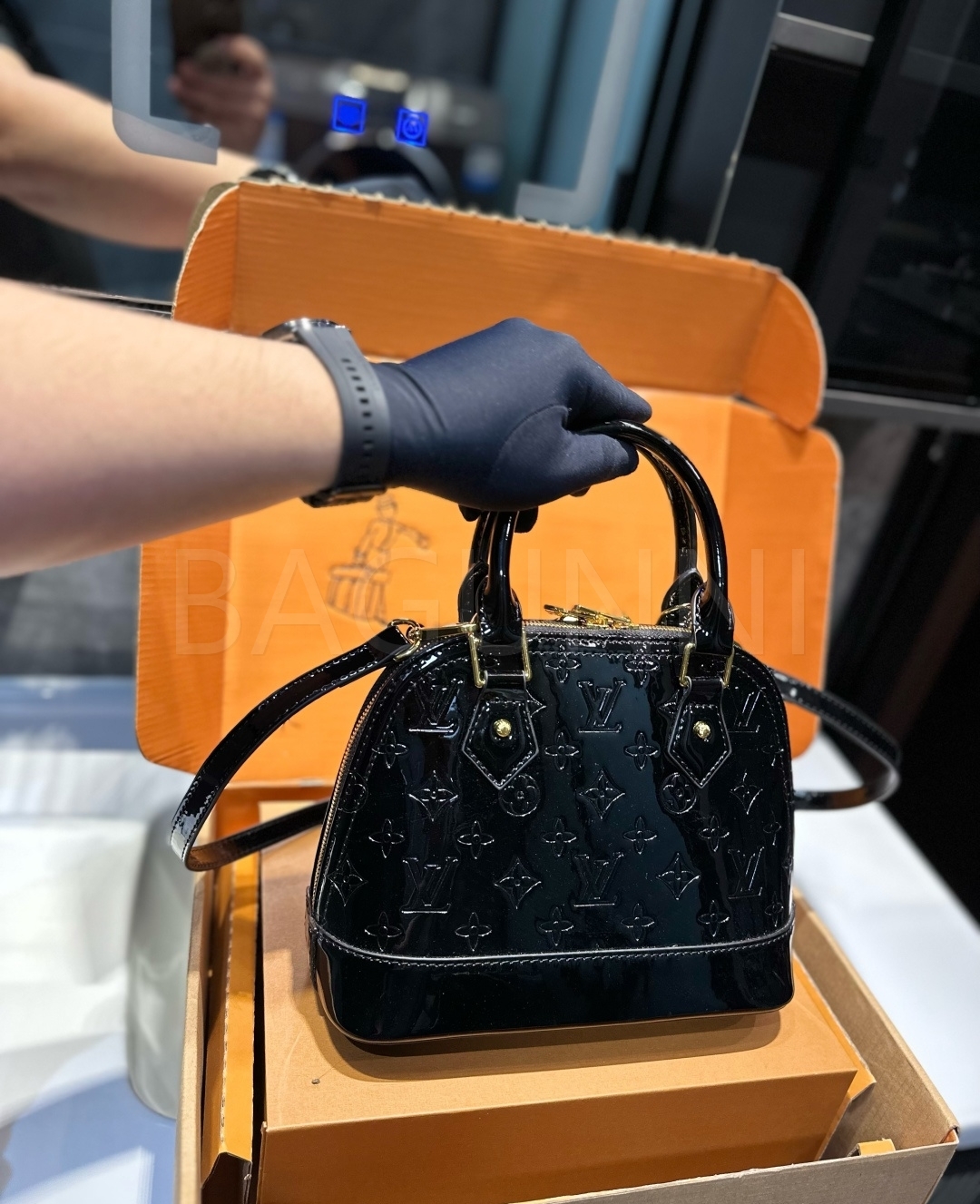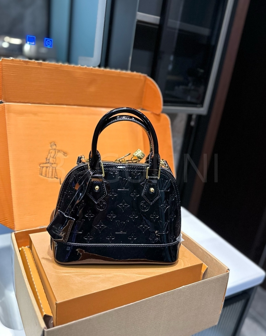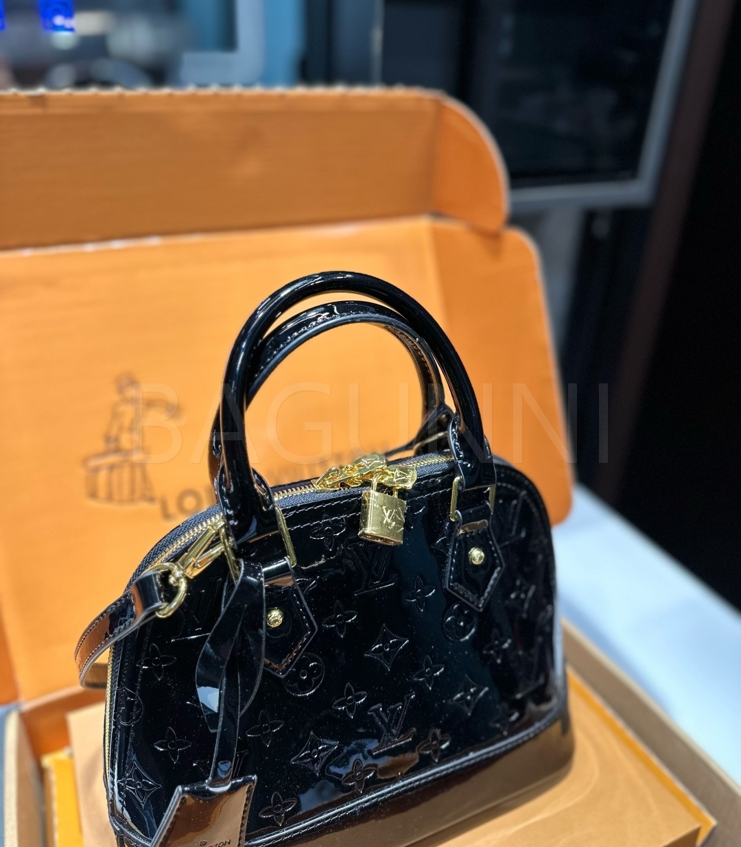 페이턴트 가죽 소재의 매력이 자연스럽게 살아 있는 루이비통 알마 백입니다.