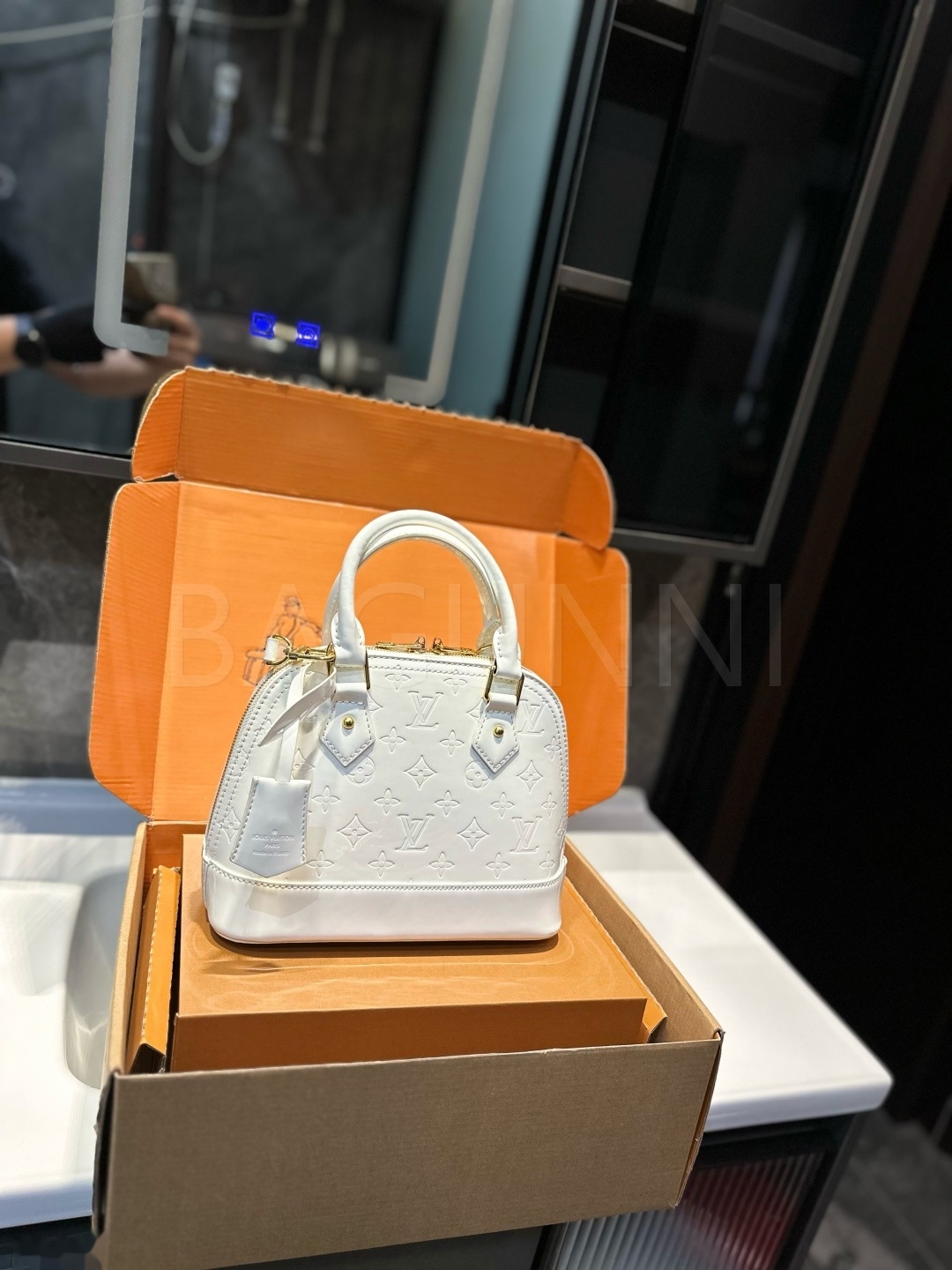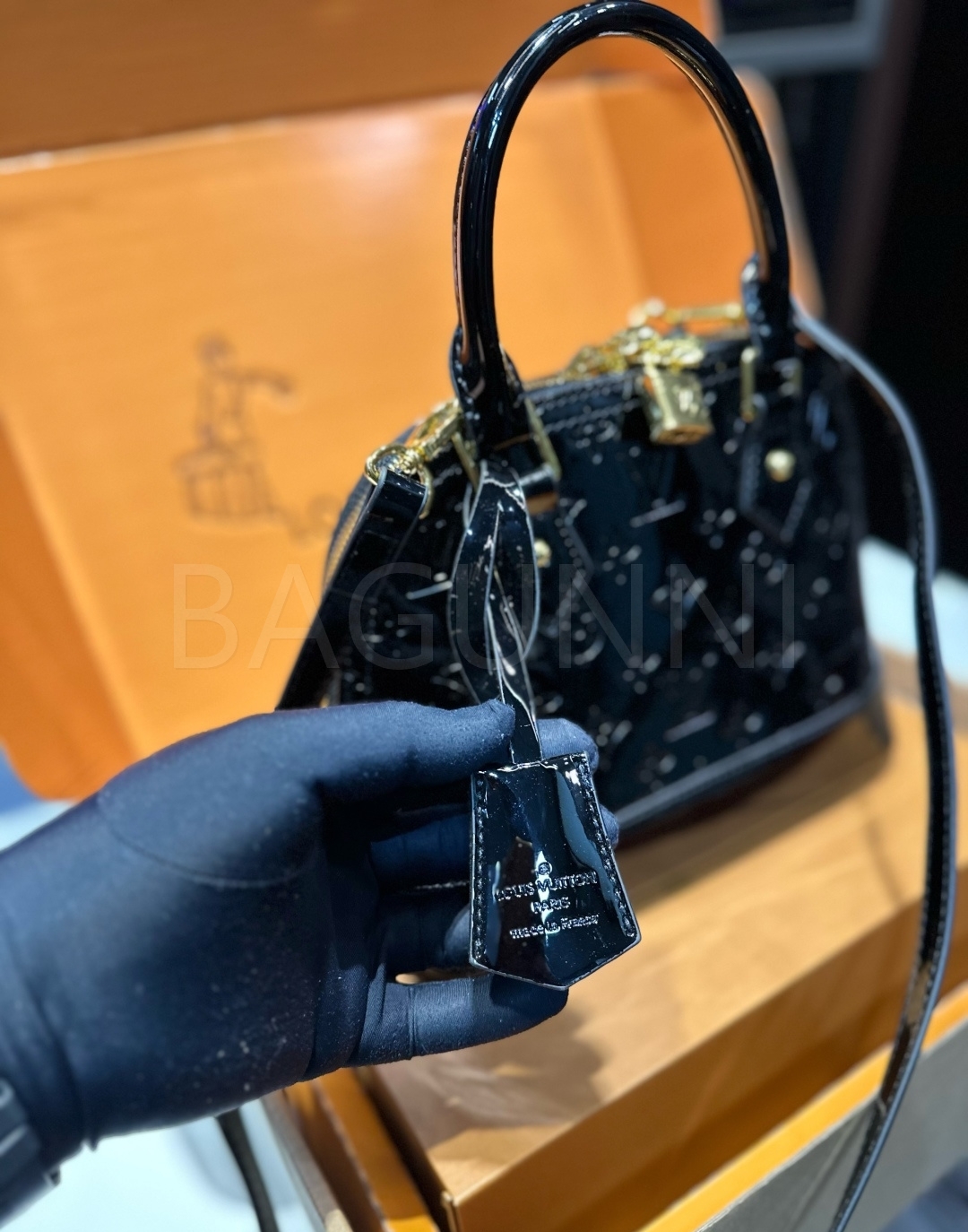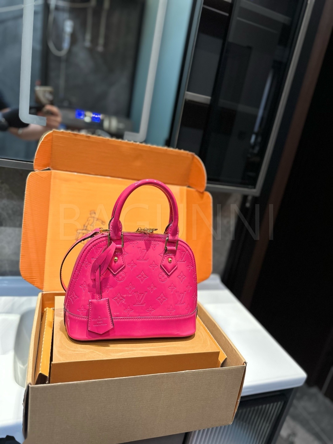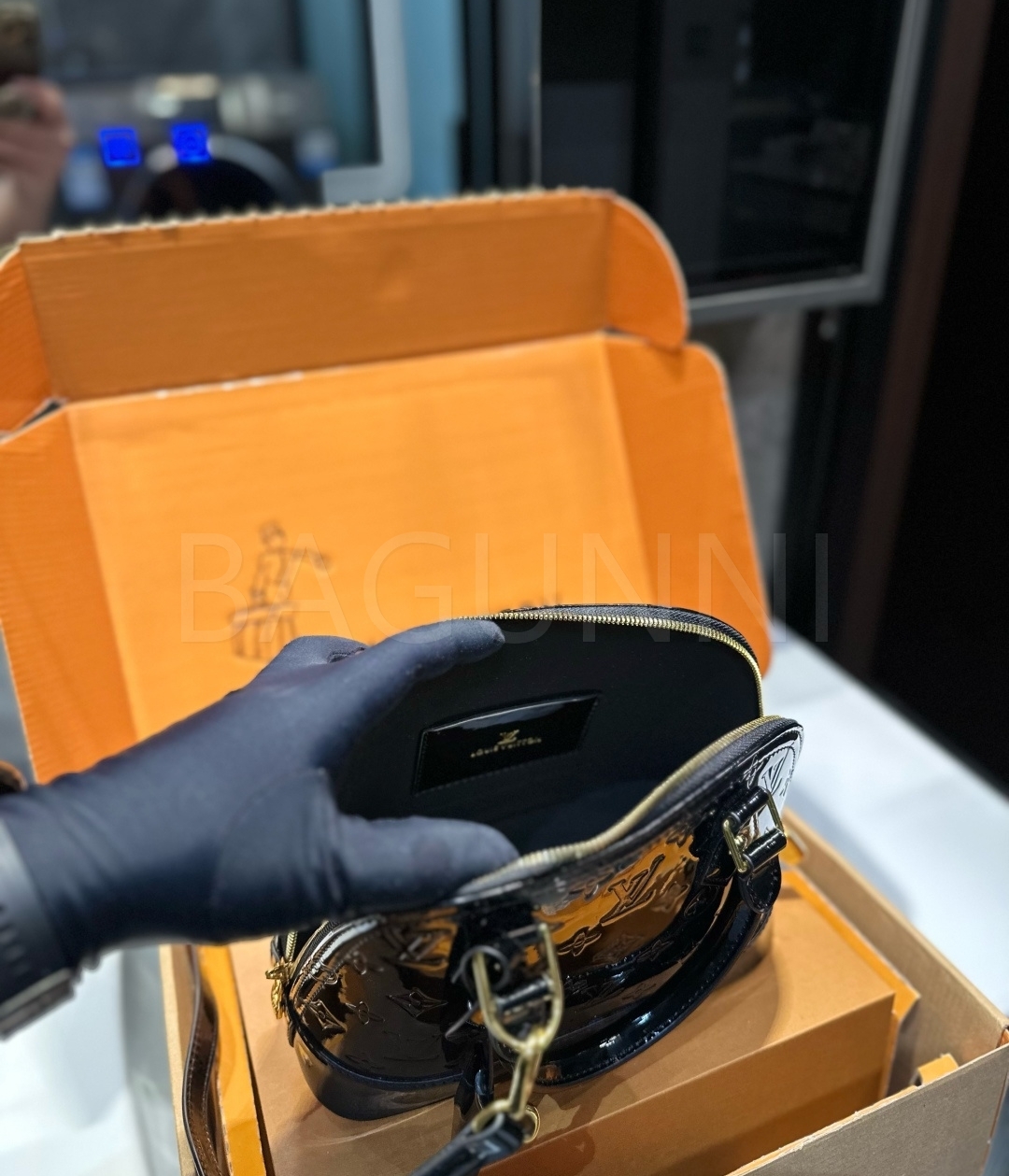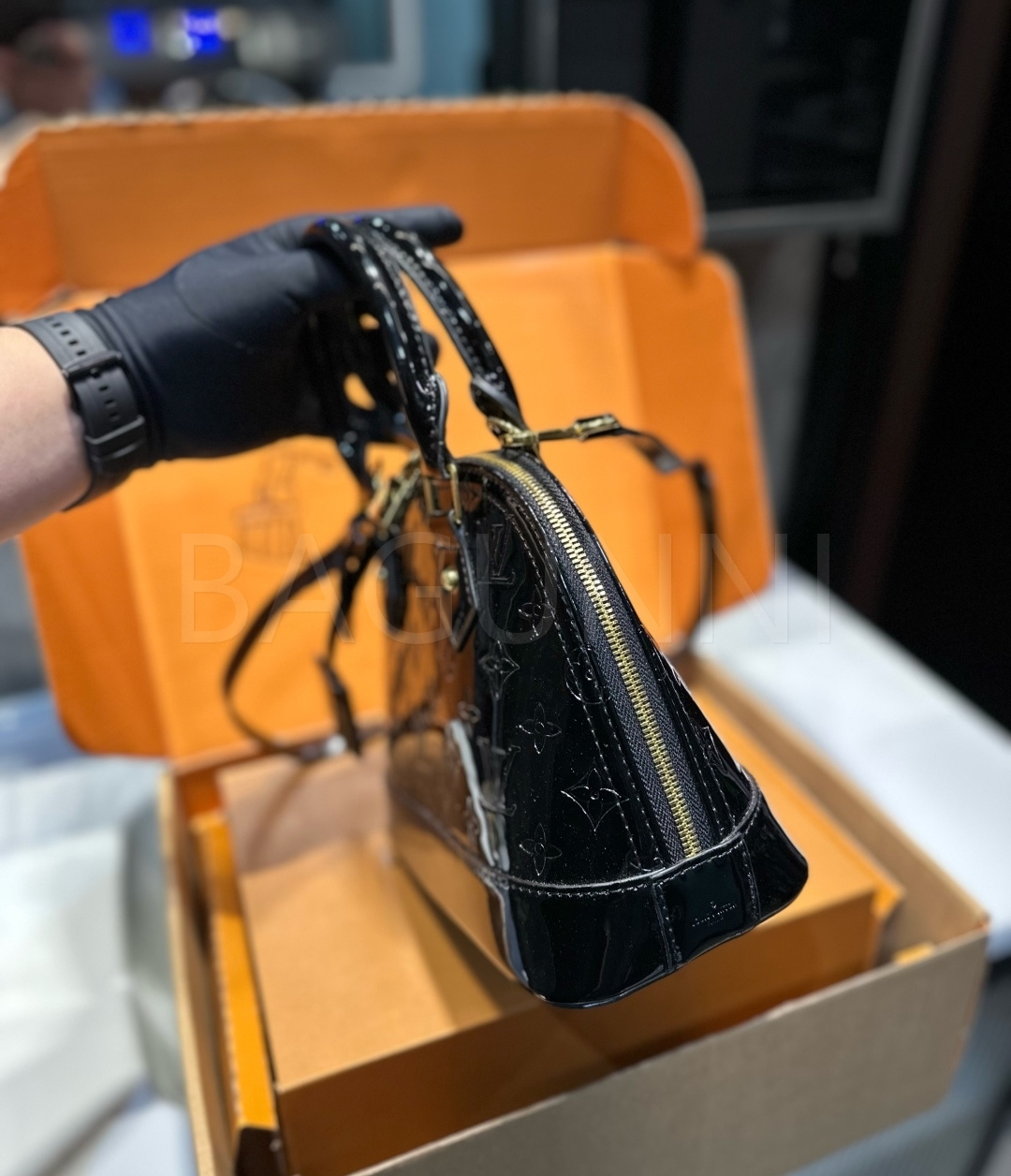 페이턴트 가죽 소재의 매력이 자연스럽게 살아 있는 루이비통 알마 백입니다.