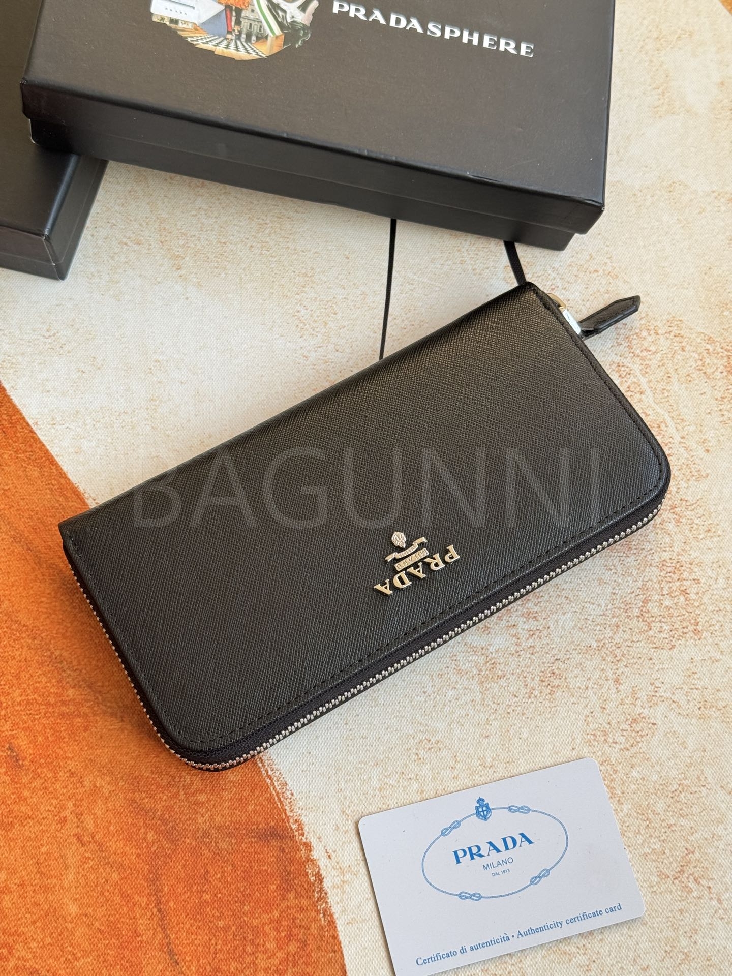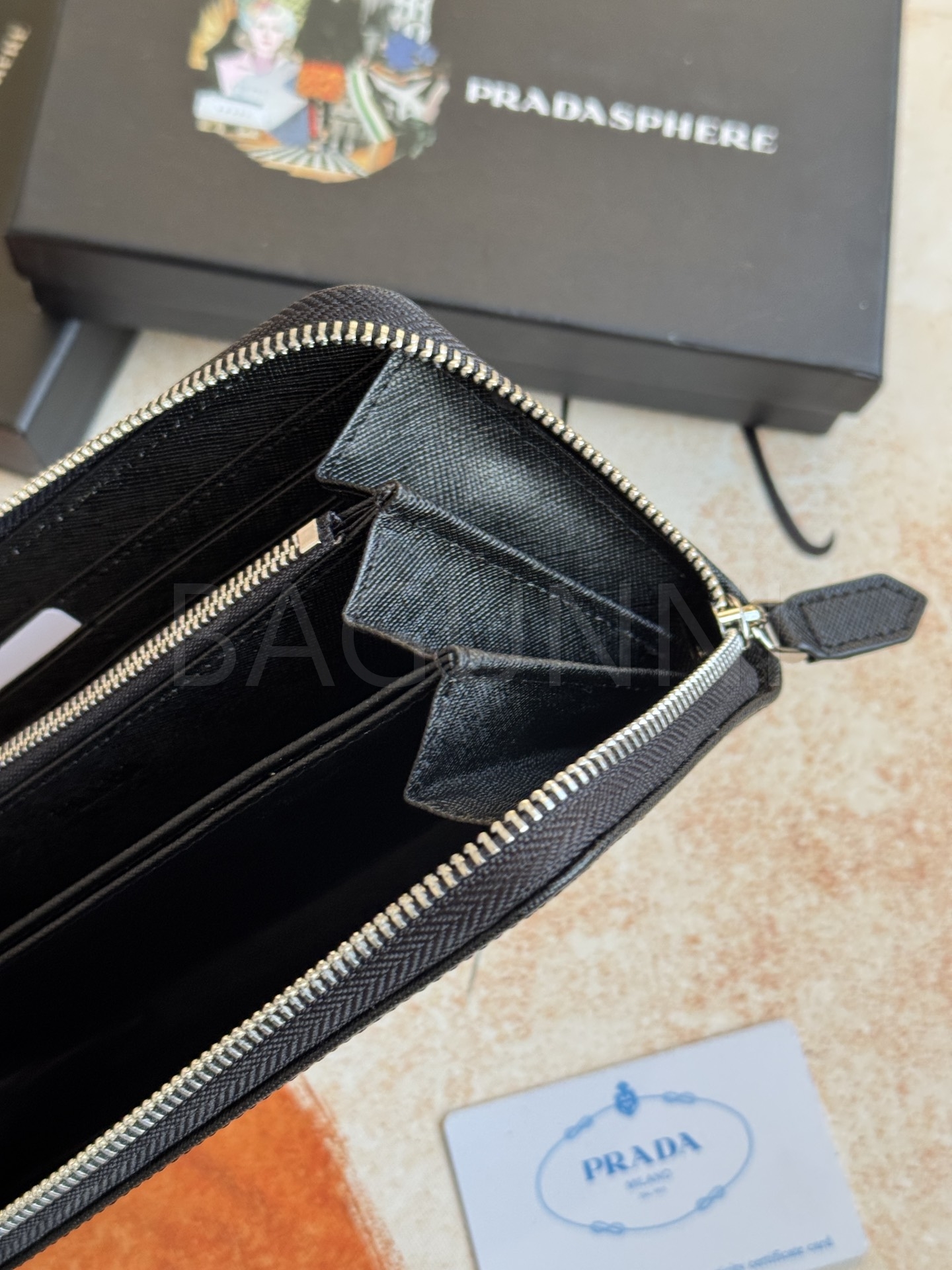 사피아노 질감이 깔끔하게 살아있는 프라다 사피아노 지퍼 장지갑입니다.