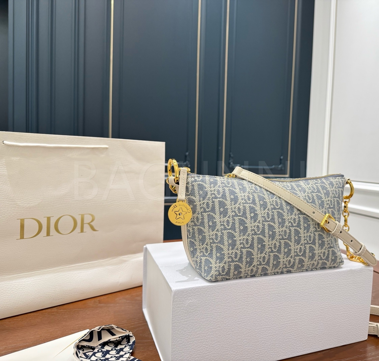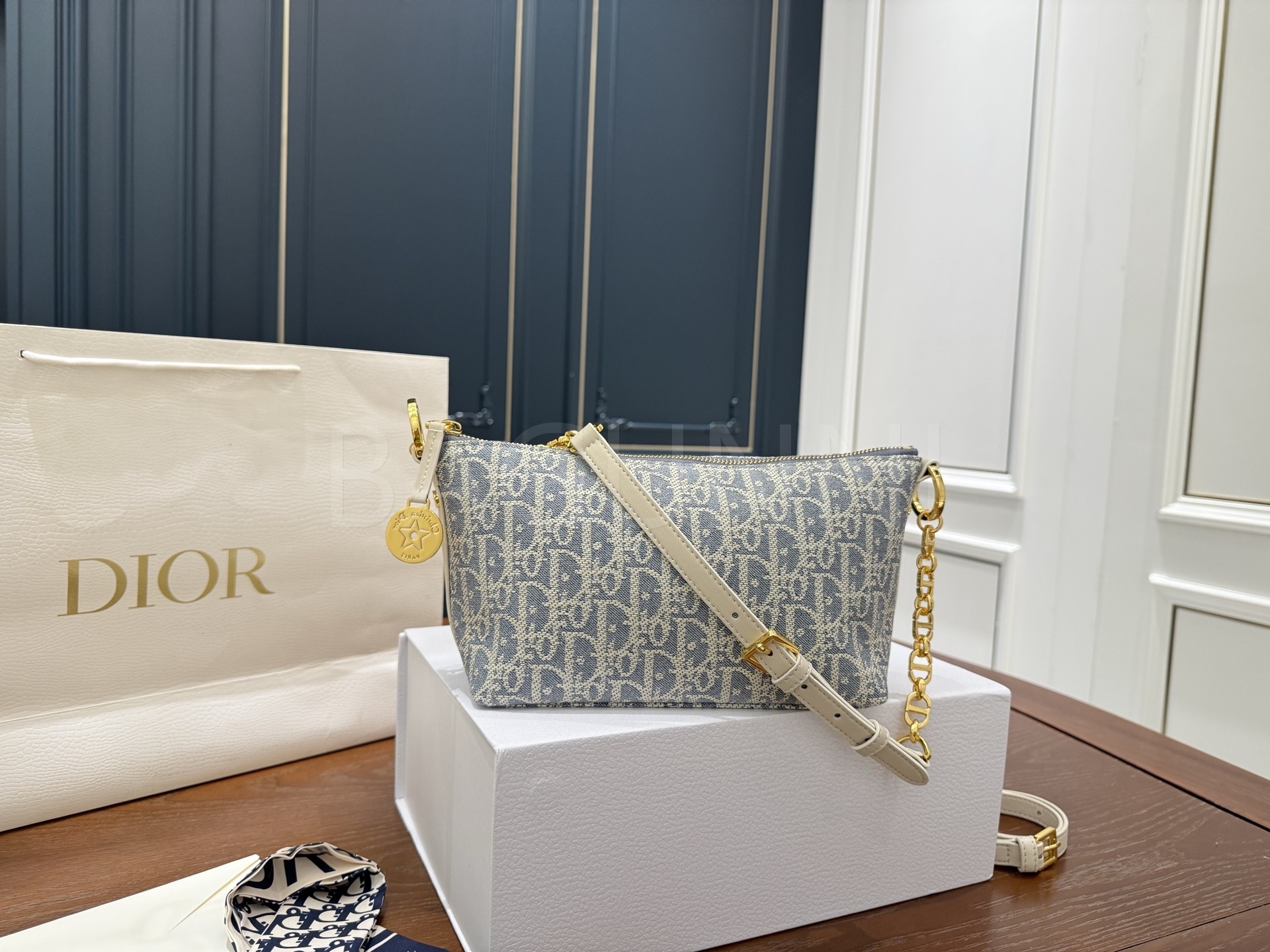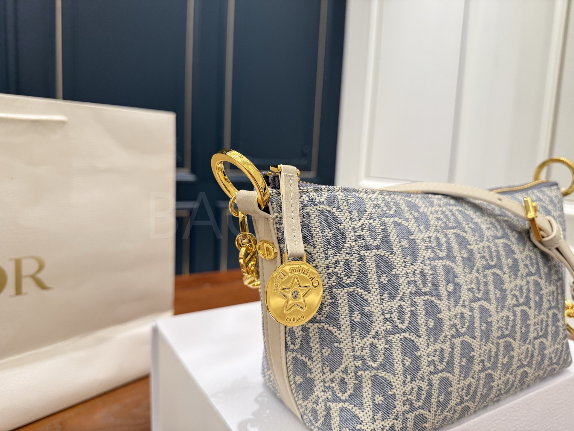 디올 디올스타 숄더백입니다. 가죽 특유의 질감이 자연스럽게 살아 있으며 블루 톤이 어우러져 브랜드 특유의 분위기를 편하게 즐기기 좋습니다.