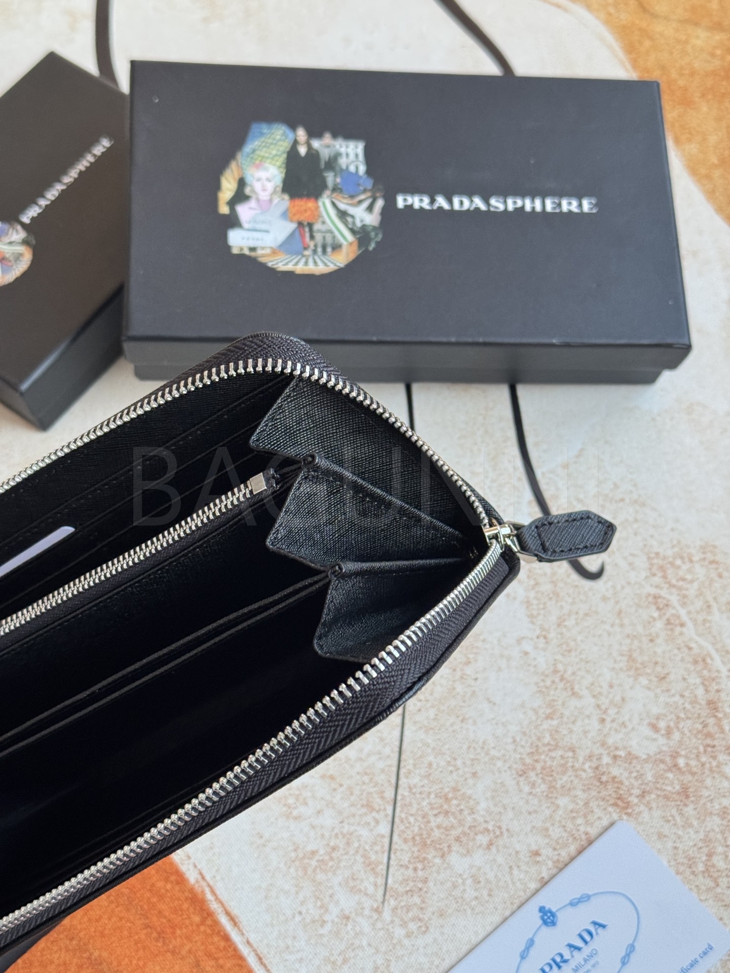 사피아노 질감이 깔끔하게 살아있는 프라다 사피아노 지퍼 장지갑입니다.