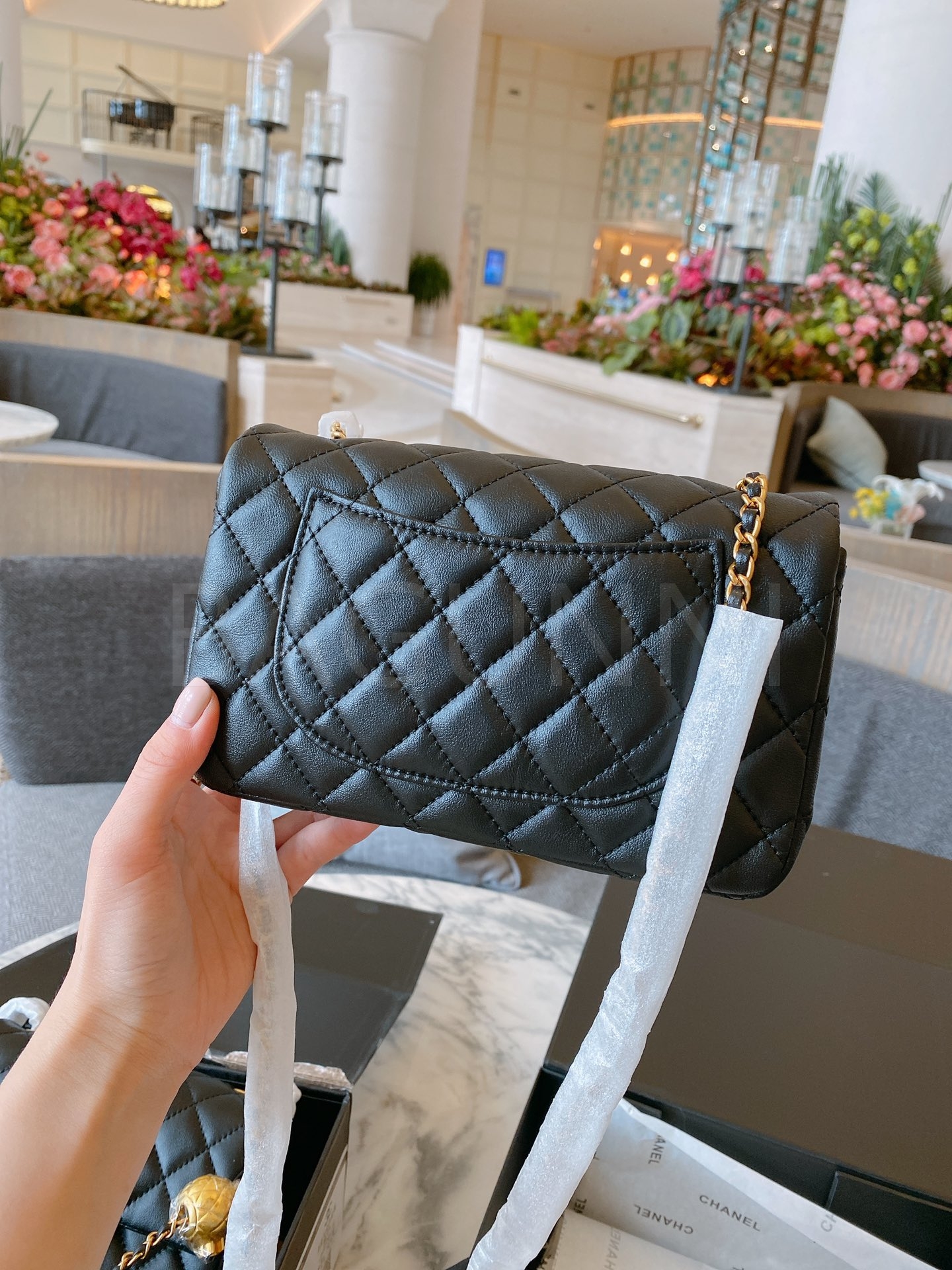 램스킨 특유의 매력이 돋보이는 샤넬 금볼 스퀘어 플랩 백입니다.