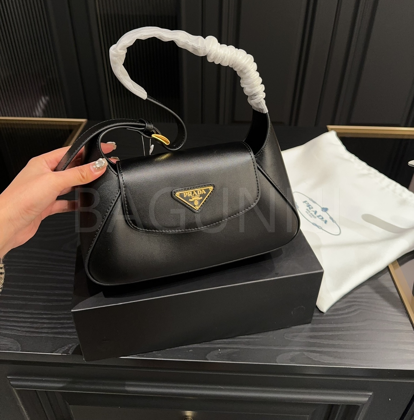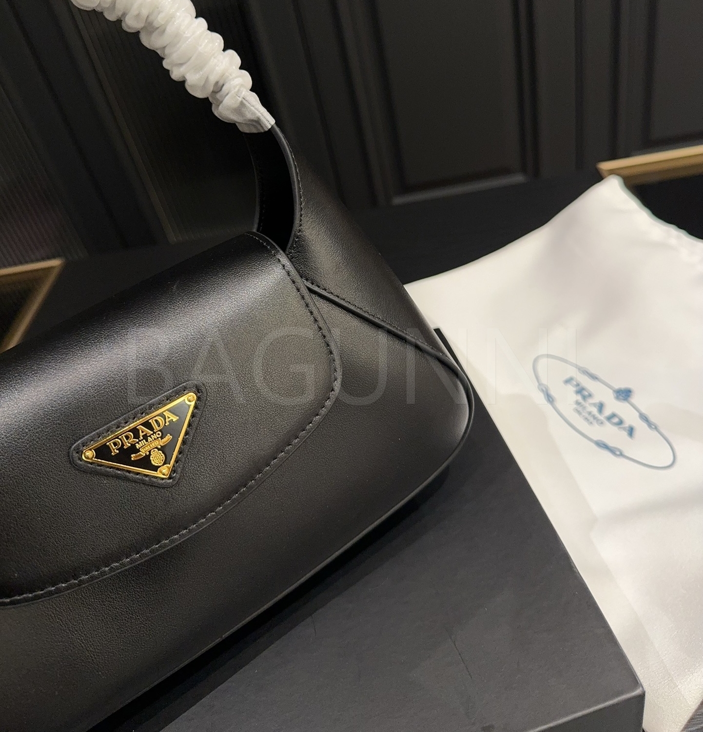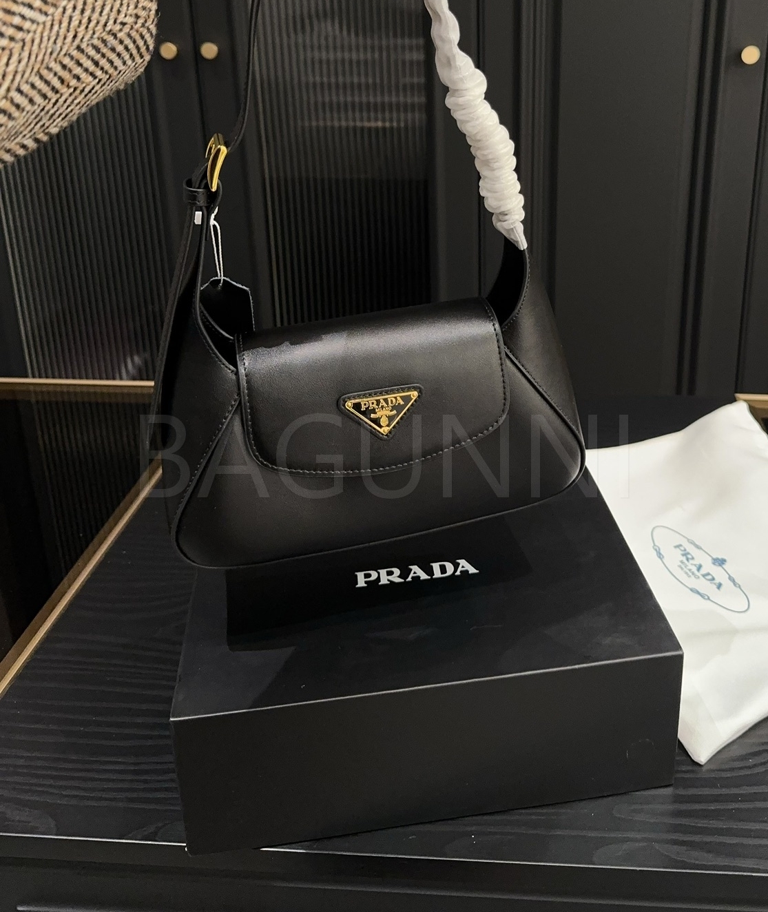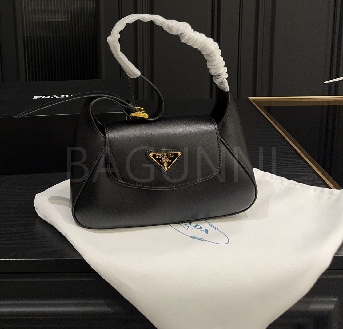 프라다 레더 호보백입니다. 가죽 특유의 질감이 자연스럽게 살아 있으며 브랜드 특유의 분위기를 편하게 즐기기 좋습니다.
