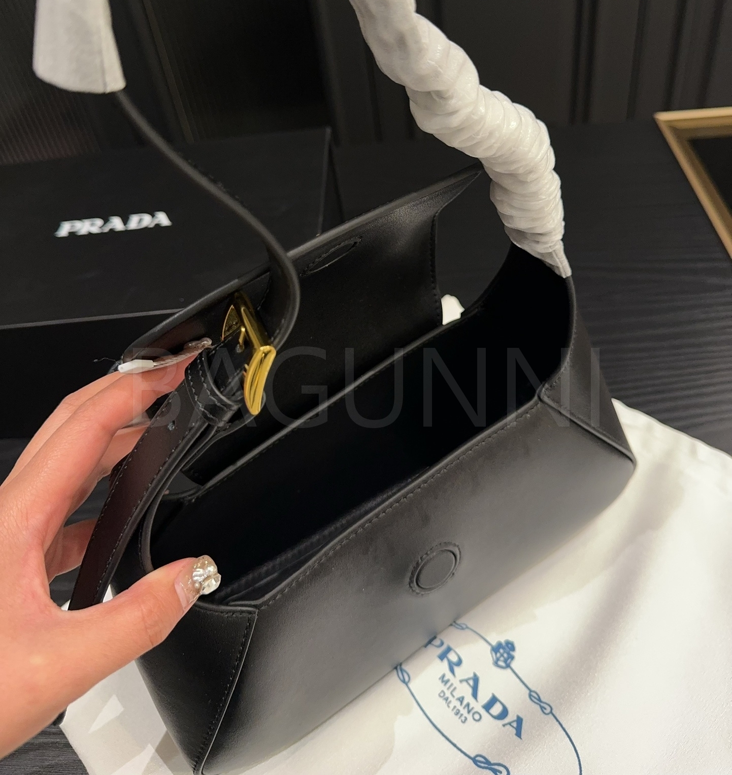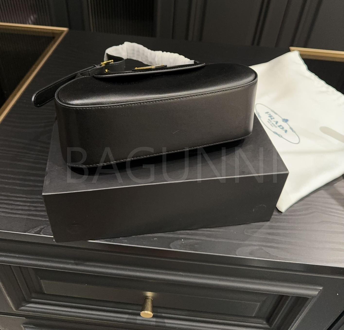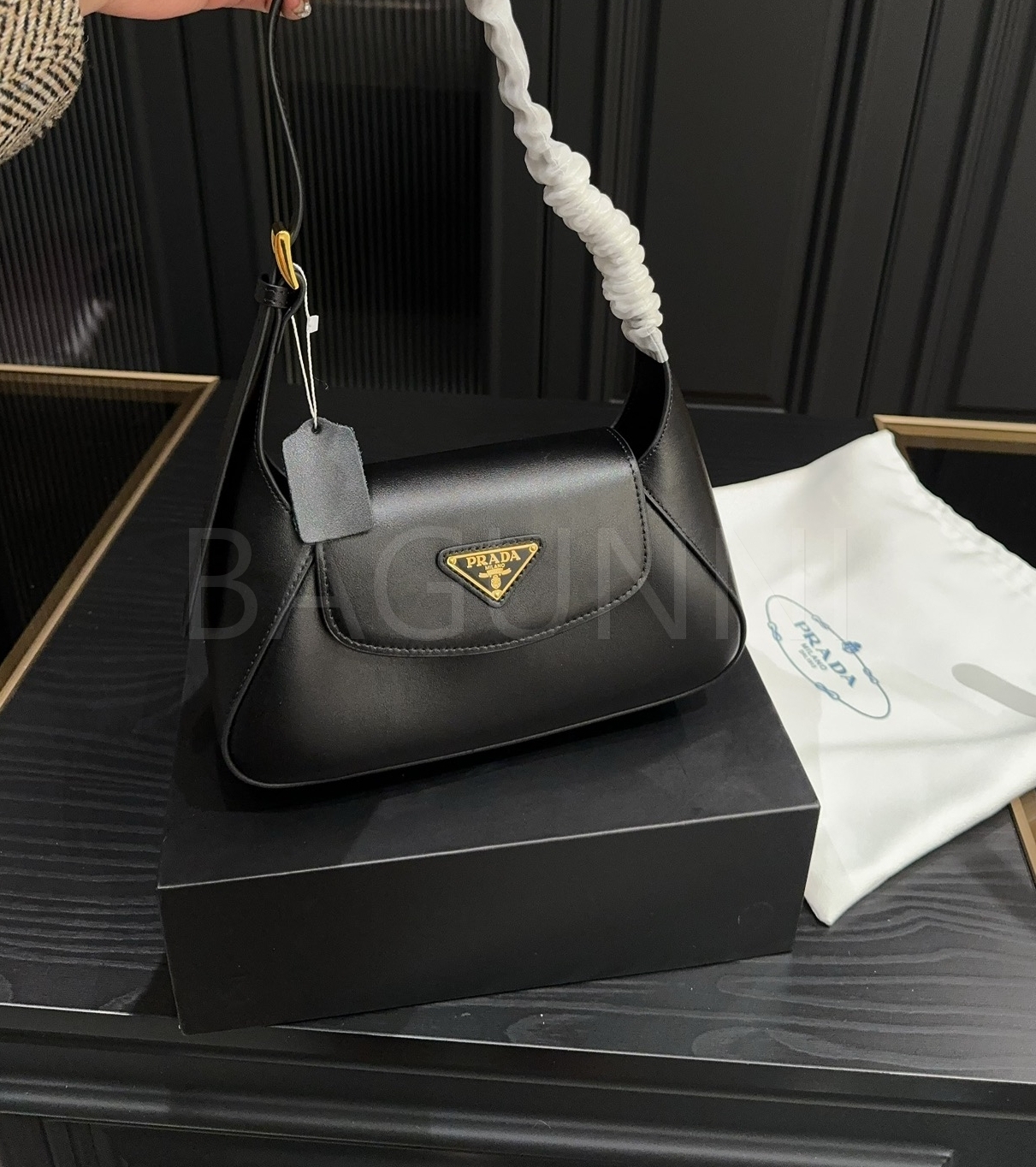 프라다 레더 호보백입니다. 가죽 특유의 질감이 자연스럽게 살아 있으며 브랜드 특유의 분위기를 편하게 즐기기 좋습니다.