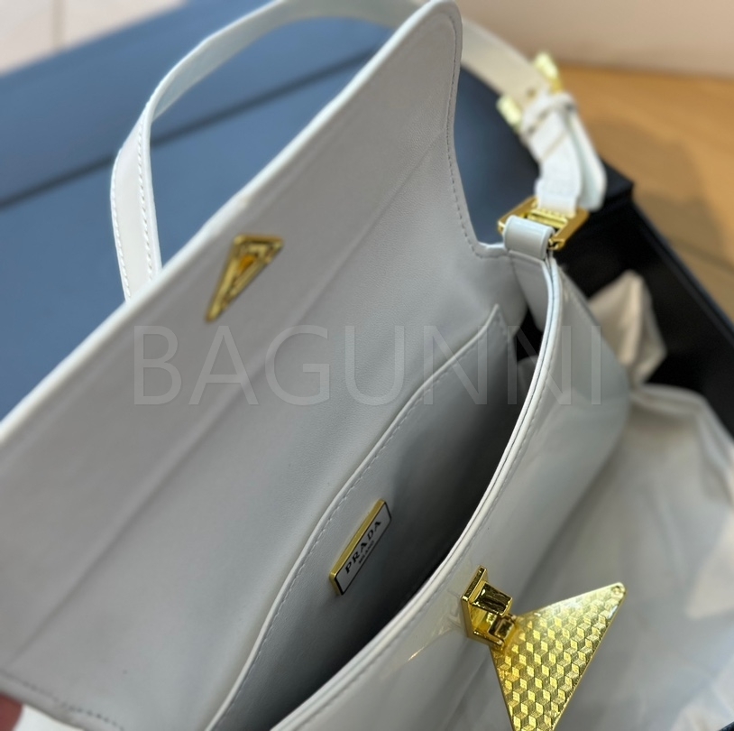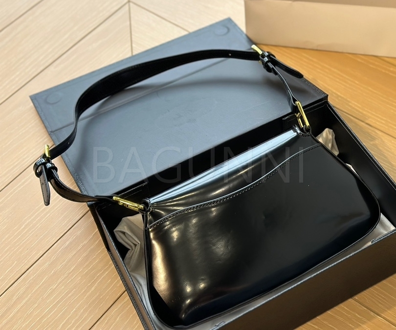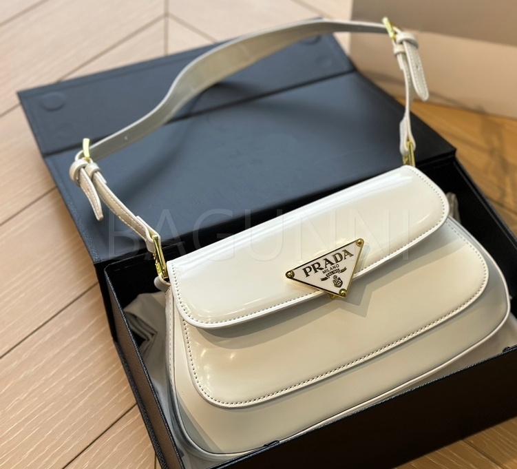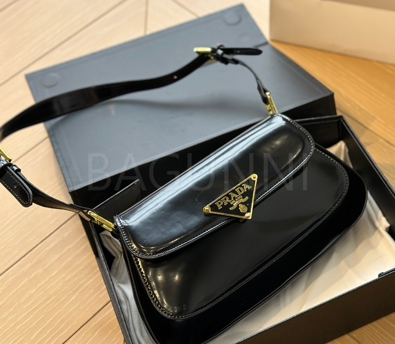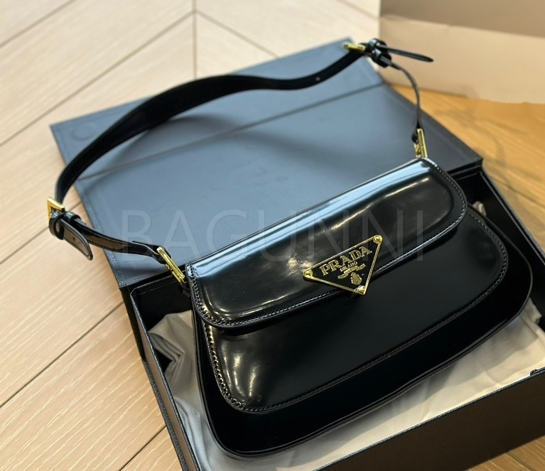 프라다 페이턴트 숄더백입니다. 페이턴트 가죽 특유의 질감이 자연스럽게 살아 있으며 브랜드 특유의 분위기를 편하게 즐기기 좋습니다.