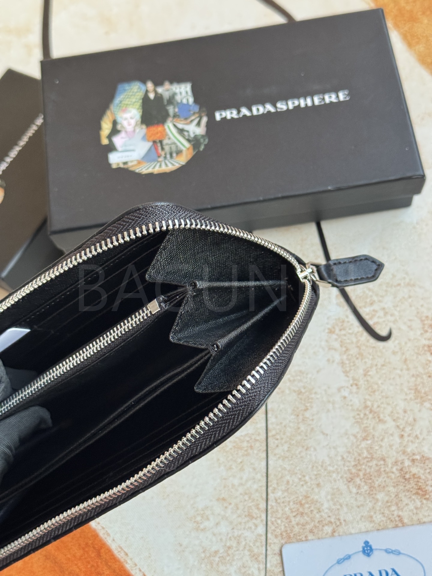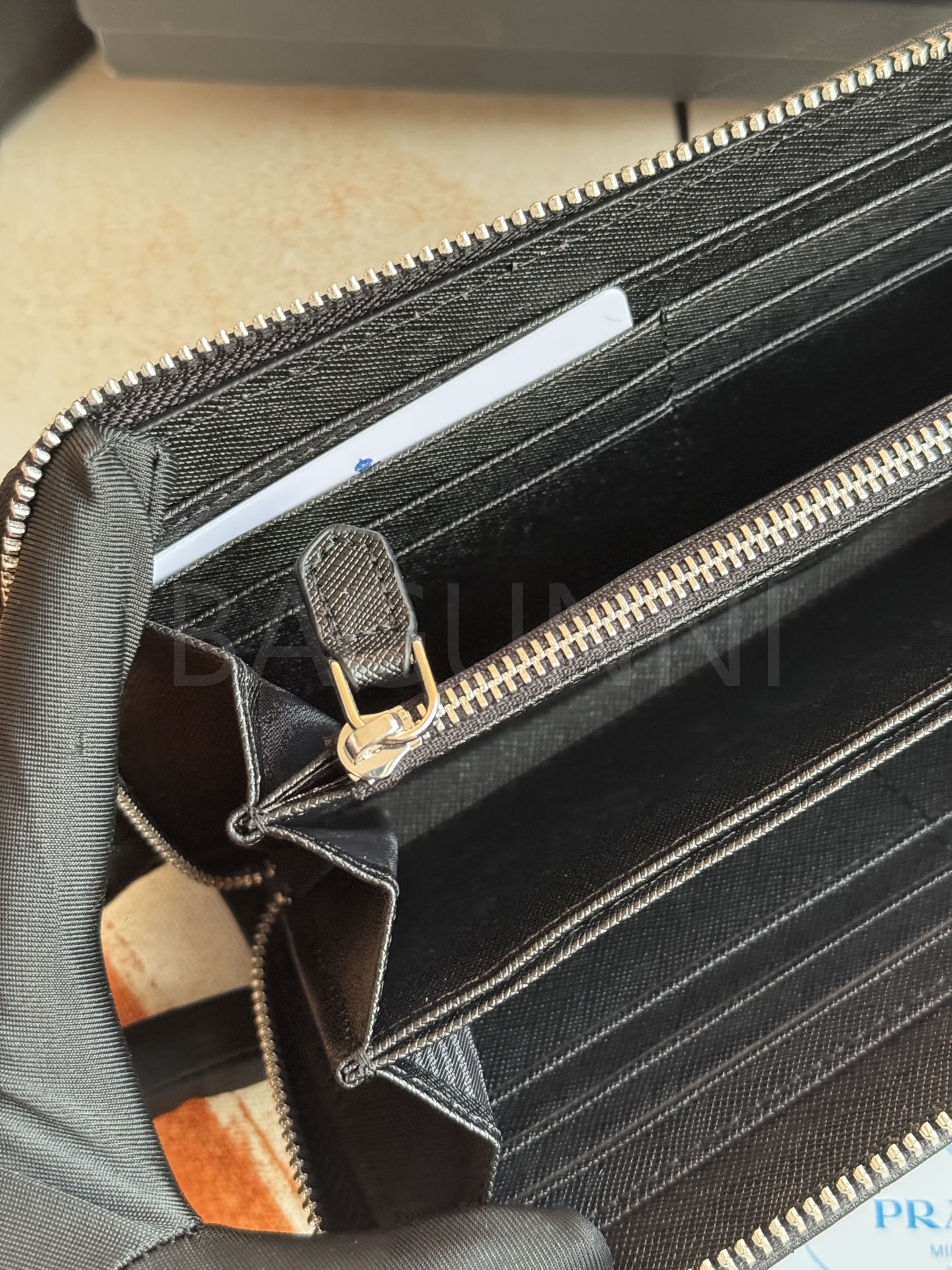 사피아노 질감이 깔끔하게 살아있는 프라다 사피아노 지퍼 장지갑입니다.