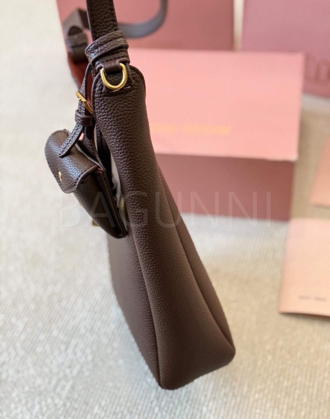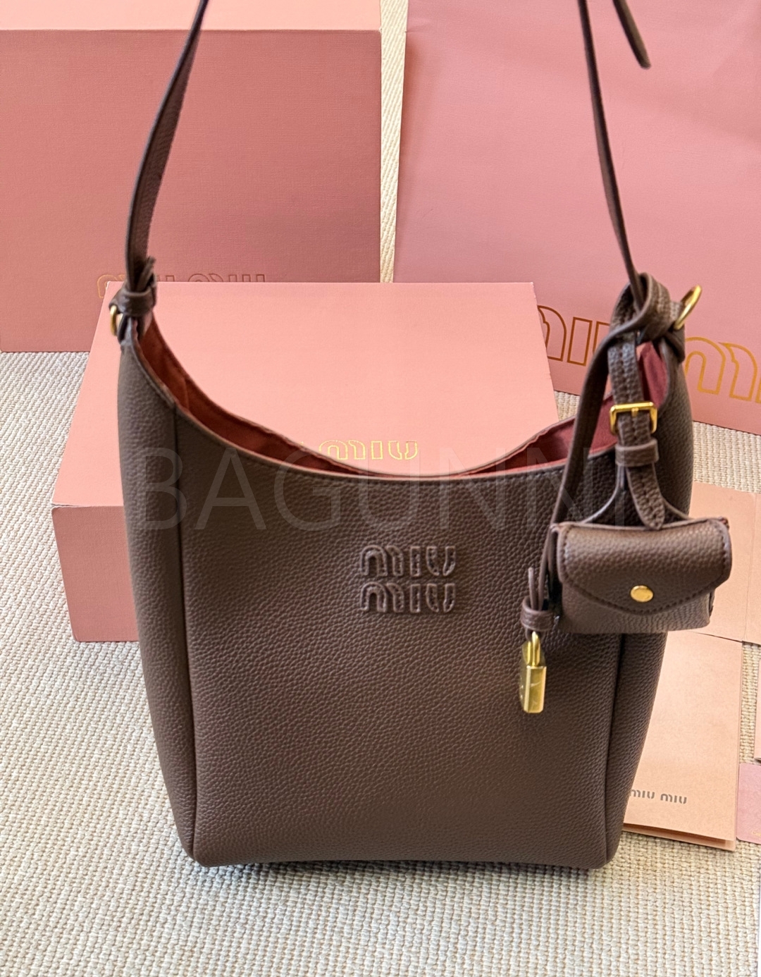 미우미우 로고 버킷백입니다. 가죽 특유의 질감이 자연스럽게 살아 있으며 브라운 톤이 어우러져 브랜드 특유의 분위기를 편하게 즐기기 좋습니다.