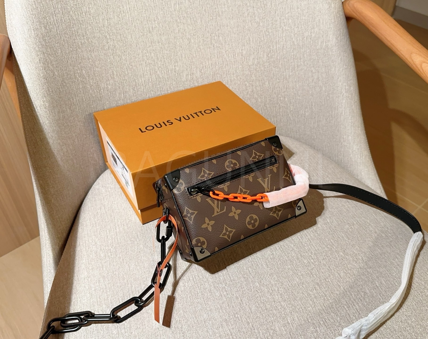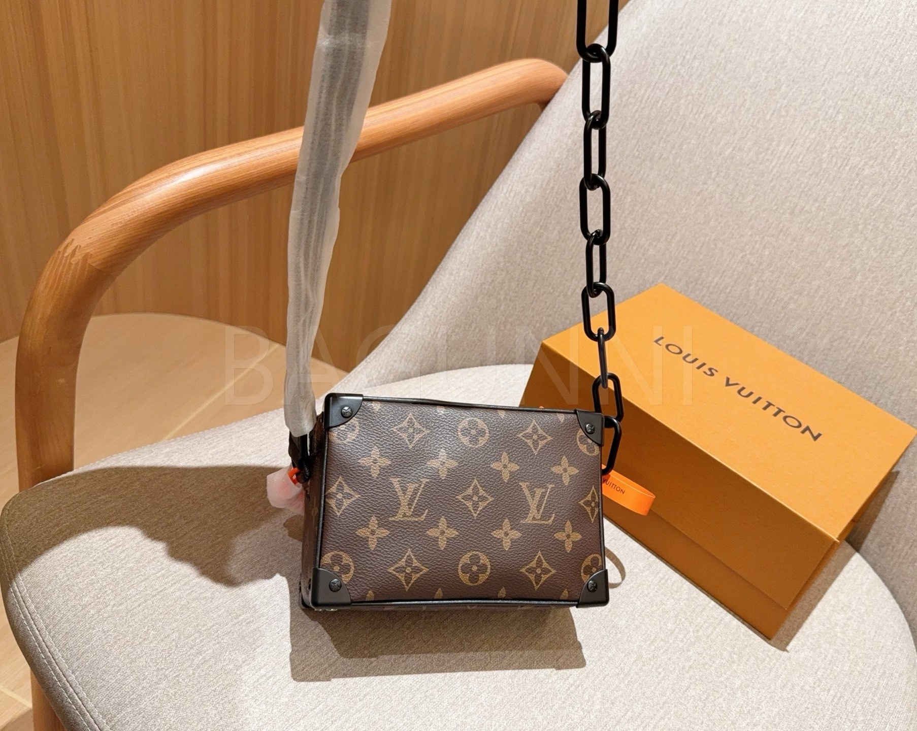 체인 스트랩, 박스 실루엣 디테일이 조화롭게 어우러져 완성도를 높여줍니다