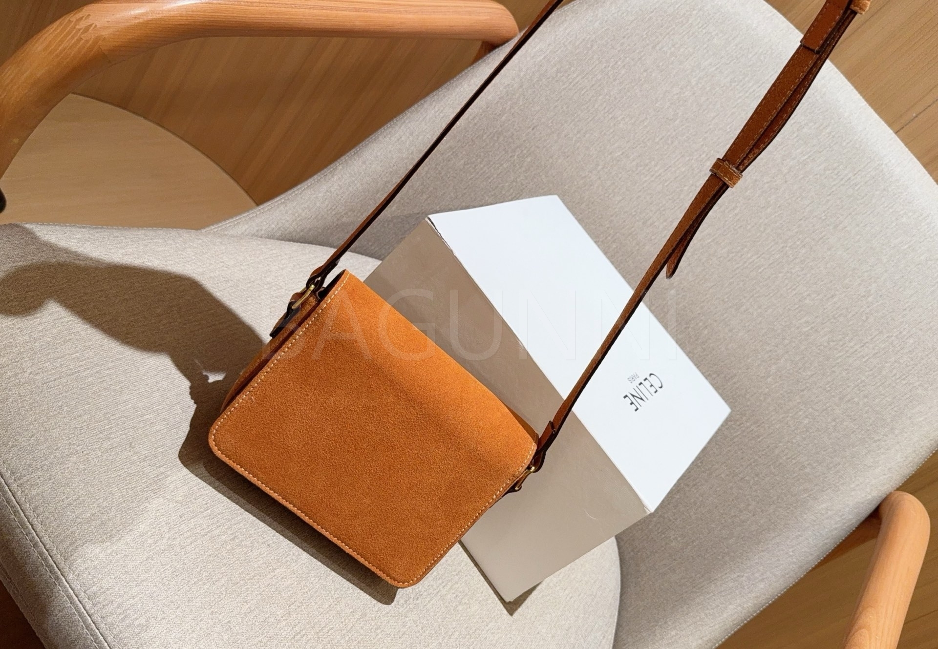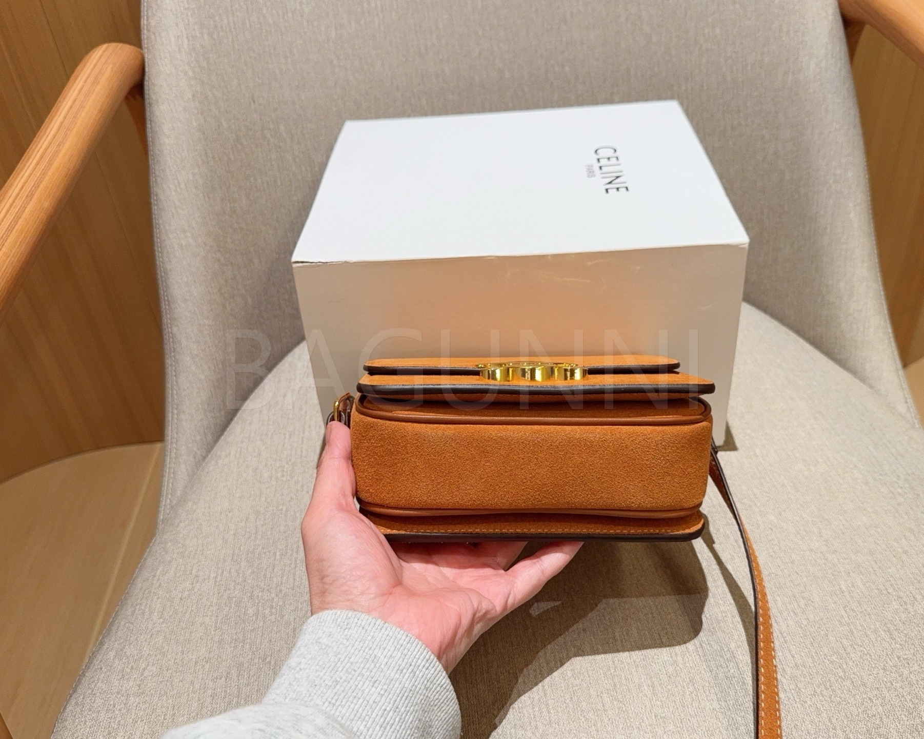 셀린느 트리옹프 스웨이드 숄더백입니다. 스웨이드 특유의 질감이 자연스럽게 살아 있으며 브랜드 특유의 분위기를 편하게 즐기기 좋습니다.
