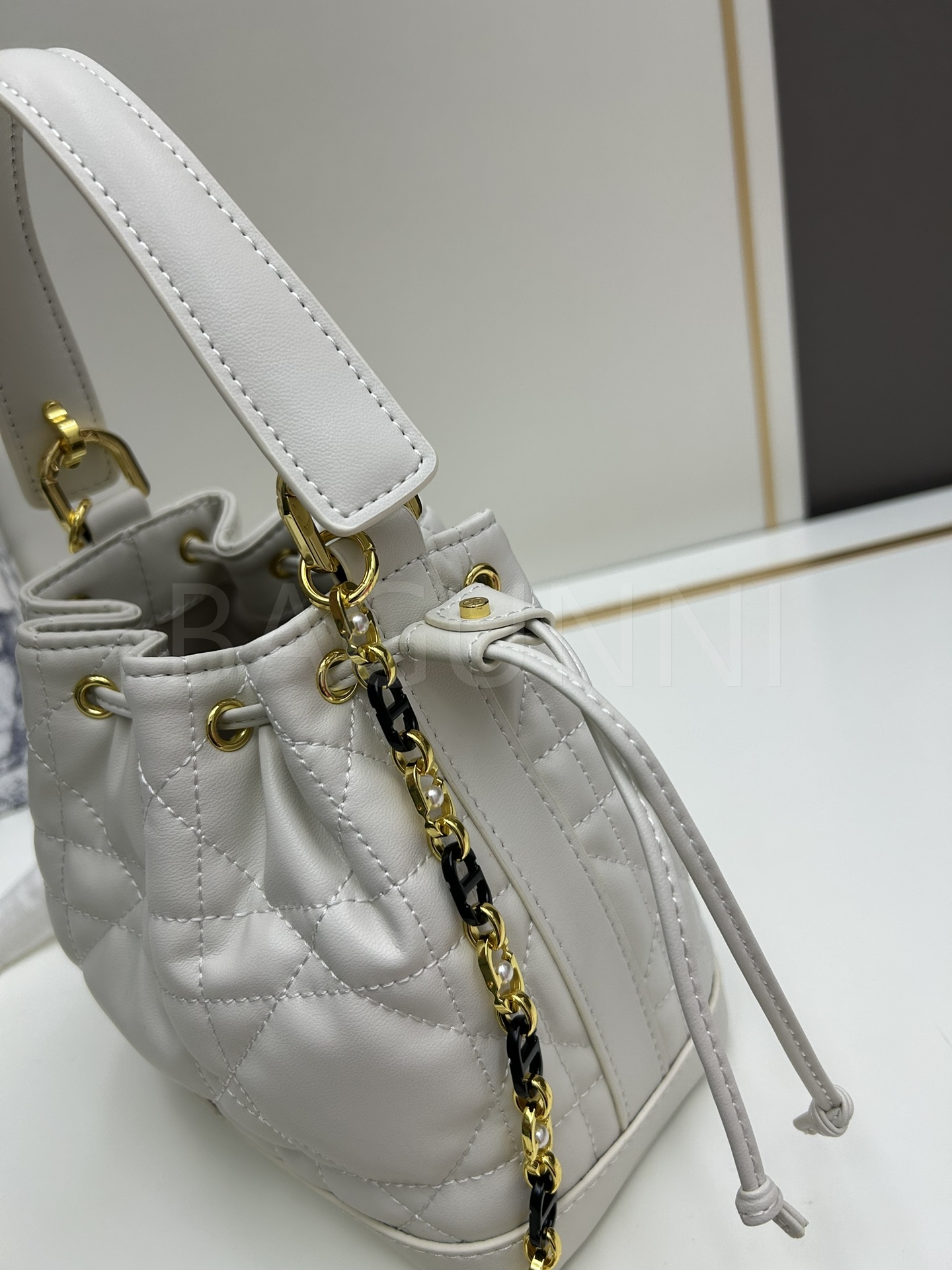디올 졸리 버킷백입니다. 가죽 특유의 질감이 자연스럽게 살아 있으며 화이트, 골드 톤이 어우러져 브랜드 특유의 분위기를 편하게 즐기기 좋습니다.