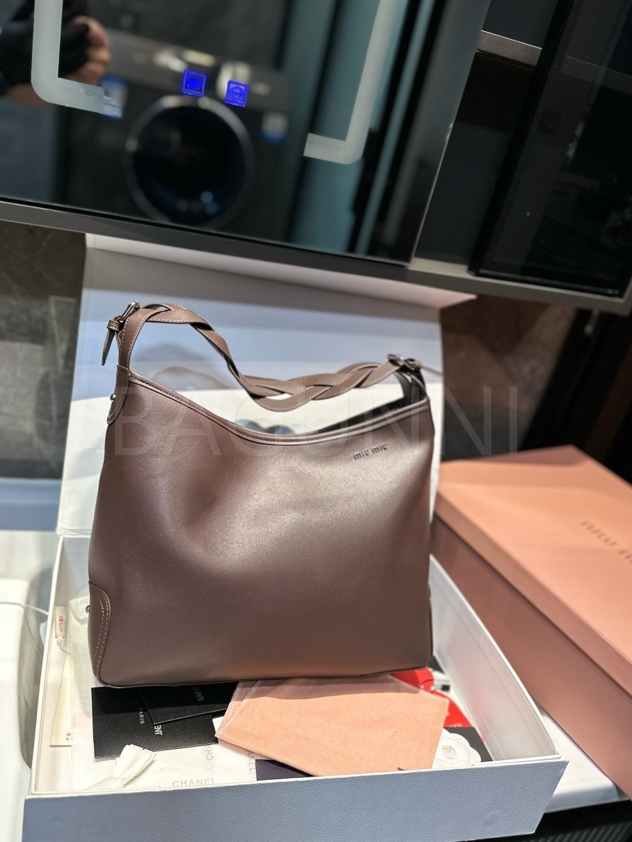 미우미우 워크 토트백입니다. 브라운 톤이 어우러져 브랜드 특유의 분위기를 편하게 즐기기 좋습니다.
