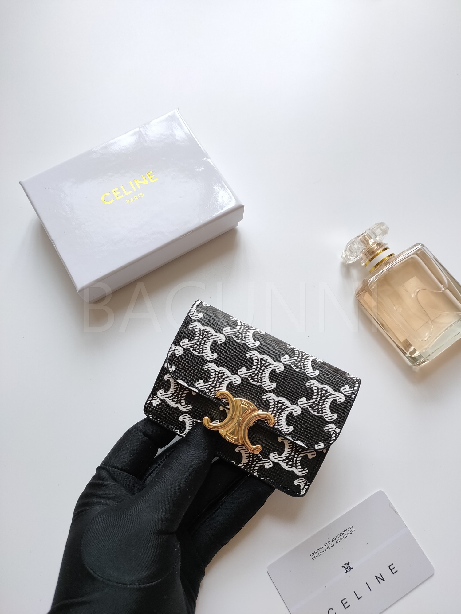 셀린느 특유의 무드가 자연스럽게 살아있는 트리옹프 플랩 카드지갑입니다.
