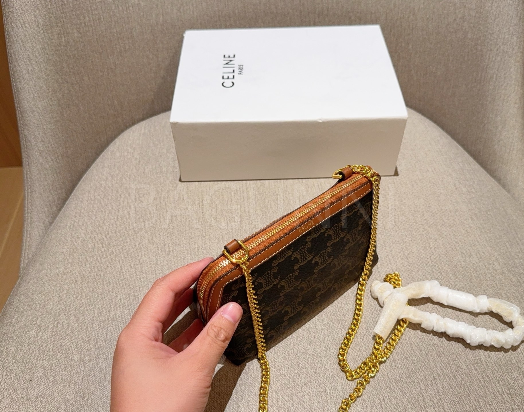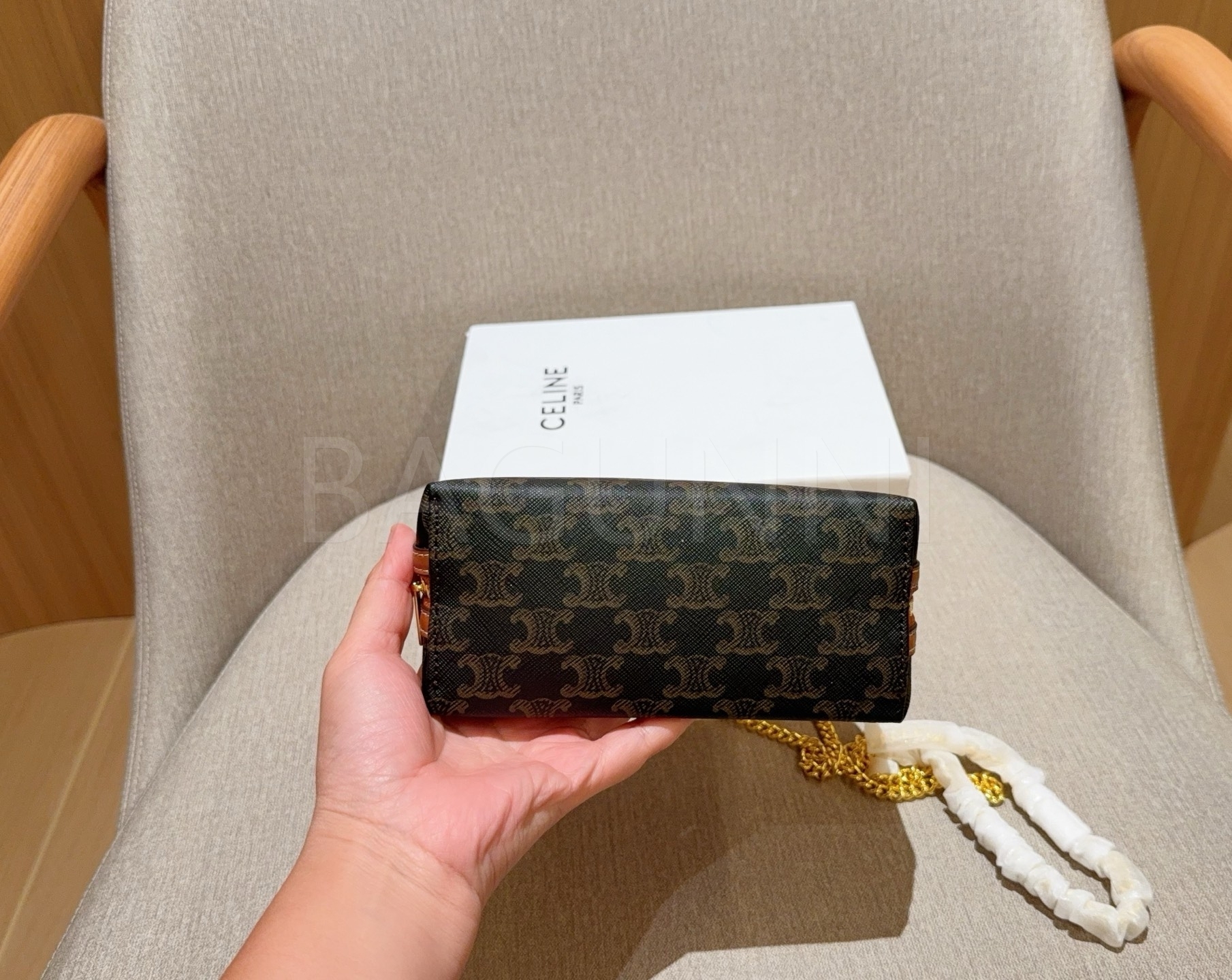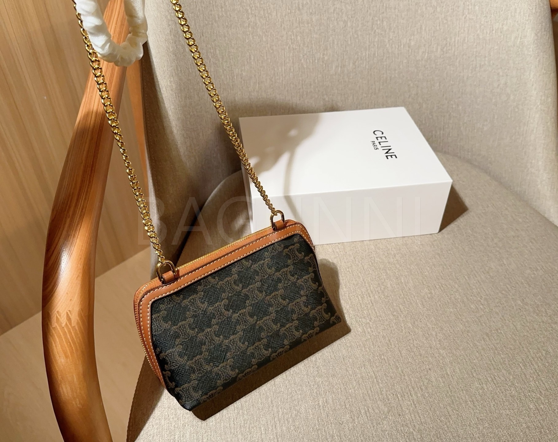 셀린느 트리옹프 체인 클러치입니다. 브랜드 특유의 분위기를 편하게 즐기기 좋습니다.