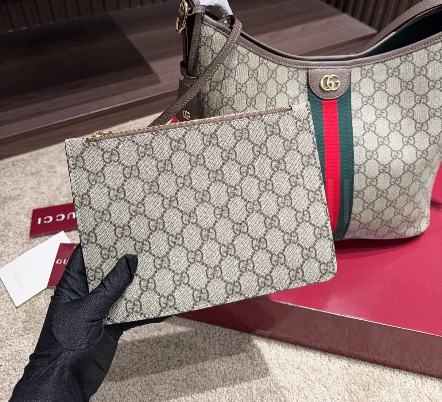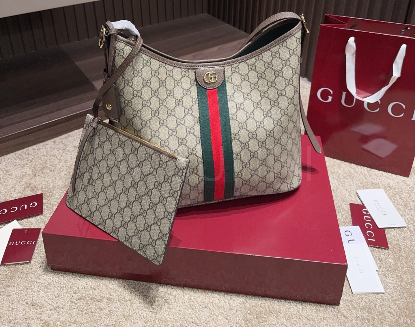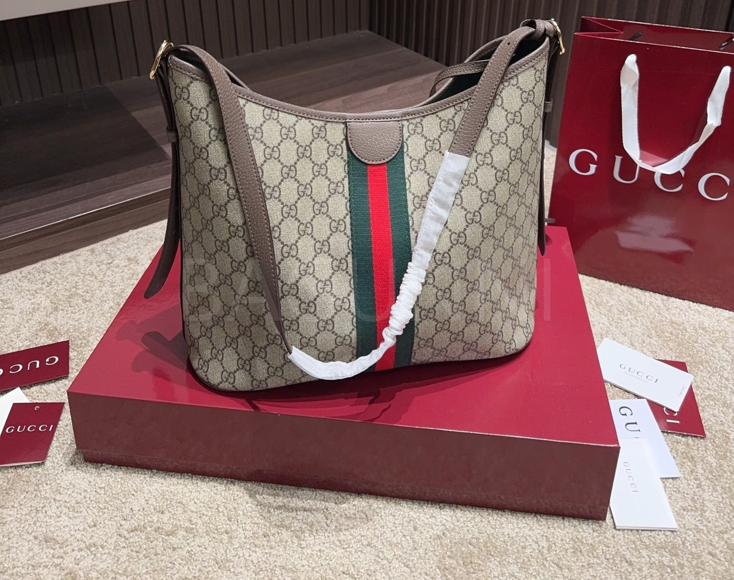 구찌 오피디아 버킷백입니다. 가죽 특유의 질감이 자연스럽게 살아 있으며 베이지 톤이 어우러져 브랜드 특유의 분위기를 편하게 즐기기 좋습니다.