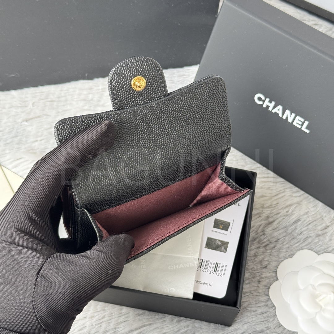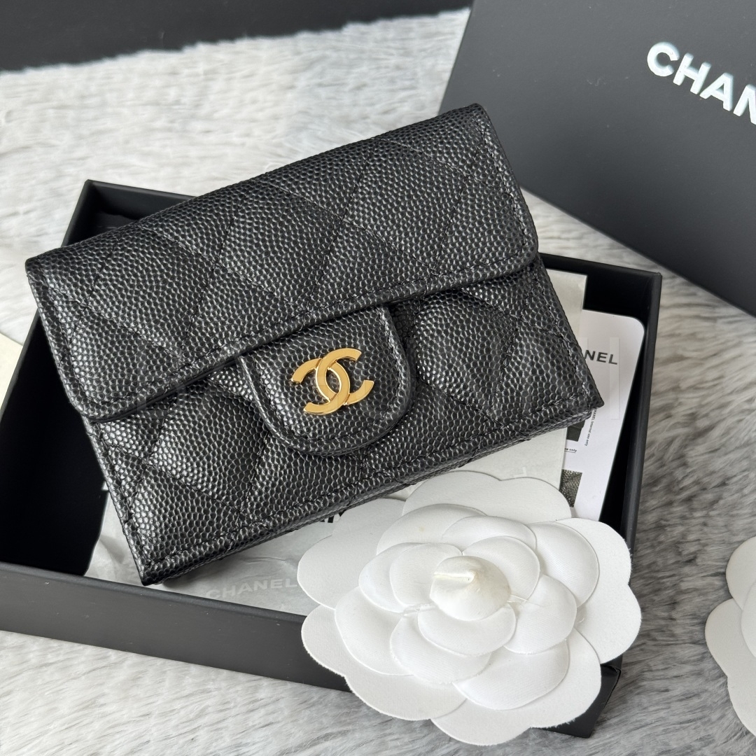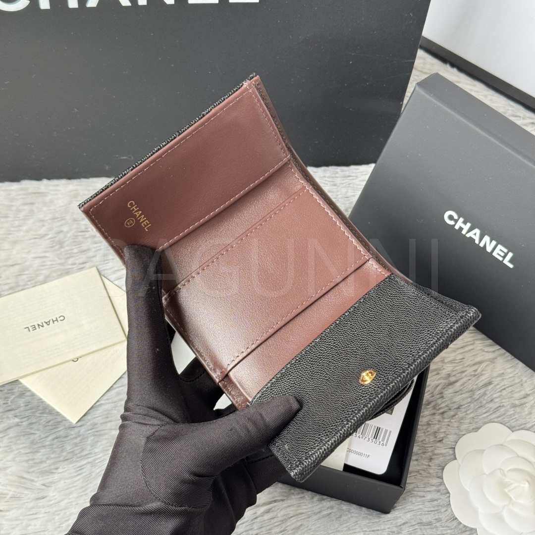 카프스킨의 질감이 돋보이는 샤넬 트리폴드 반지갑입니다.
