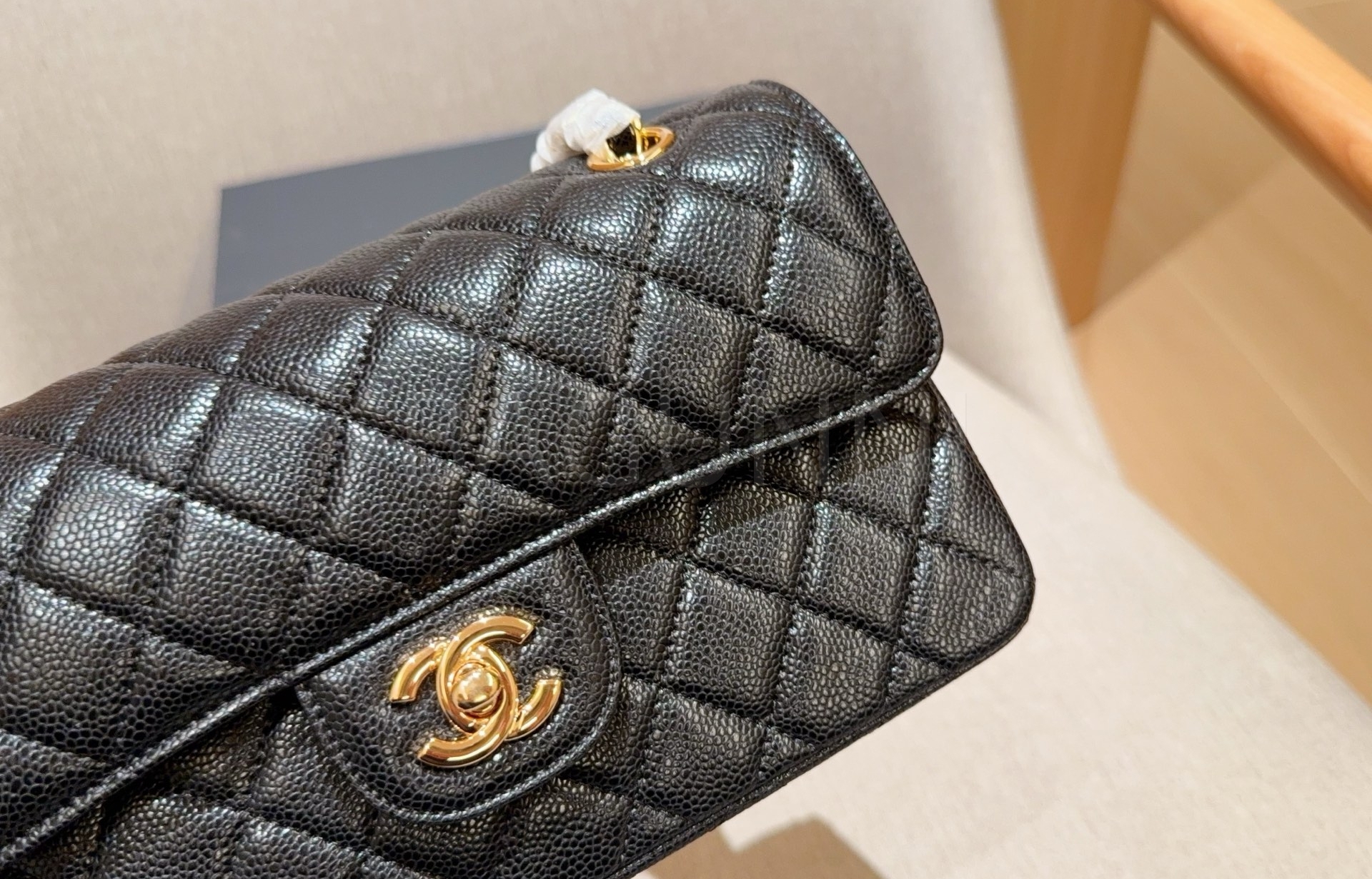 캐비어 가죽 특유의 매력이 돋보이는 샤넬 클래식 플랩 백입니다.