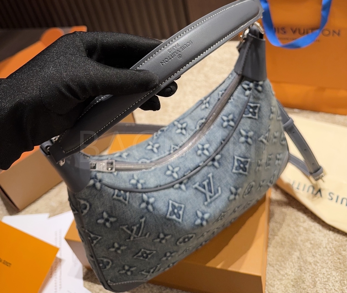 데님 특유의 캐주얼한 무드가 돋보이는 루이비통 데님 숄더백입니다.