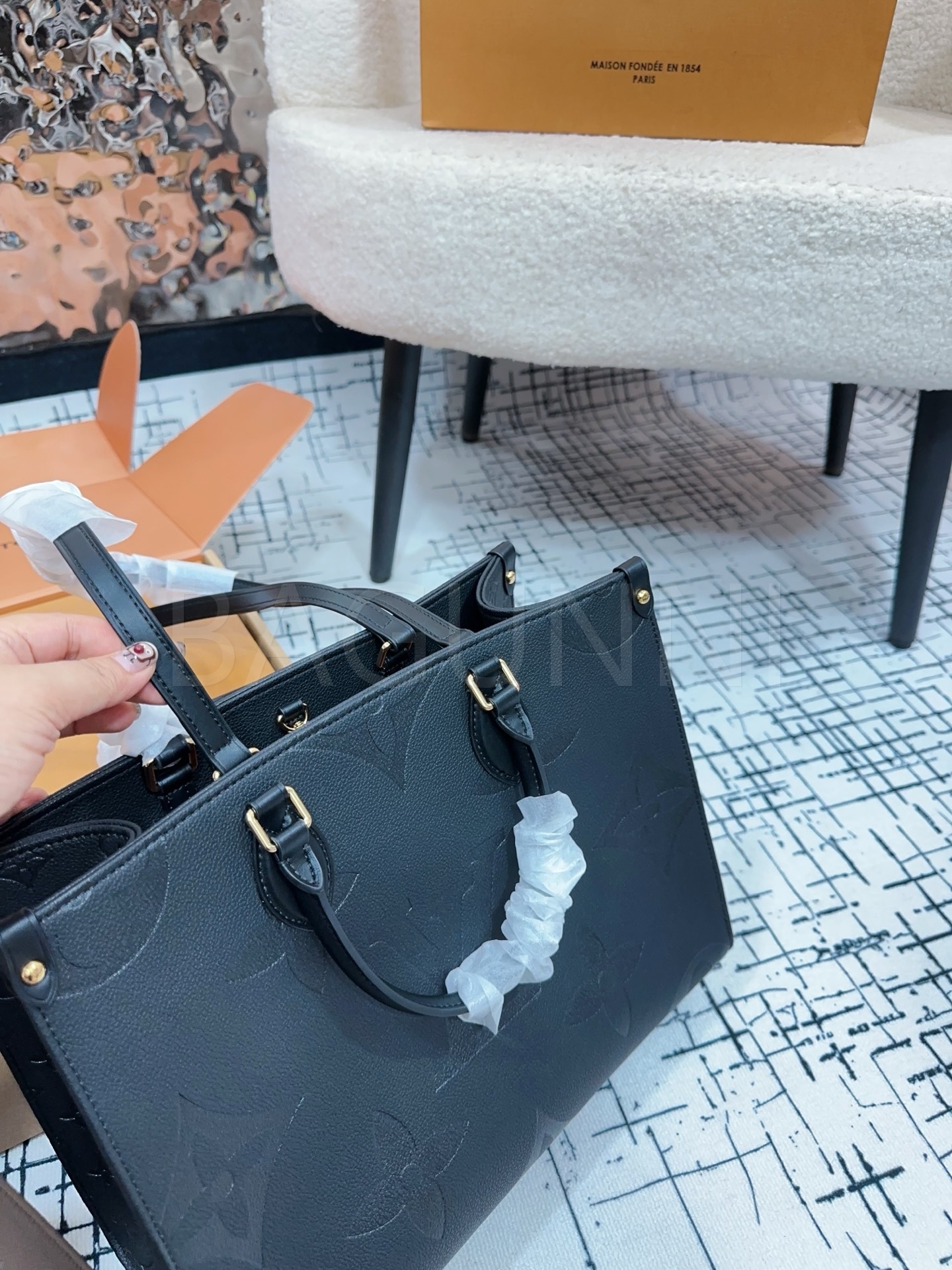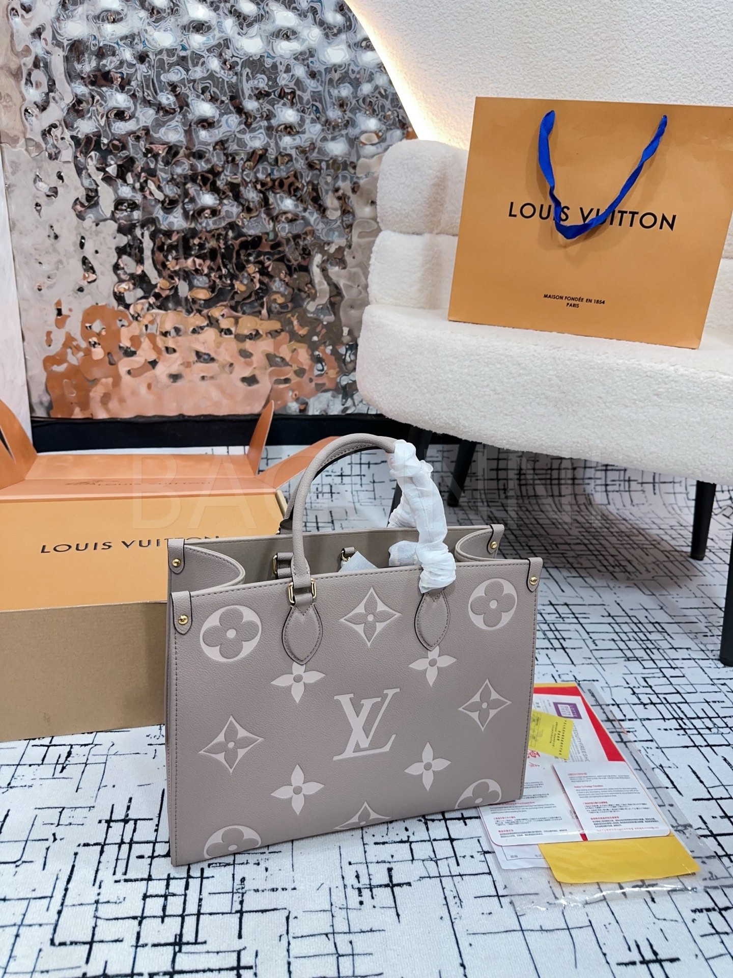 가죽 소재의 매력이 자연스럽게 살아 있는 루이비통 온더고 토트백입니다.