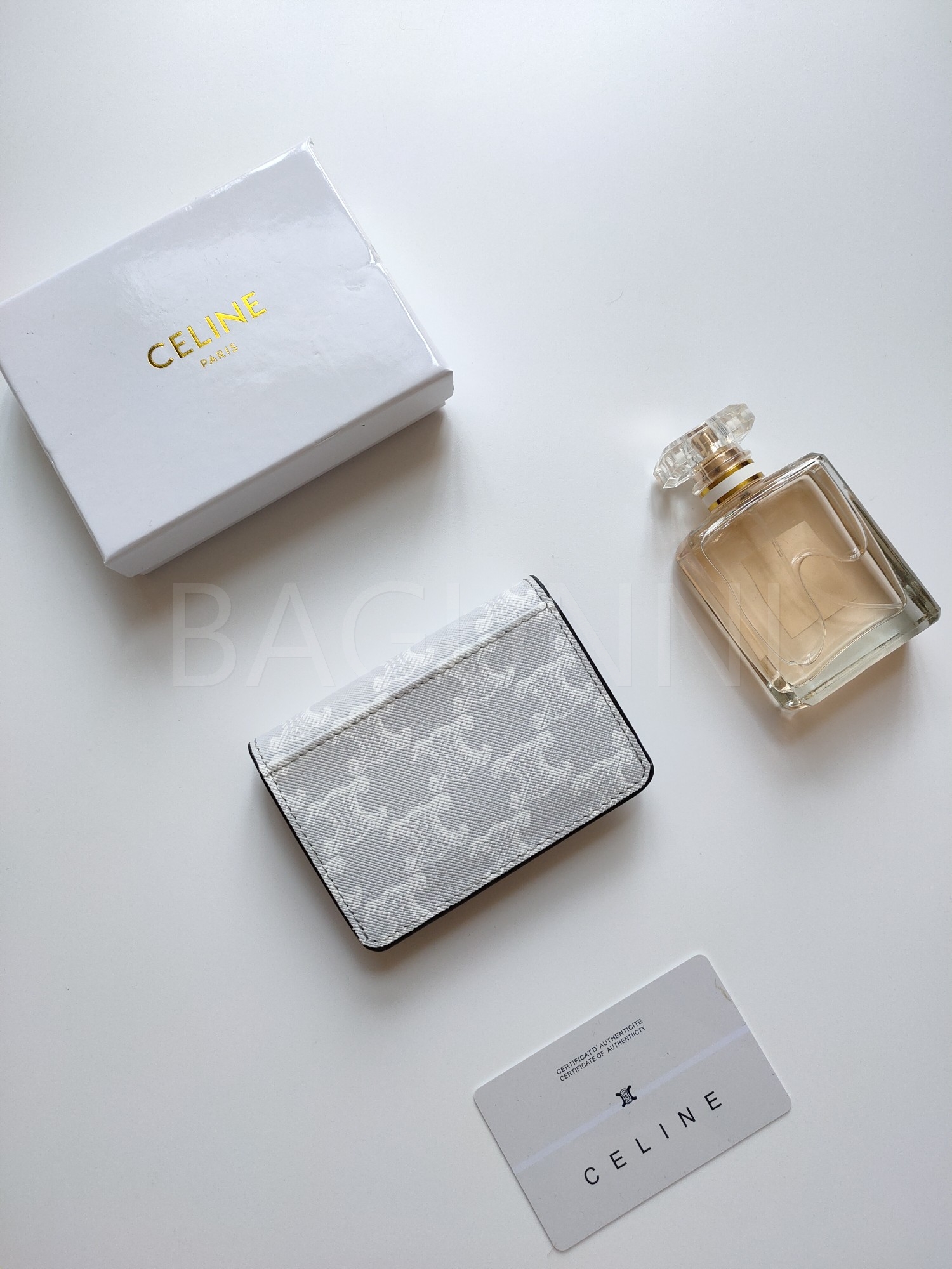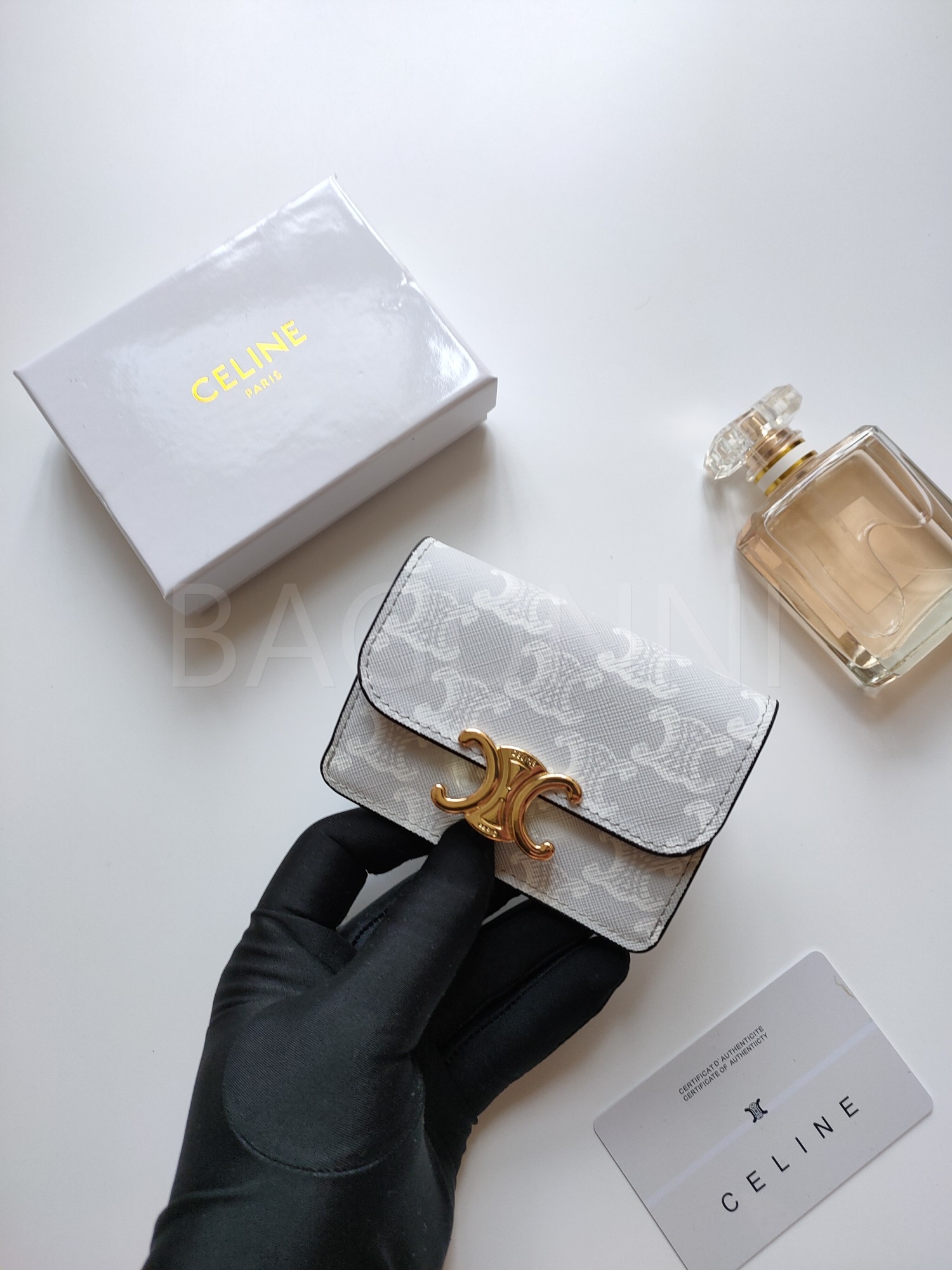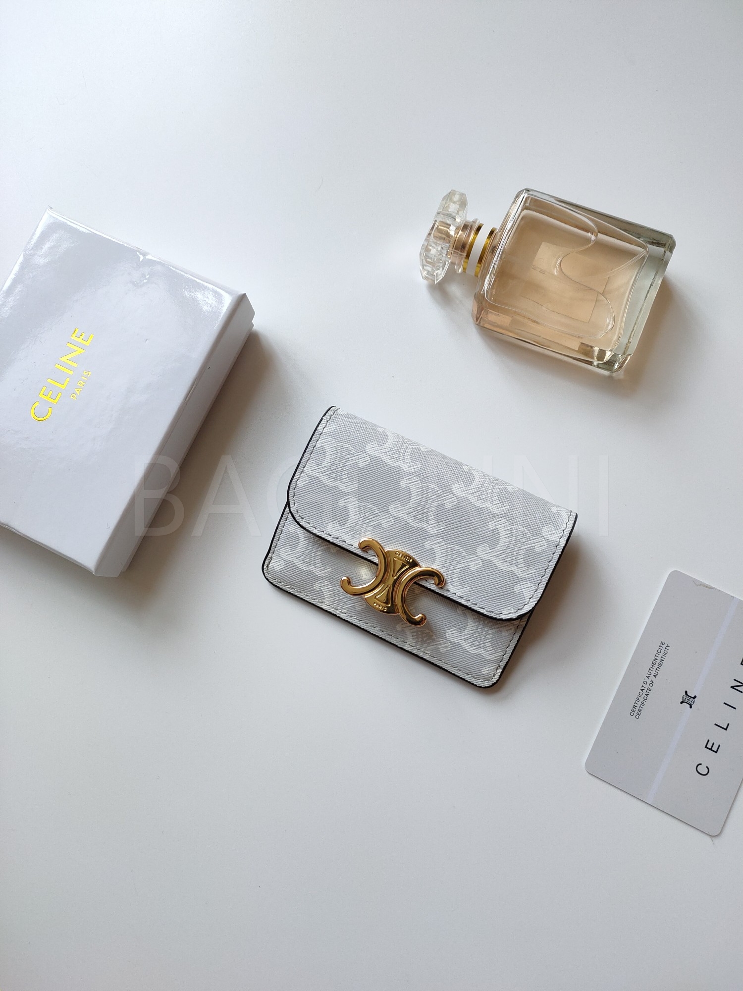 셀린느 특유의 무드가 자연스럽게 살아있는 트리옹프 플랩 카드지갑입니다.