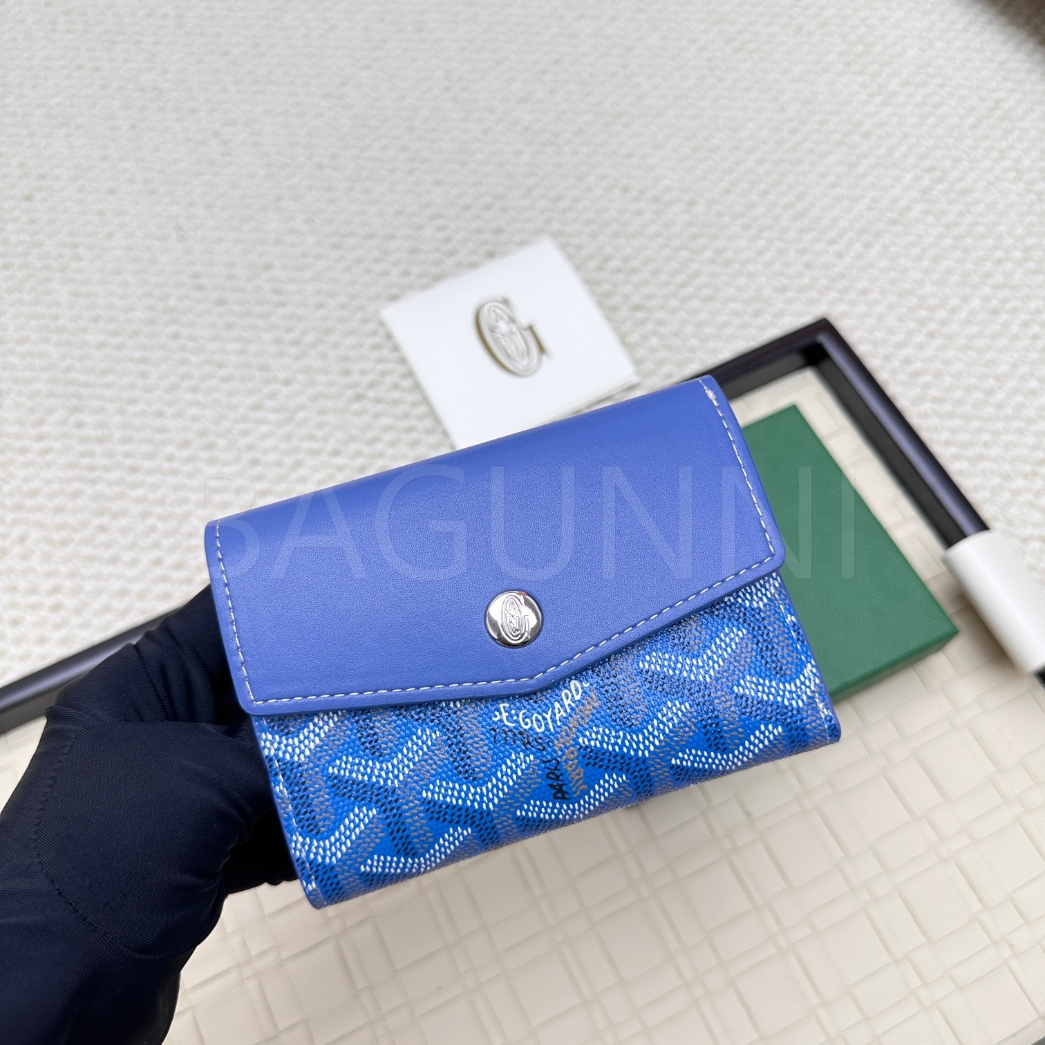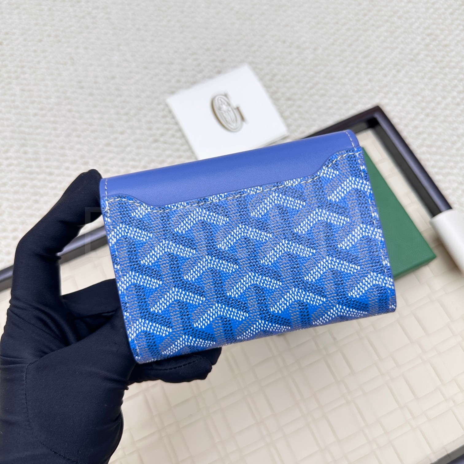 고야드 트리폴드 카드지갑 특유의 분위기가 자연스럽게 드러나는 디자인입니다.