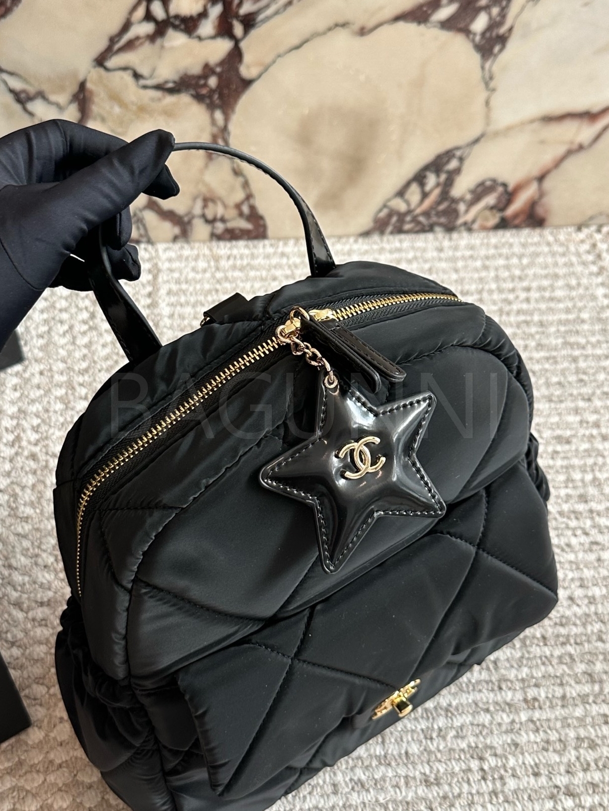 샤넬 퀼팅 스타 참 백팩은 세련된 실루엣을 담은 아이템입니다.