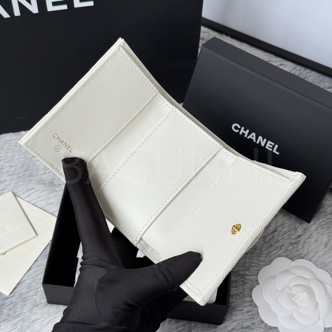 카프스킨의 질감이 돋보이는 샤넬 트리폴드 반지갑입니다.