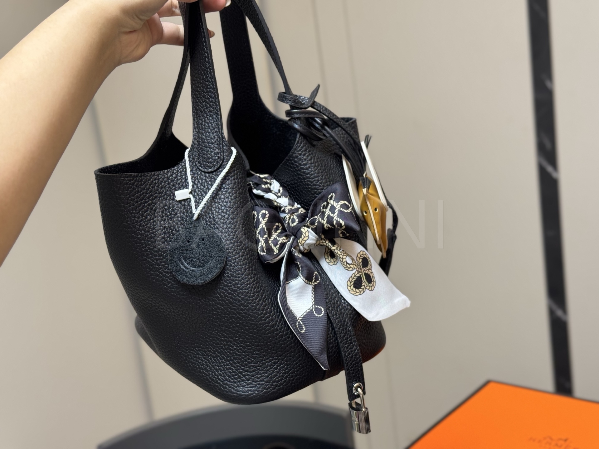 에르메스 피코탄 락 버킷백입니다. 가죽 특유의 질감이 자연스럽게 살아 있으며 브랜드 특유의 분위기를 편하게 즐기기 좋습니다.