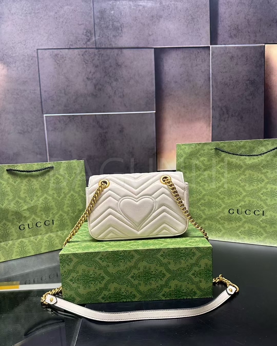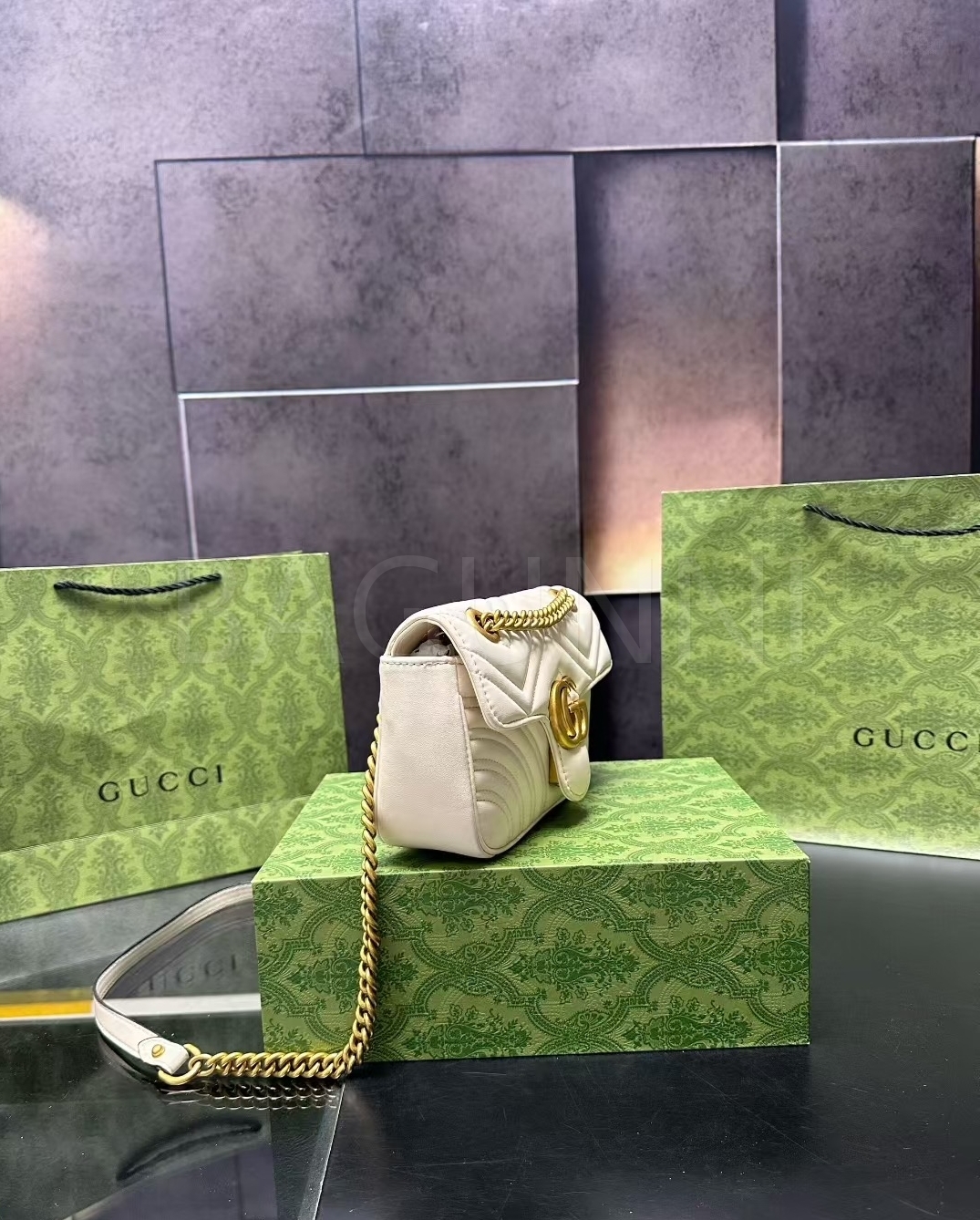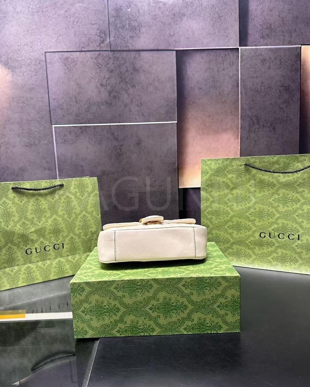 구찌 마몬트 체인백입니다. 가죽 특유의 질감이 자연스럽게 살아 있으며 화이트, 골드 톤이 어우러져 브랜드 특유의 분위기를 편하게 즐기기 좋습니다.