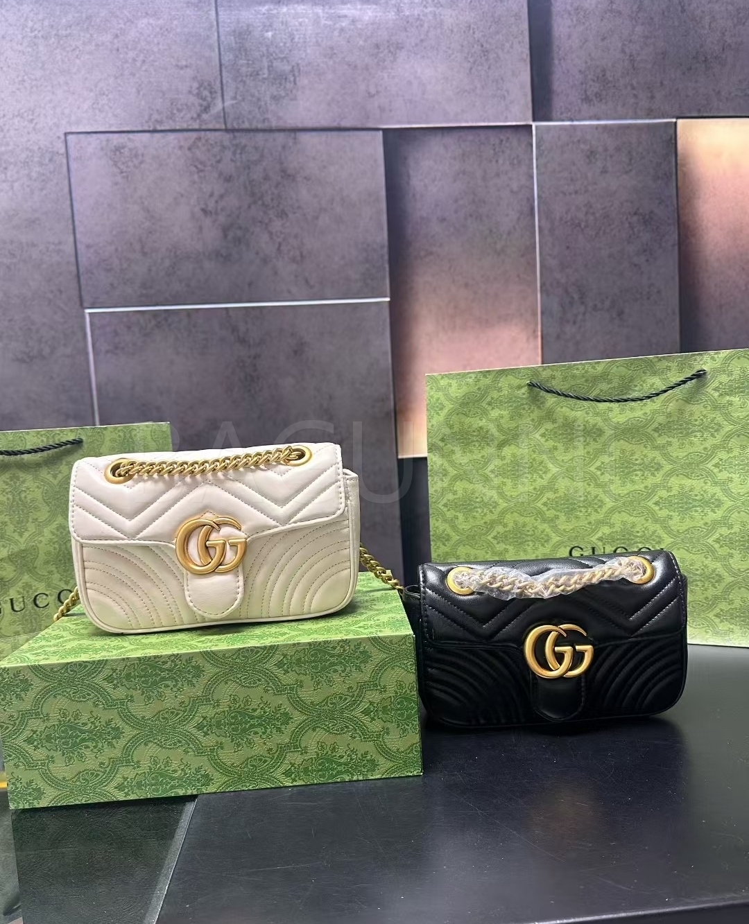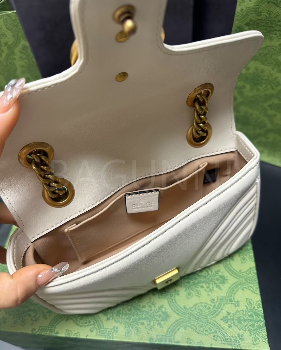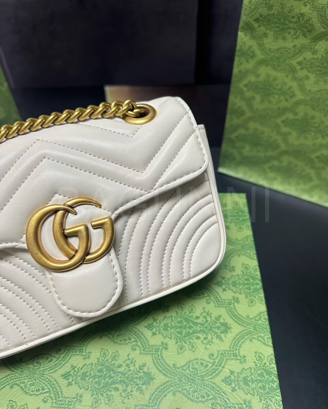 구찌 마몬트 체인백입니다. 가죽 특유의 질감이 자연스럽게 살아 있으며 화이트, 골드 톤이 어우러져 브랜드 특유의 분위기를 편하게 즐기기 좋습니다.
