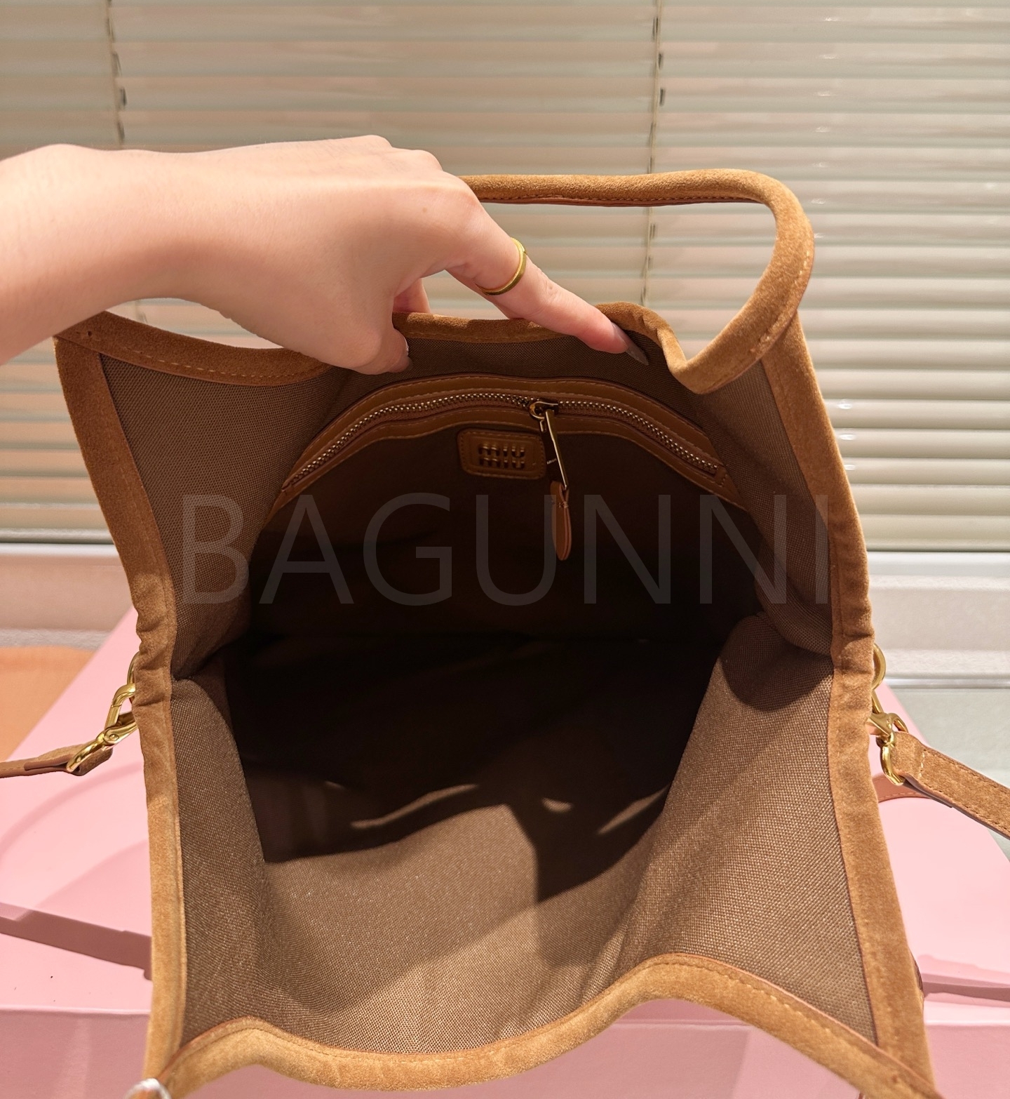 미우미우 스웨이드 토트백입니다. 스웨이드 특유의 질감이 자연스럽게 살아 있으며 브랜드 특유의 분위기를 편하게 즐기기 좋습니다.