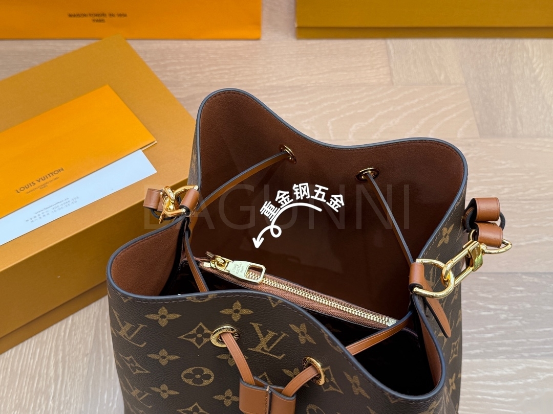모노그램 패턴, 버킷 실루엣, 여유 있는 수납력 디테일이 조화롭게 어우러져 완성도를 높여줍니다 필수 소지품을 여유 있게 수납하기 좋습니다