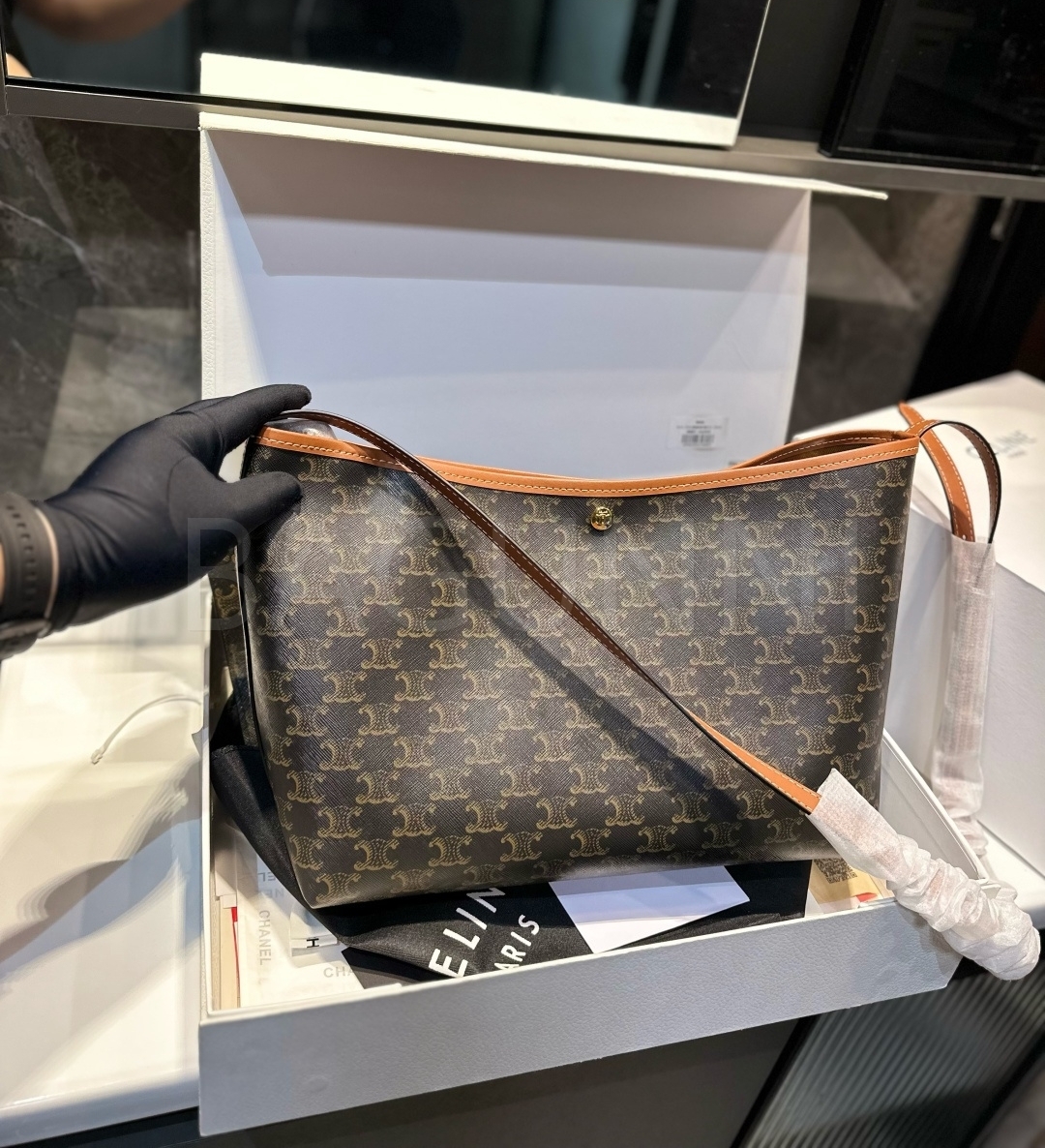 셀린느 트리옹프 숄더백입니다. 가죽 특유의 질감이 자연스럽게 살아 있으며 브랜드 특유의 분위기를 편하게 즐기기 좋습니다.