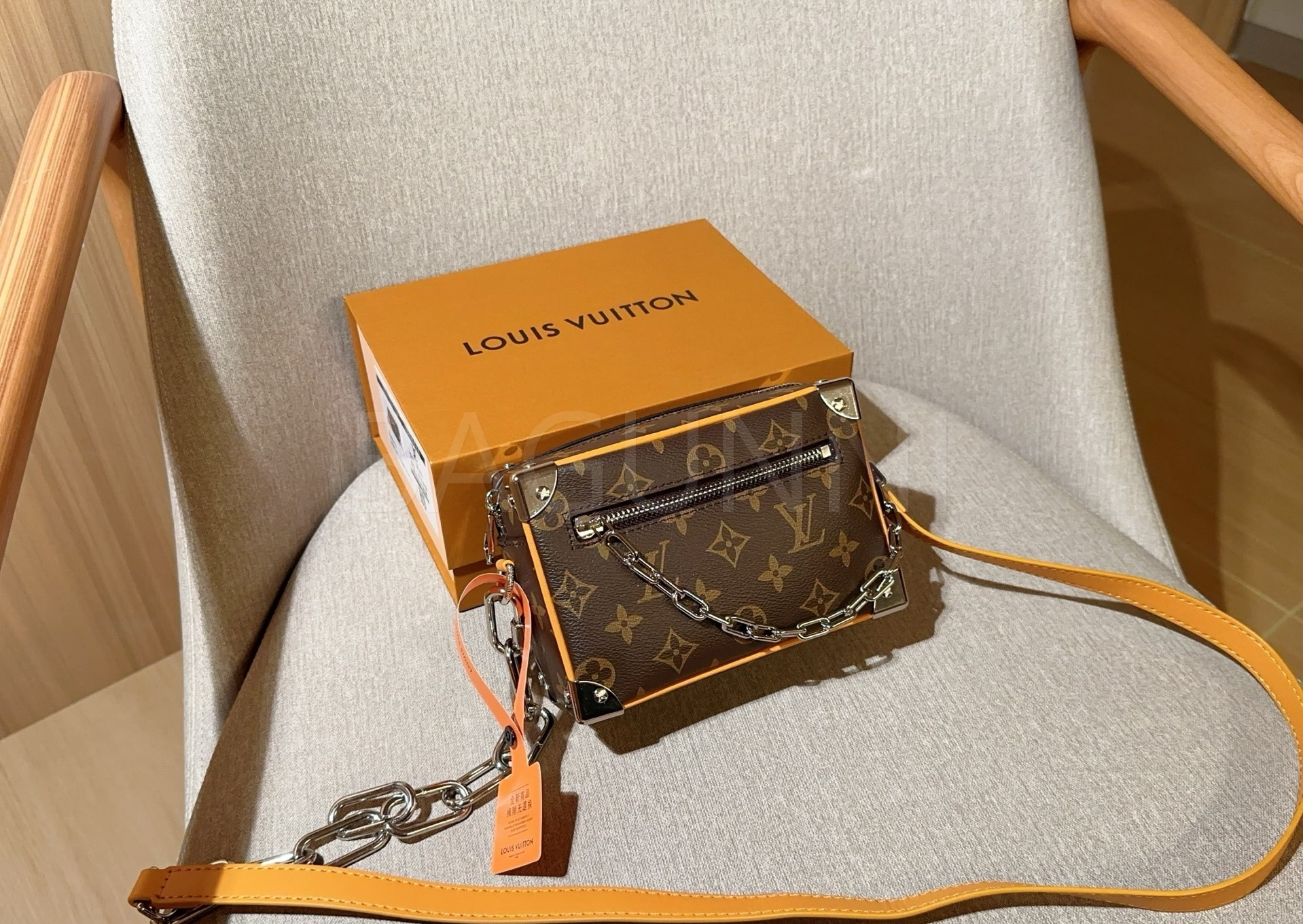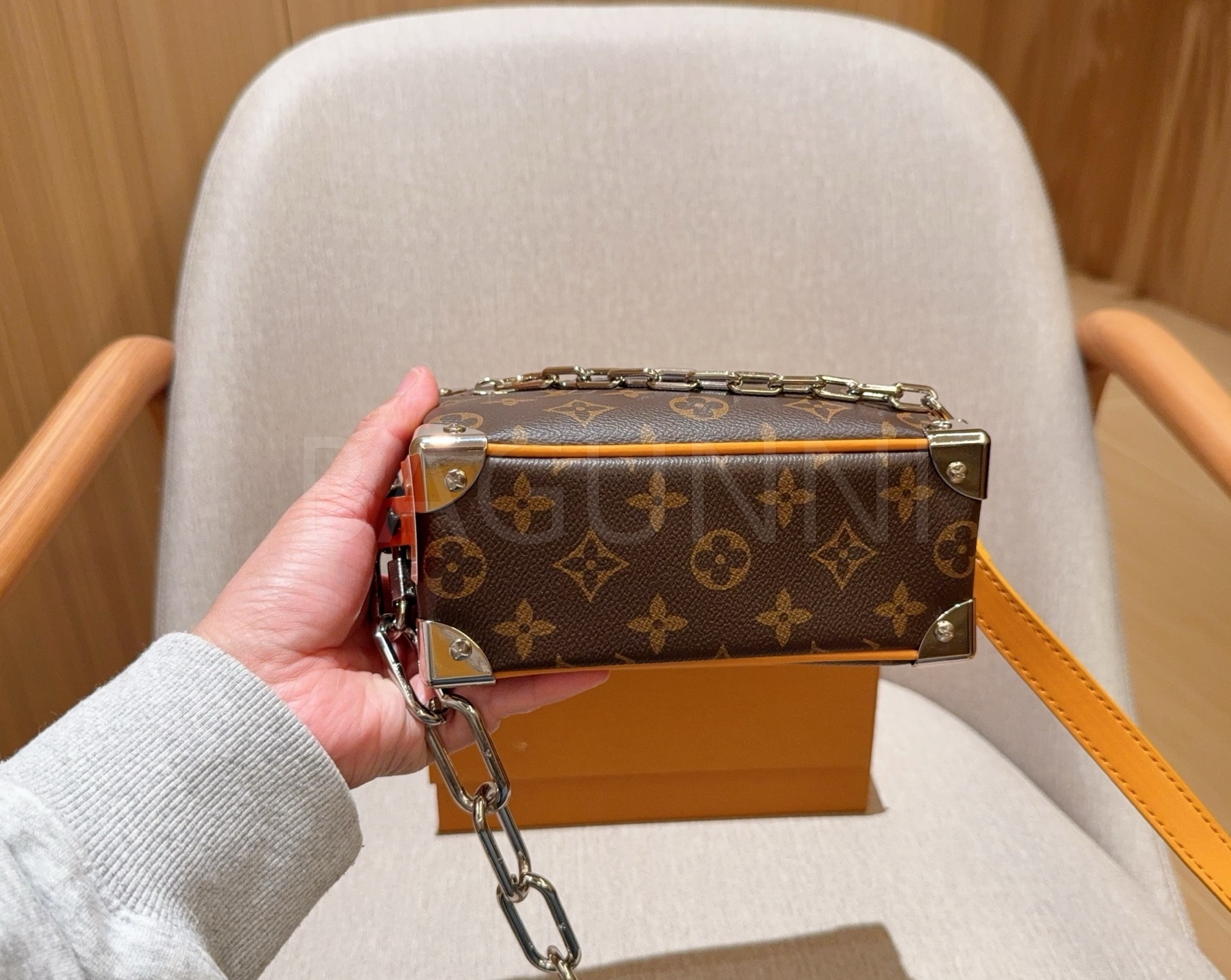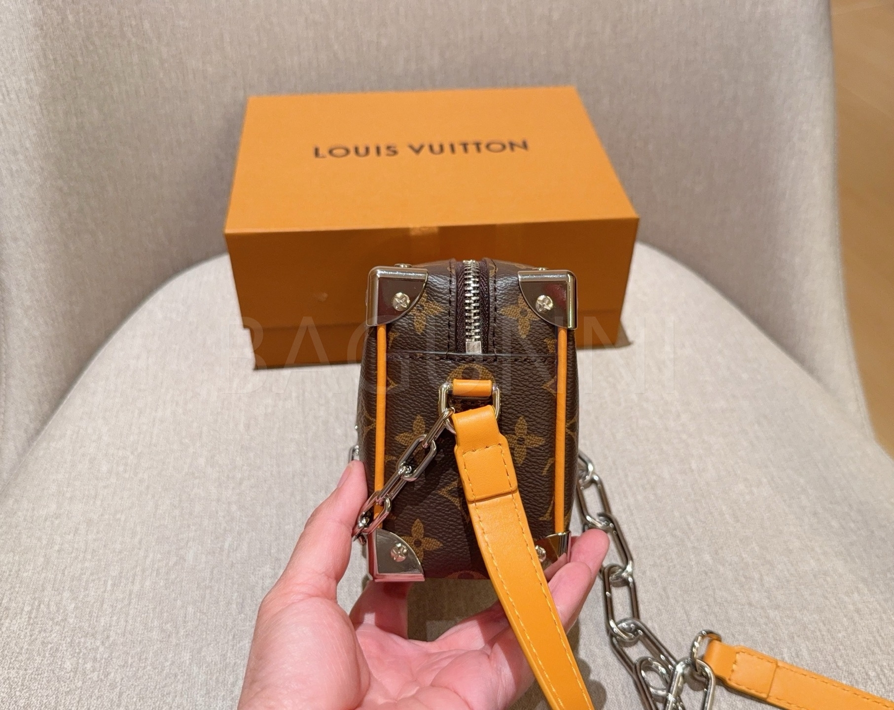 체인 스트랩, 박스 실루엣 디테일이 조화롭게 어우러져 완성도를 높여줍니다