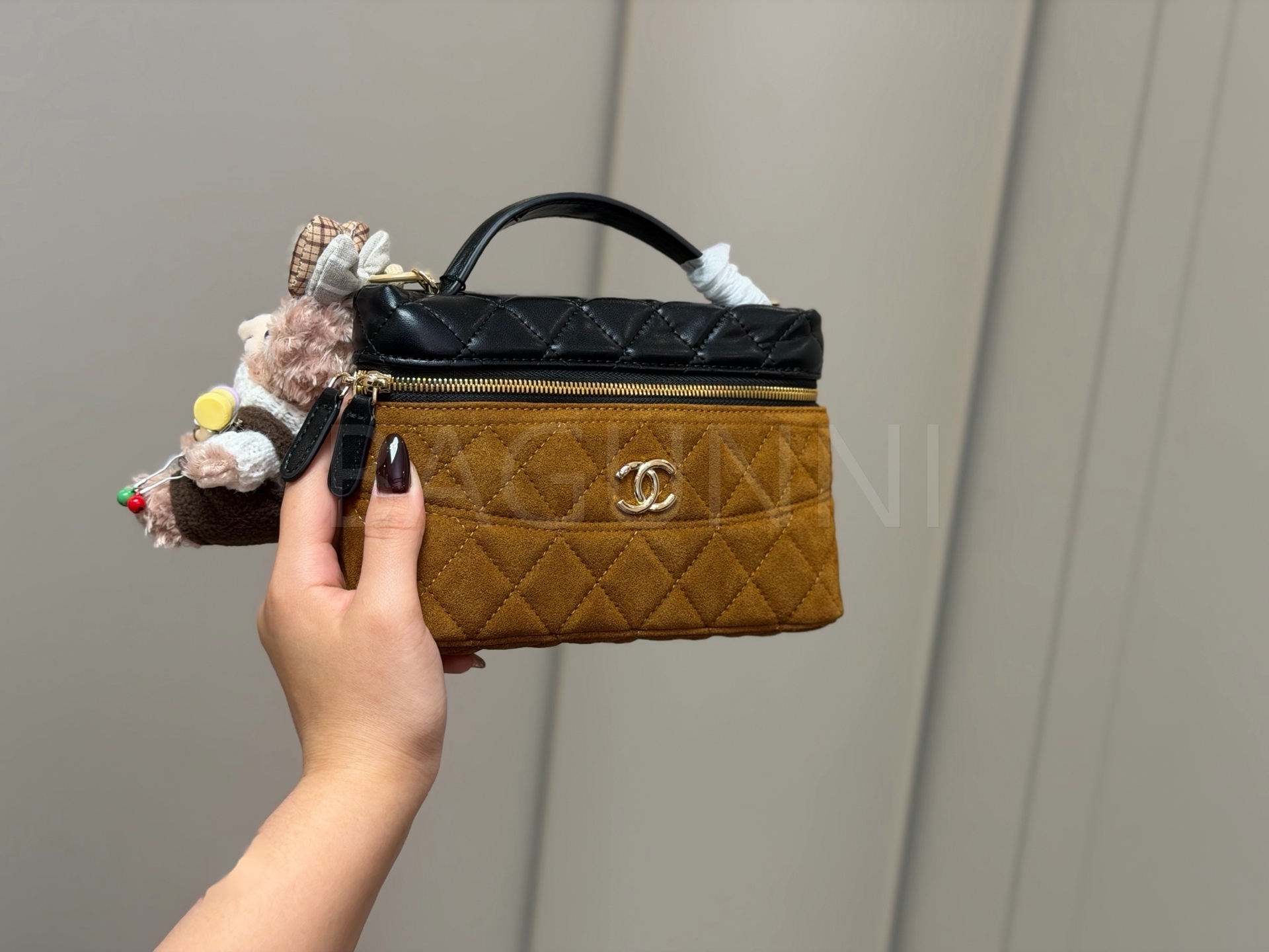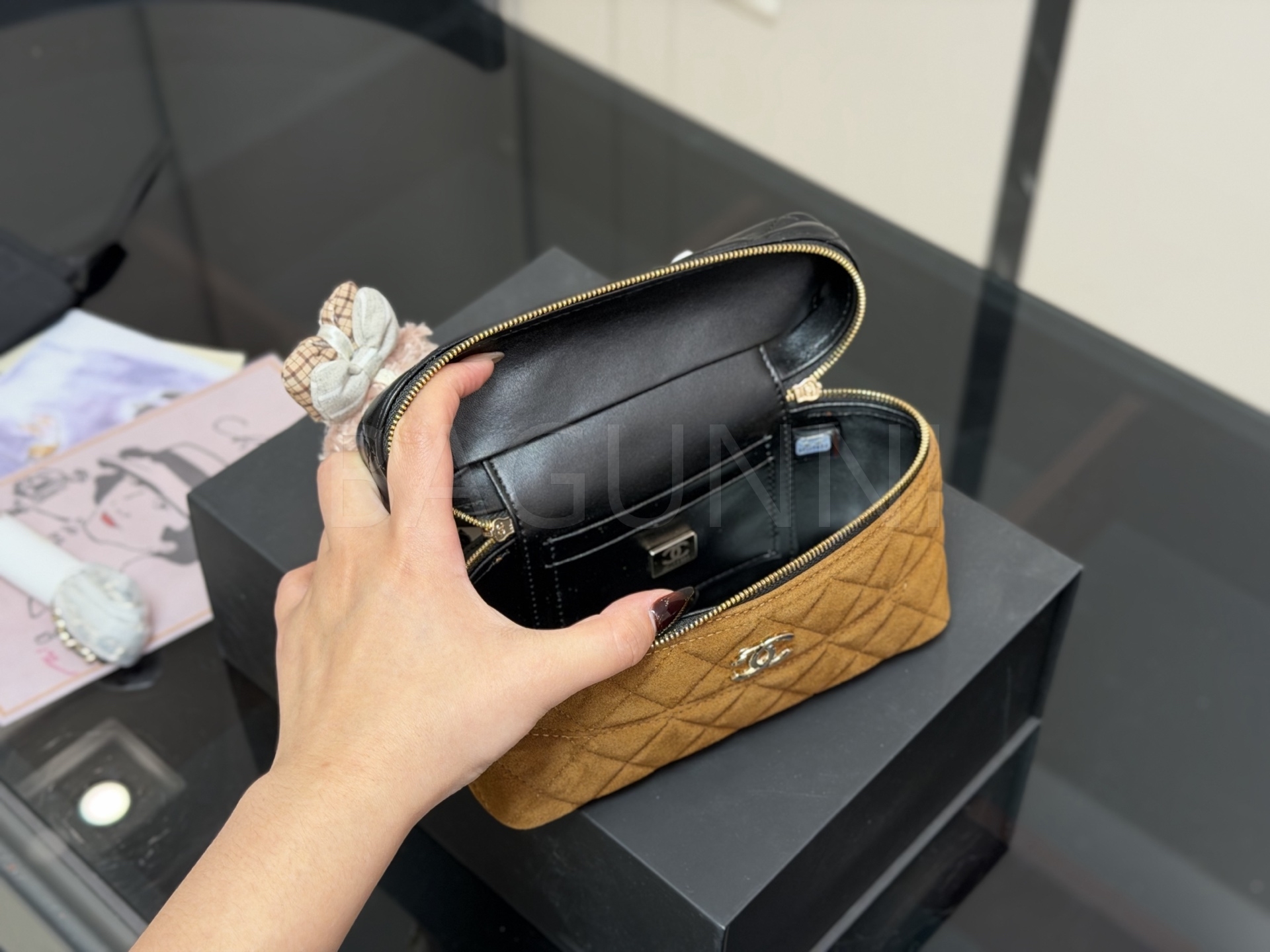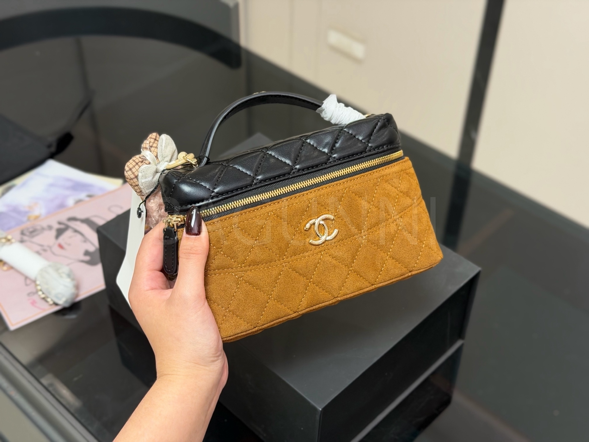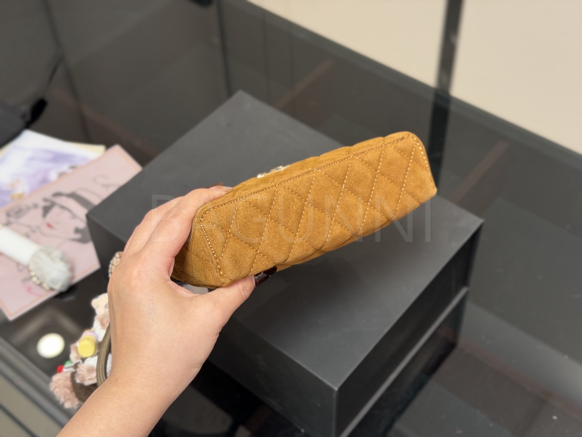 스웨이드 특유의 매력이 돋보이는 샤넬 박스 체인 백입니다.