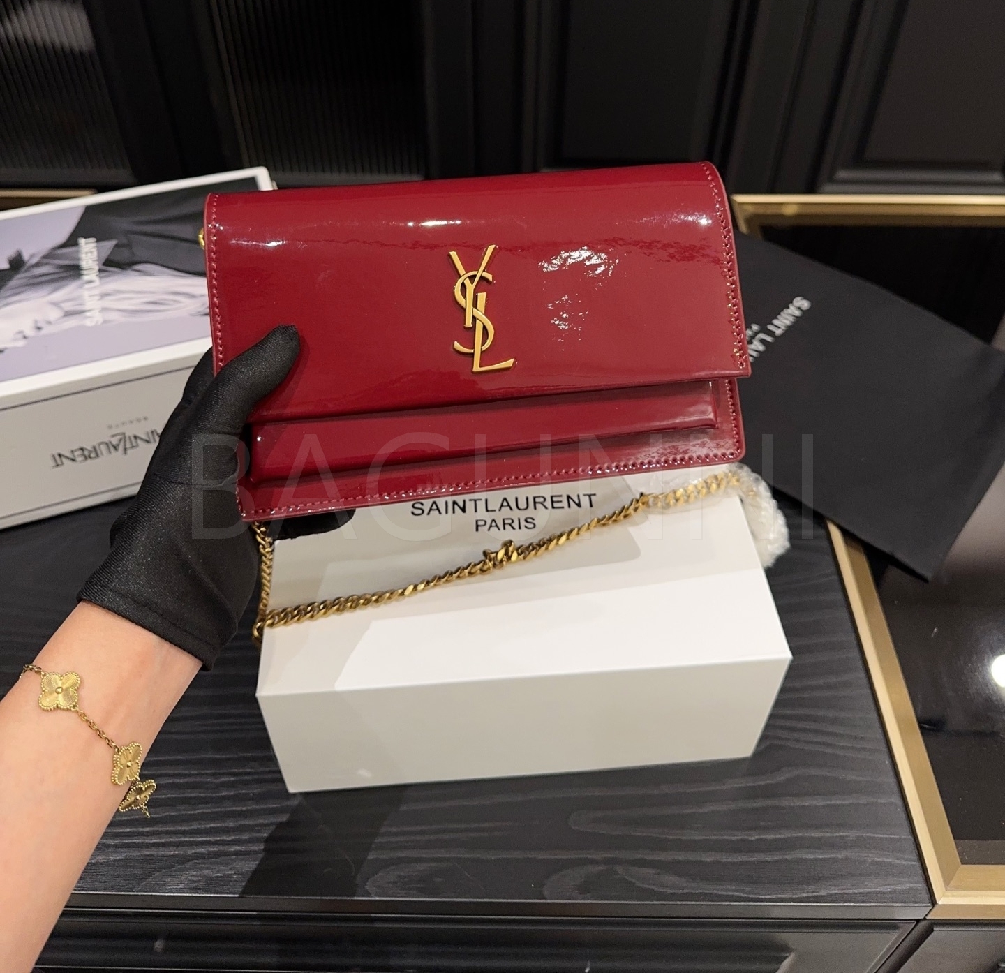YSL 선셋 숄더백입니다. 페이턴트 가죽 특유의 질감이 자연스럽게 살아 있으며 브랜드 특유의 분위기를 편하게 즐기기 좋습니다.