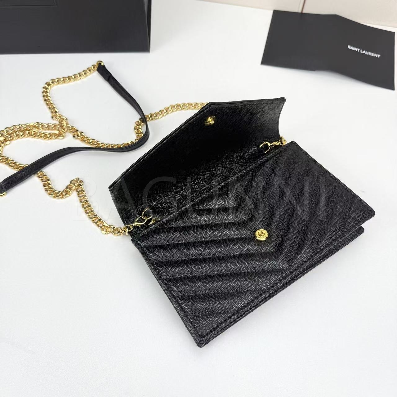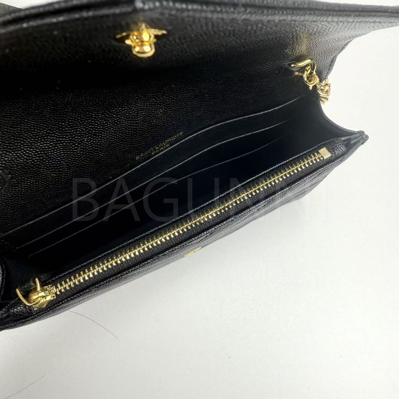 카프스킨의 질감이 돋보이는 YSL 모노그램 체인 지갑입니다.