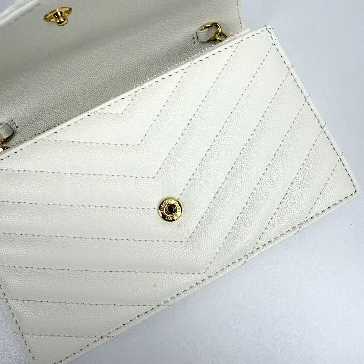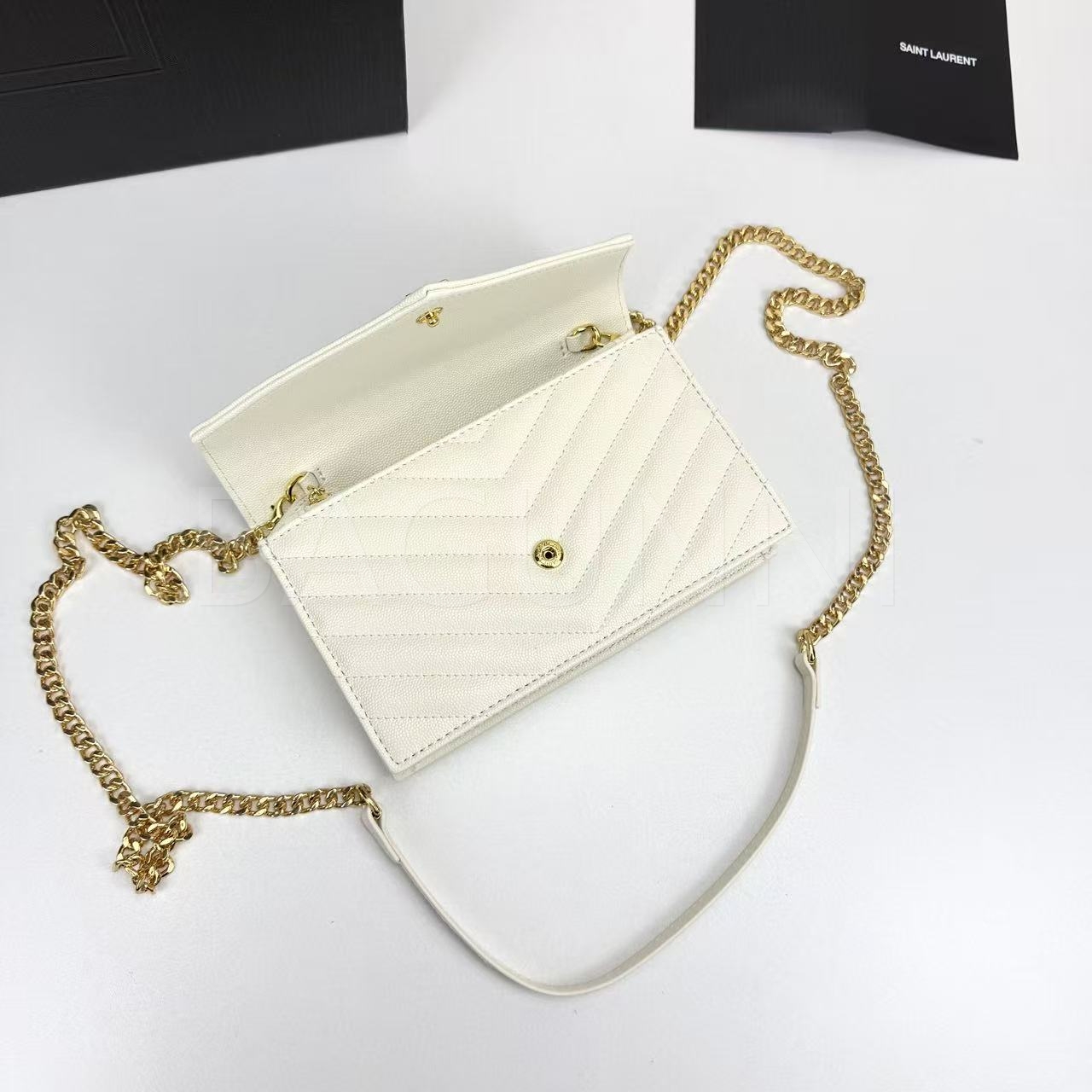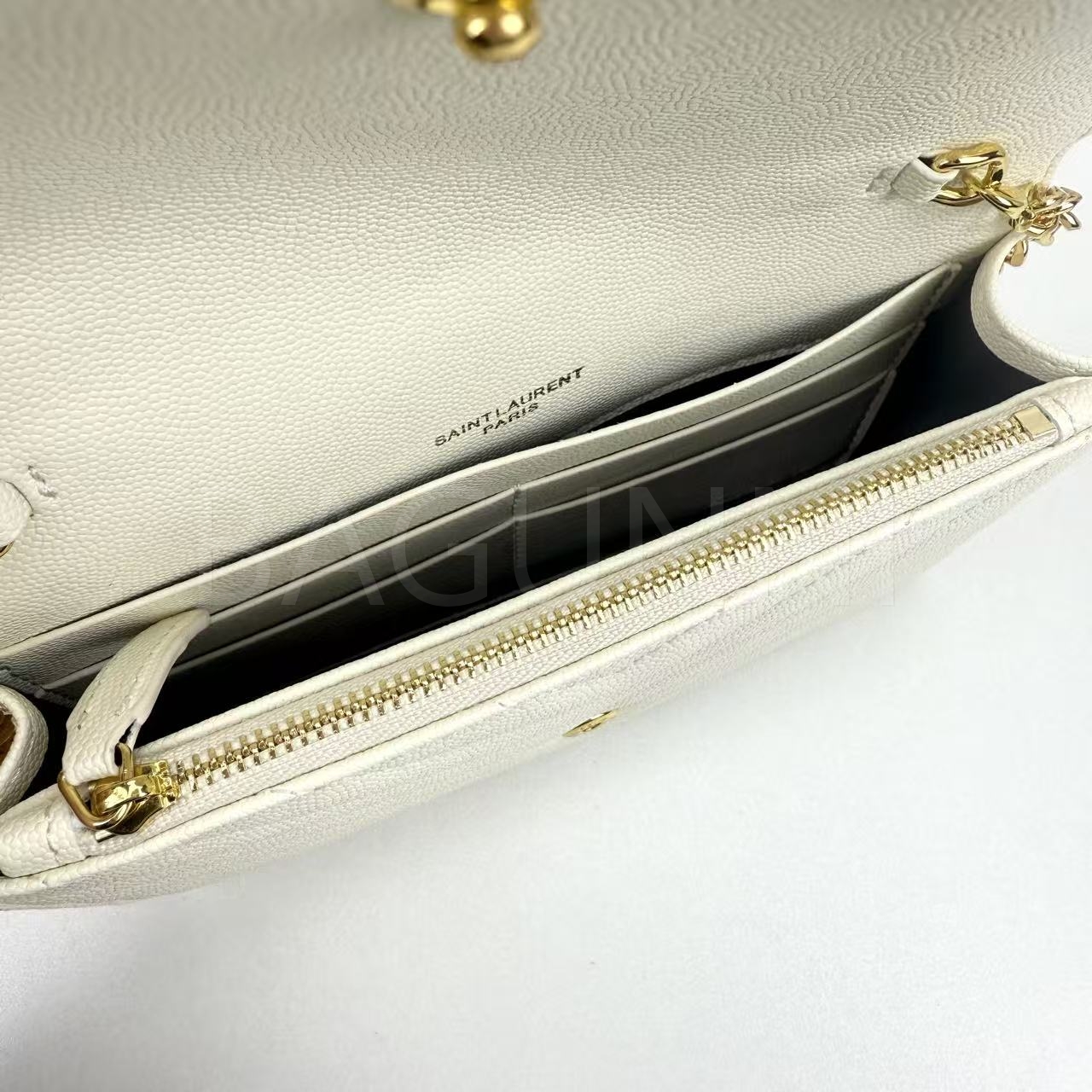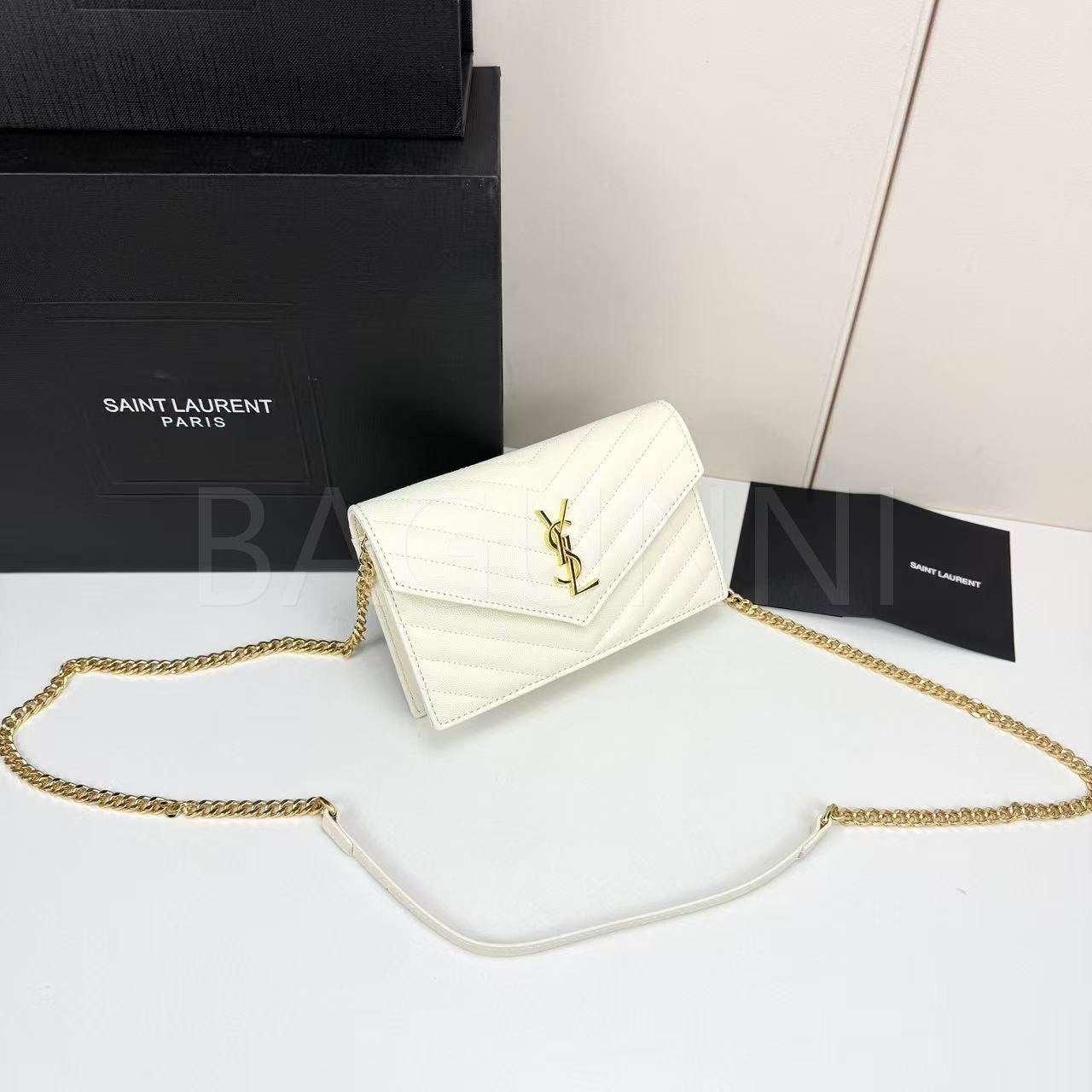 카프스킨의 질감이 돋보이는 YSL 모노그램 체인 지갑입니다.