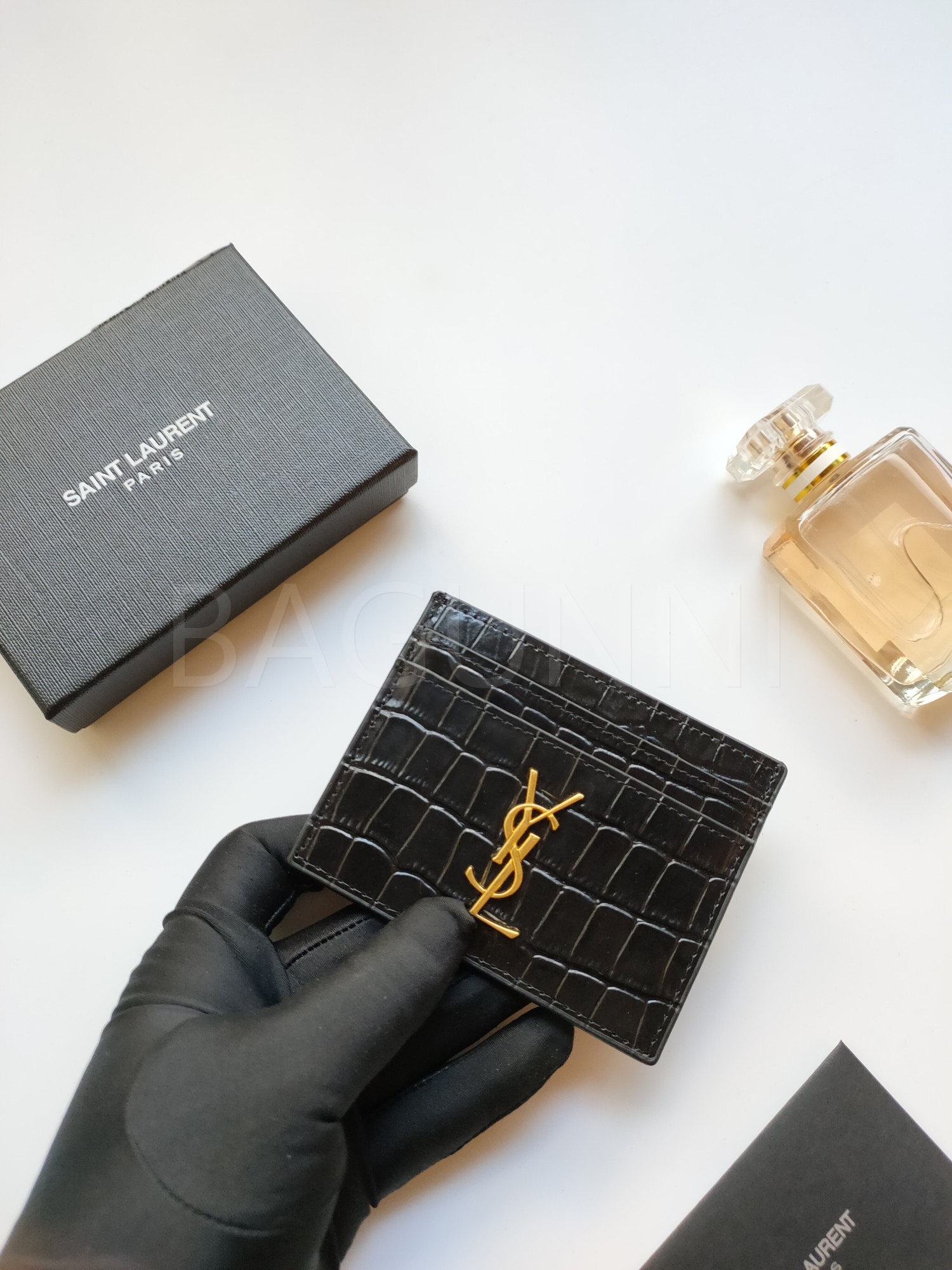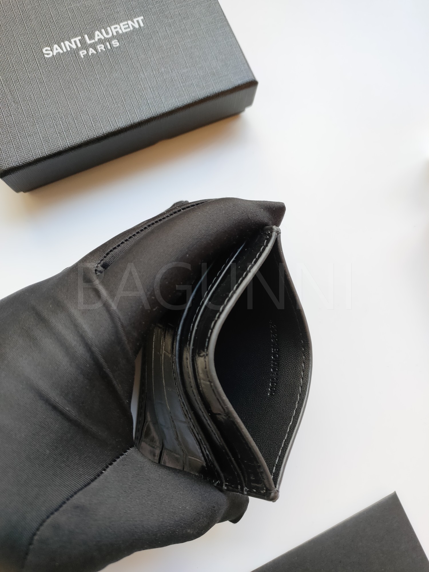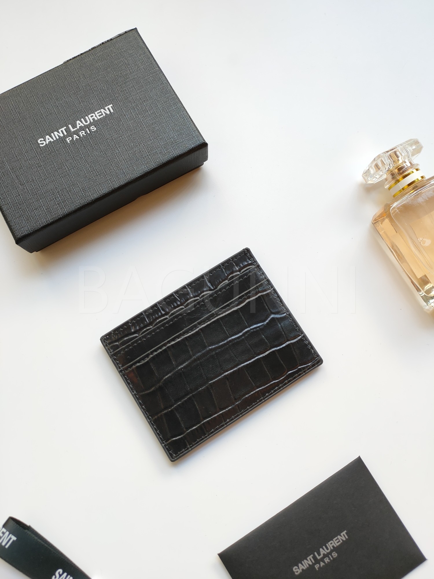 카프스킨의 질감이 돋보이는 YSL 플랩 카드지갑입니다.