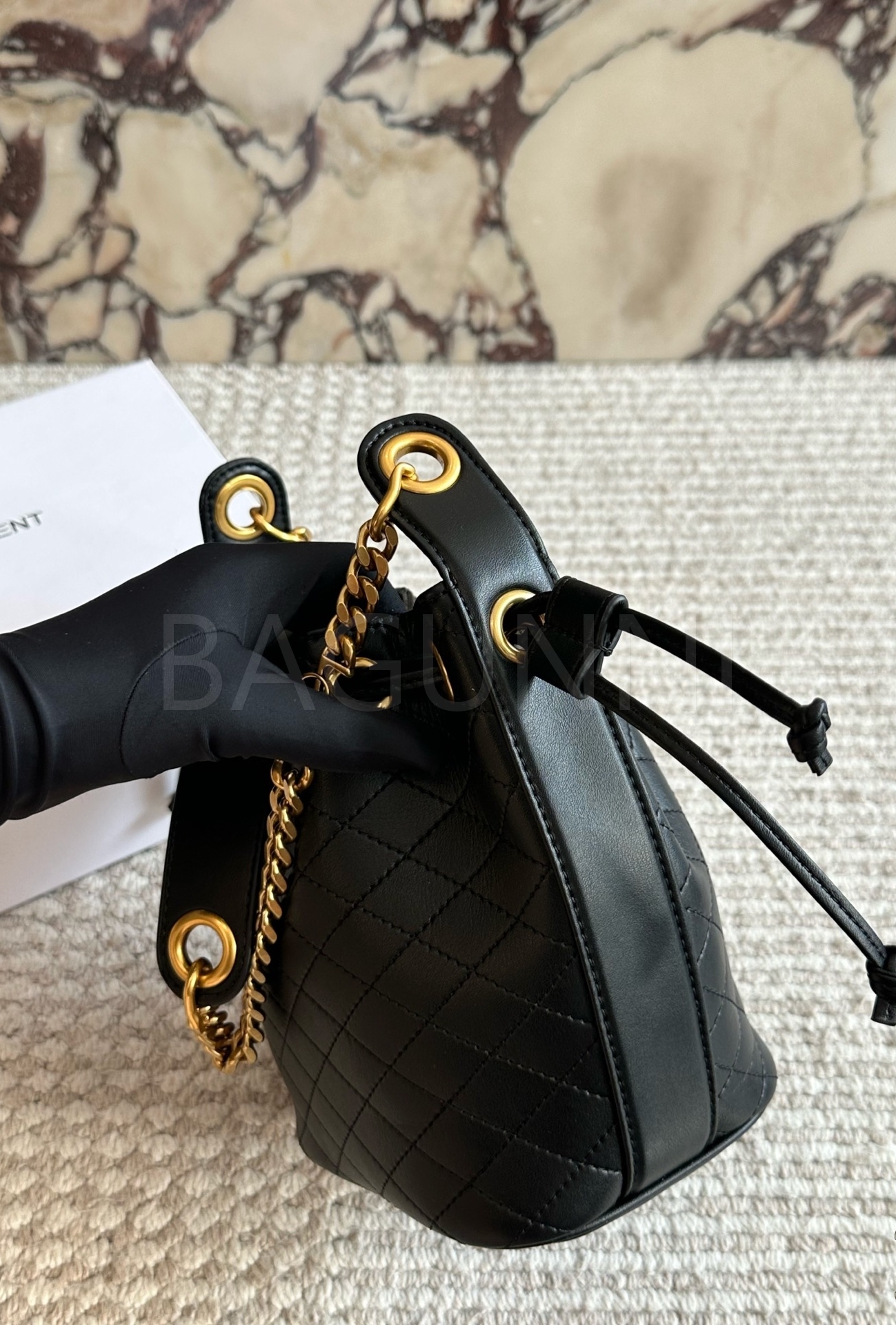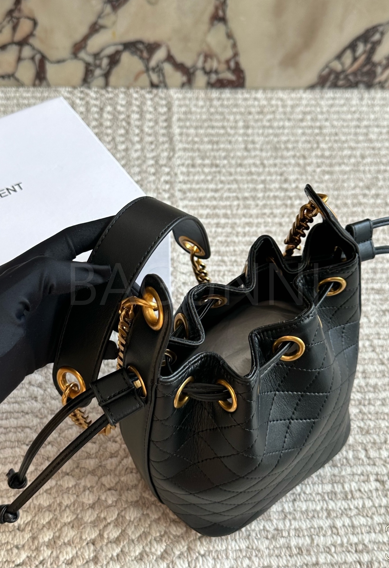 YSL 로고 버킷백입니다. 가죽 특유의 질감이 자연스럽게 살아 있으며 블랙 톤이 어우러져 브랜드 특유의 분위기를 편하게 즐기기 좋습니다.
