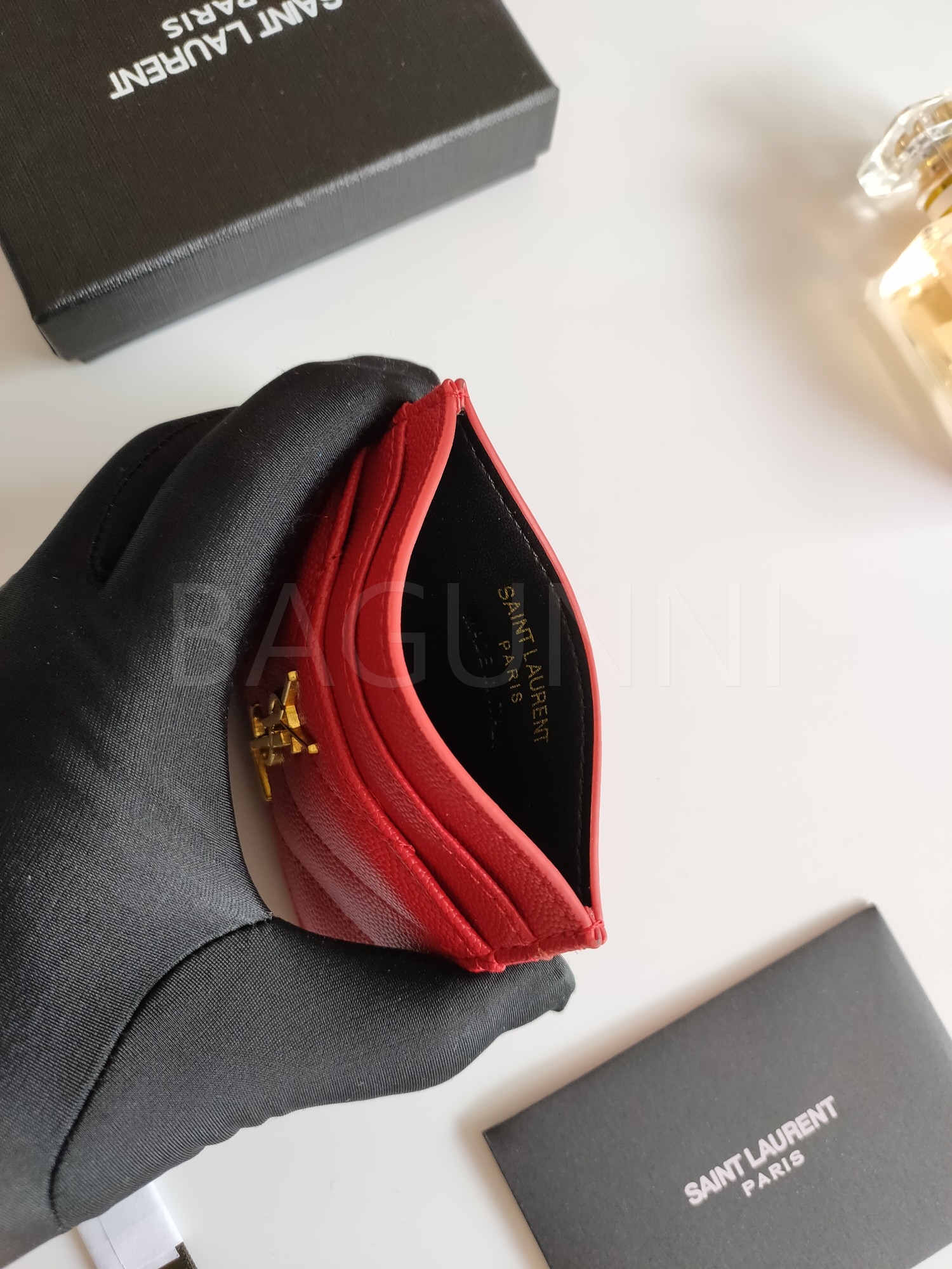카프스킨의 질감이 돋보이는 YSL 플랩 카드지갑입니다.