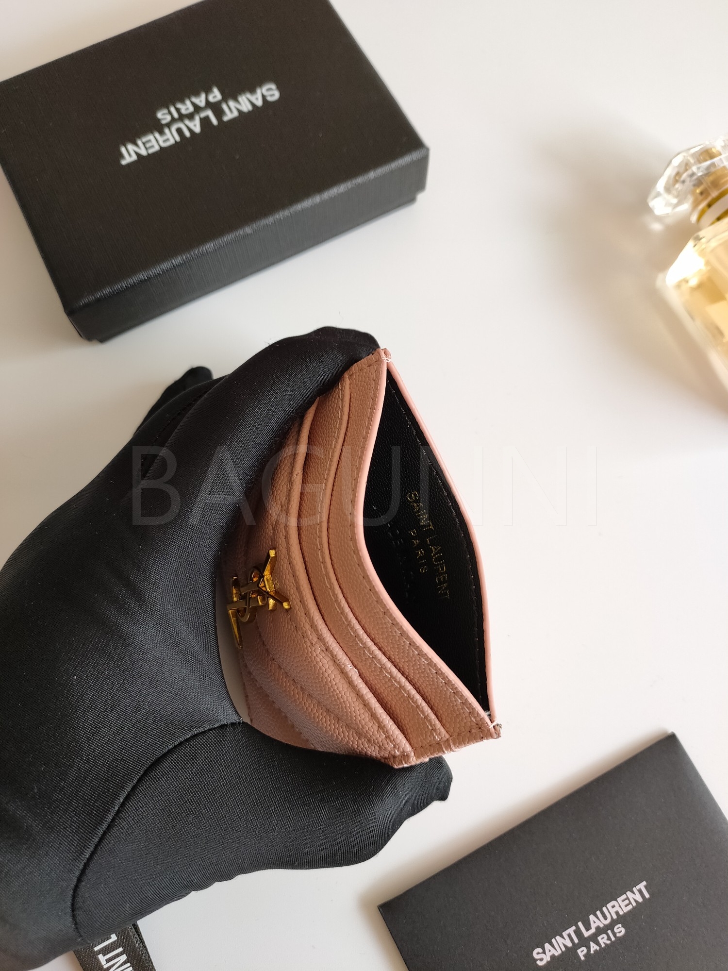 카프스킨의 질감이 돋보이는 YSL 플랩 카드지갑입니다.