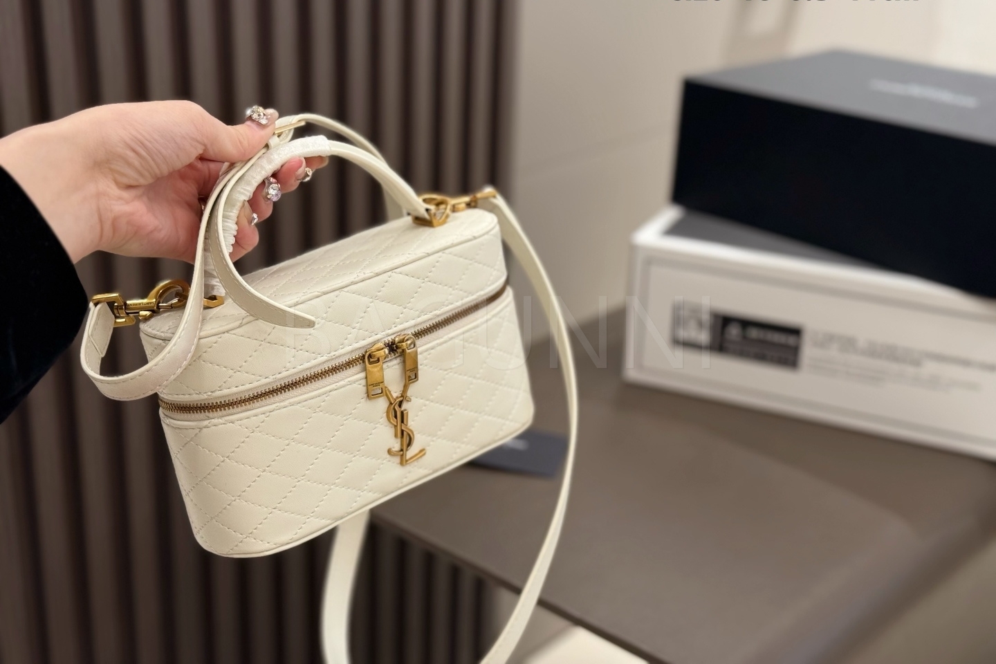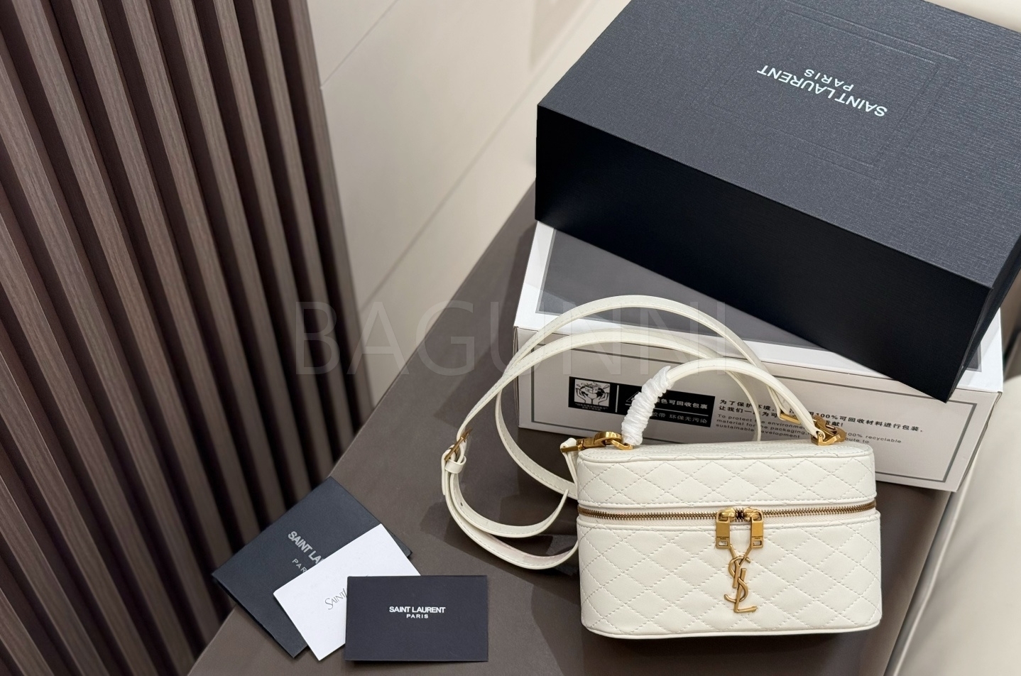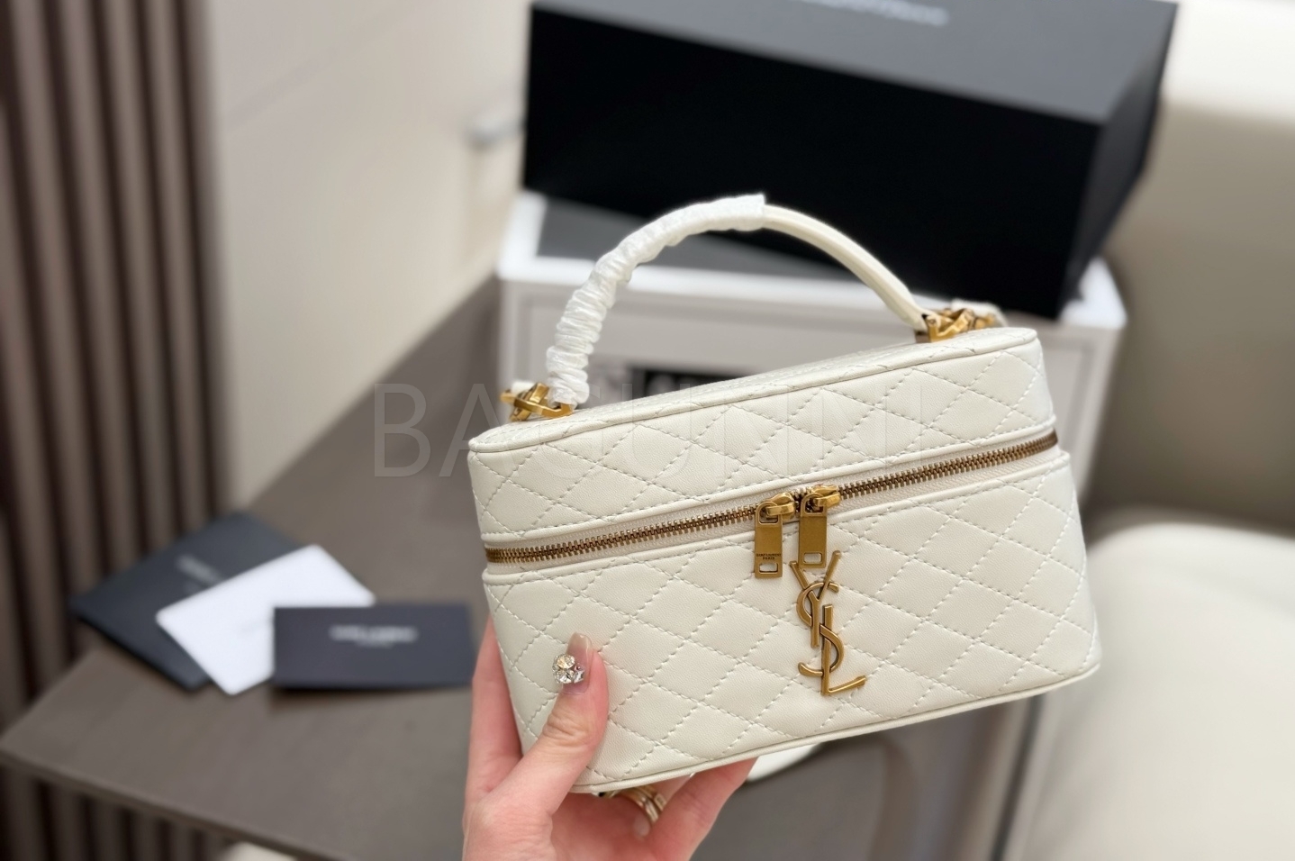 YSL 개비 바니티백입니다. 램스킨 특유의 질감이 자연스럽게 살아 있으며 화이트, 골드 톤이 어우러져 브랜드 특유의 분위기를 편하게 즐기기 좋습니다.